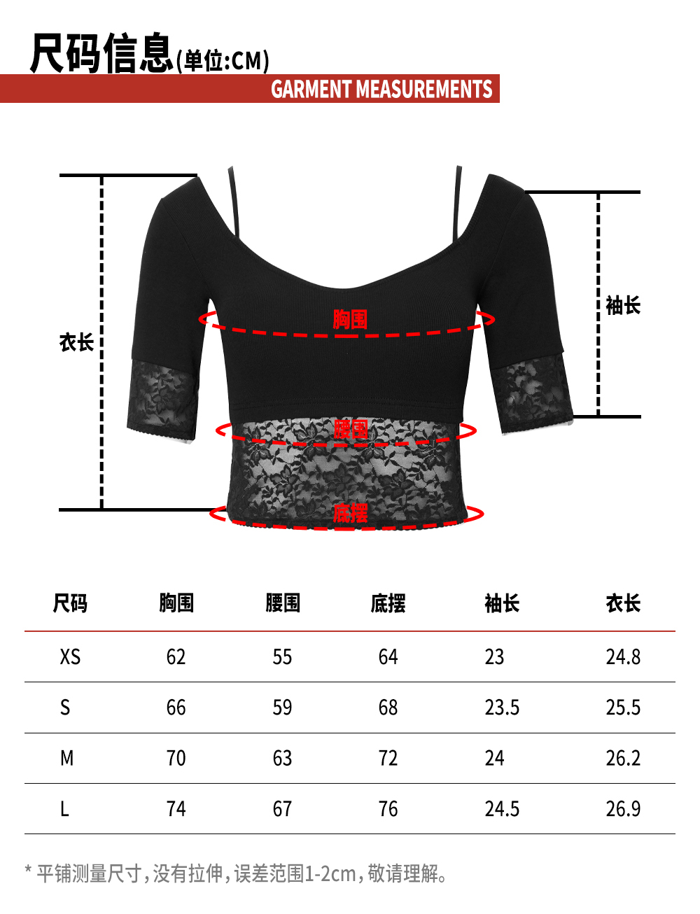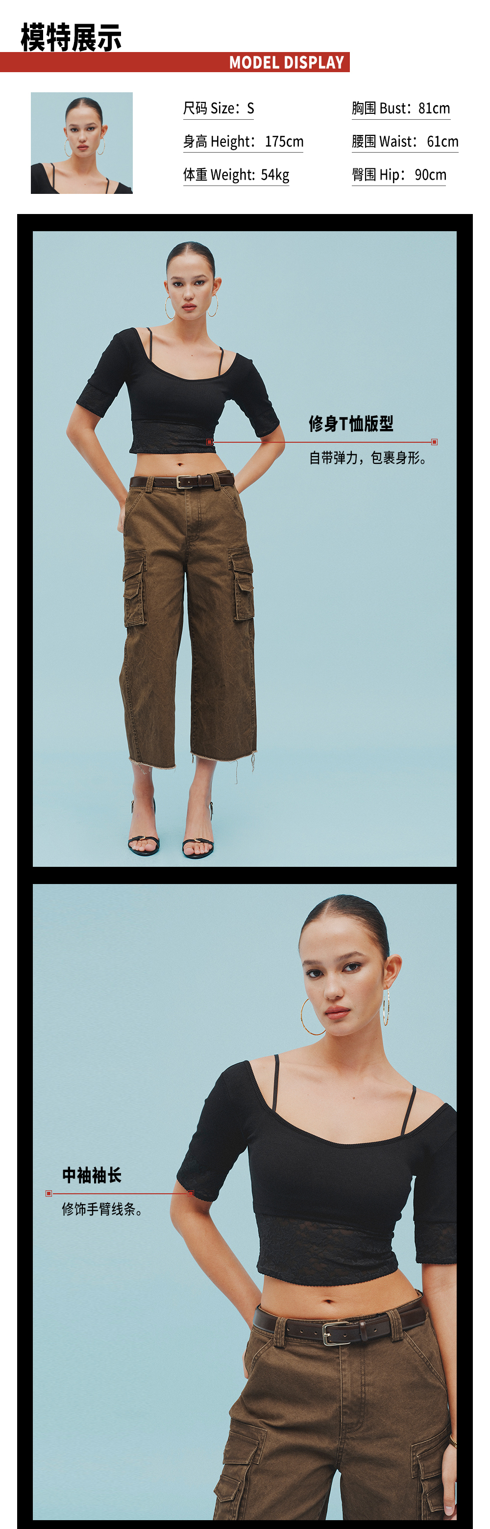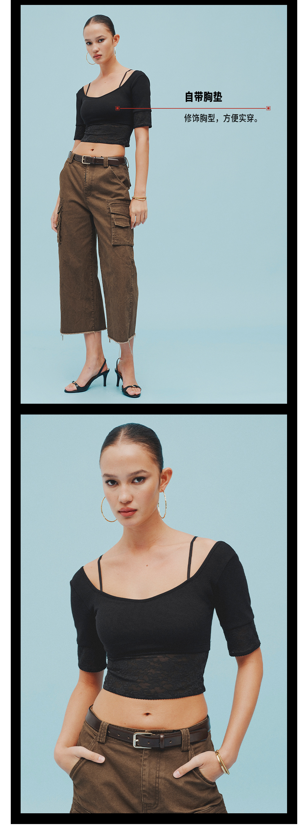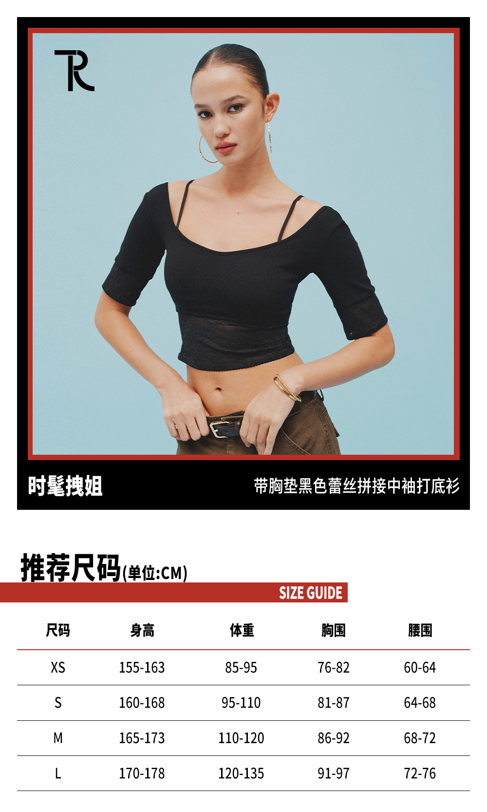 TR她热 时髦拽姐 黑色蕾丝拼接分割带胸垫显瘦修身露背中袖打底衫上衣