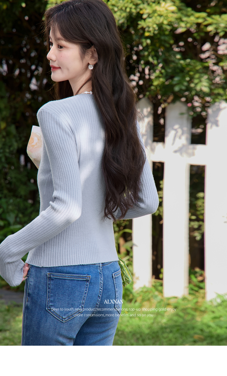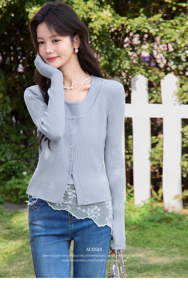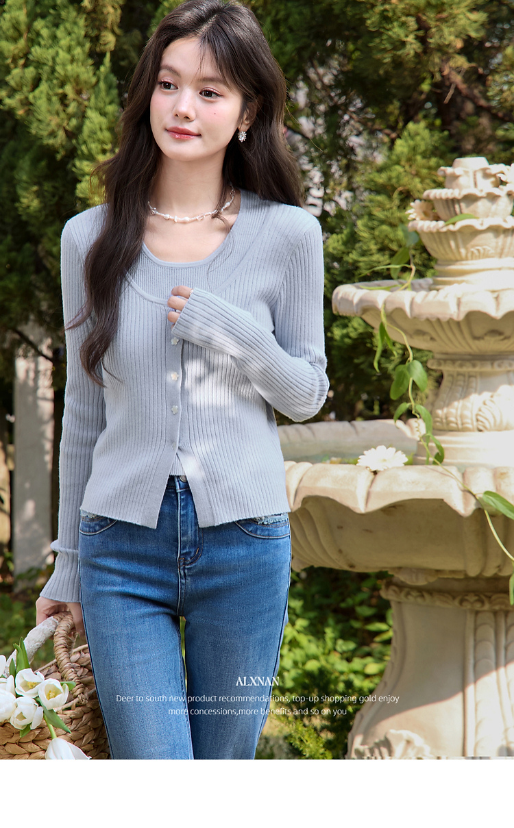 鹿向南「花开香气」浅蓝色假两件设计感针织衫女春季显瘦长袖上衣