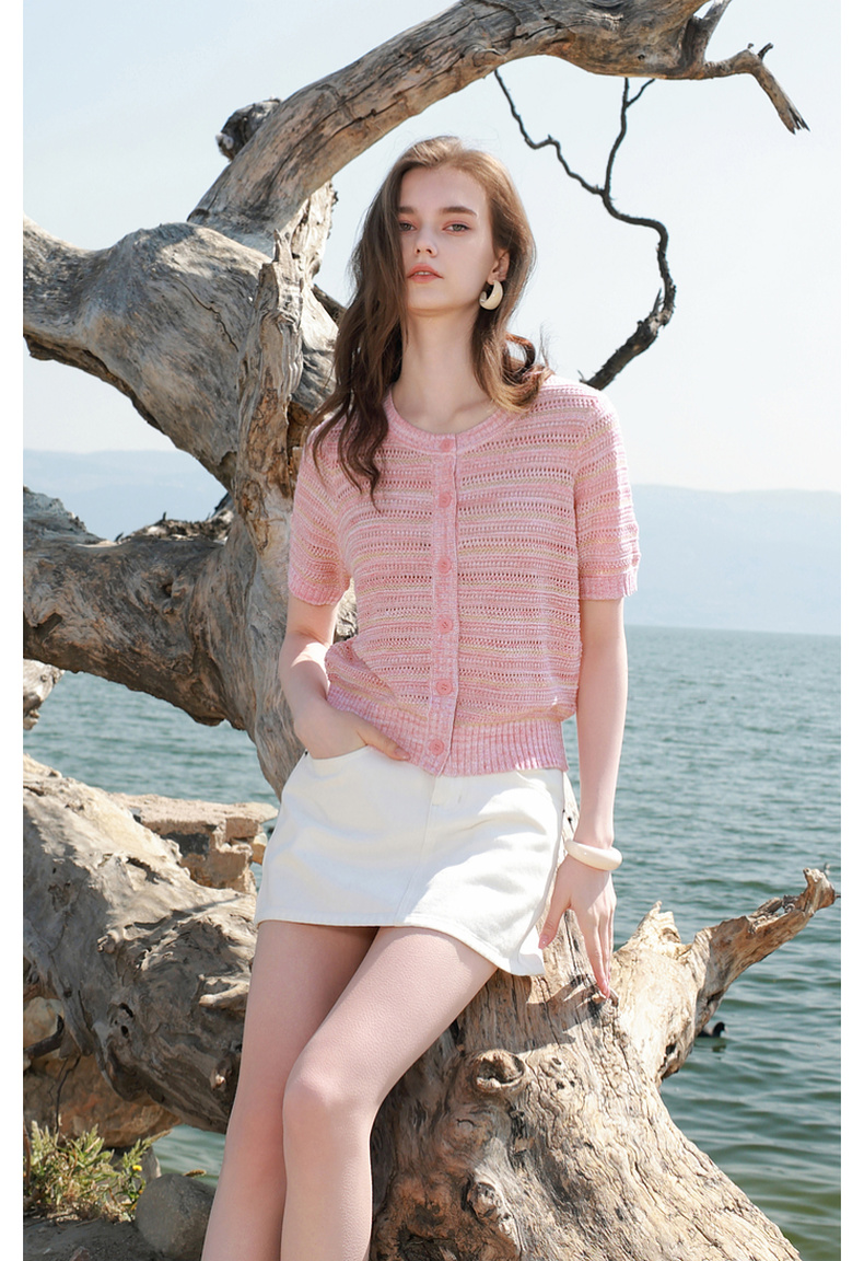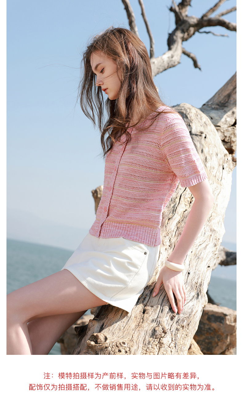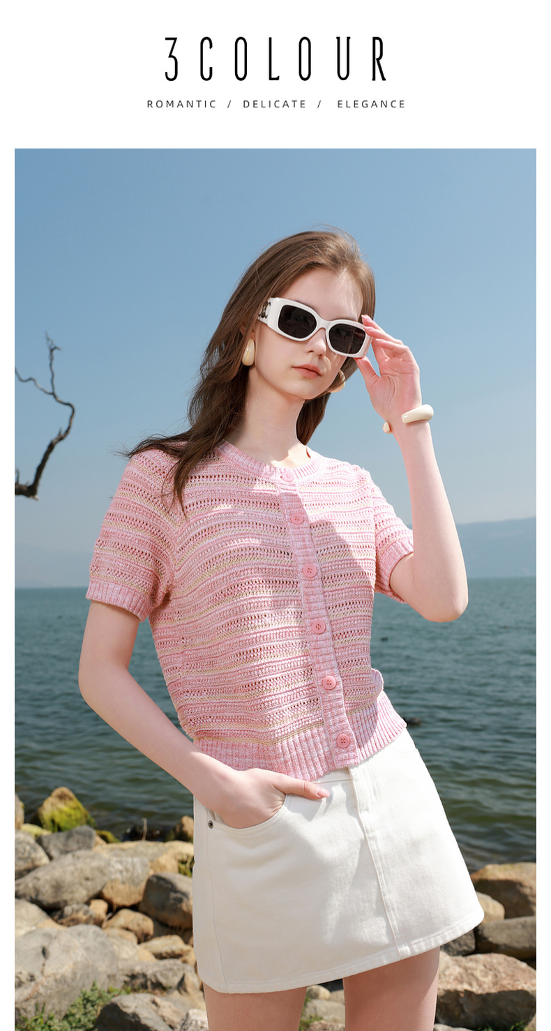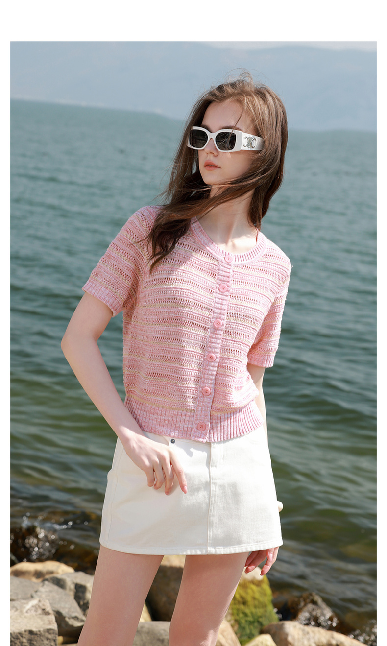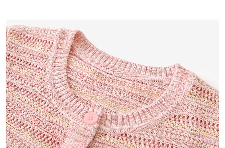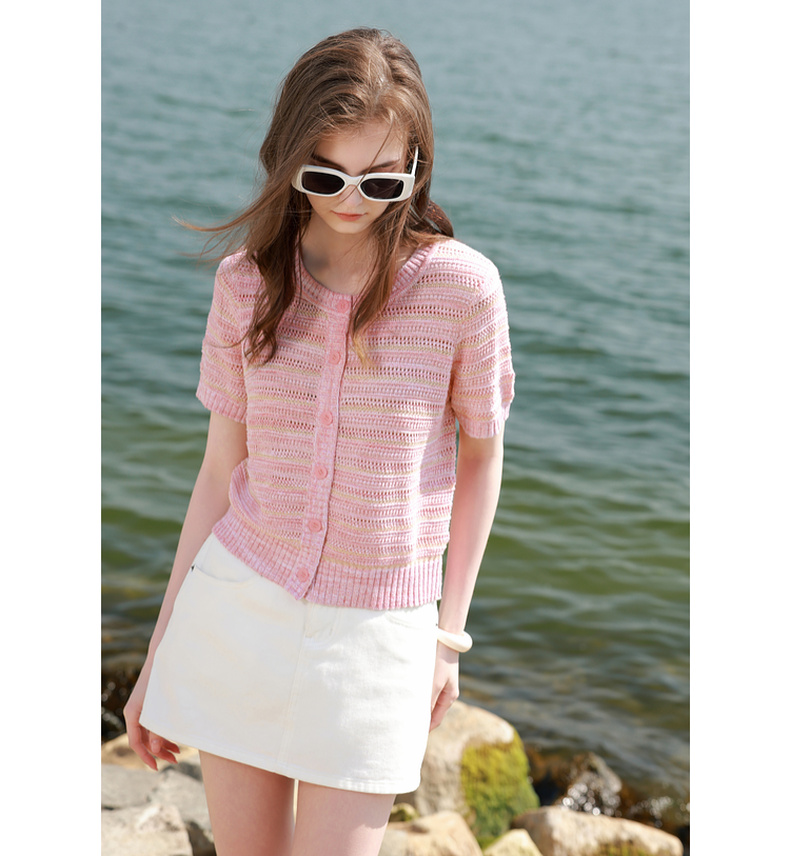 三彩2025夏季新款条纹针织衫镂空肌理感短袖毛衫多巴胺开衫M