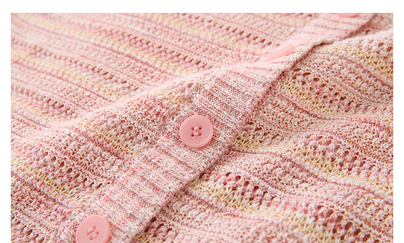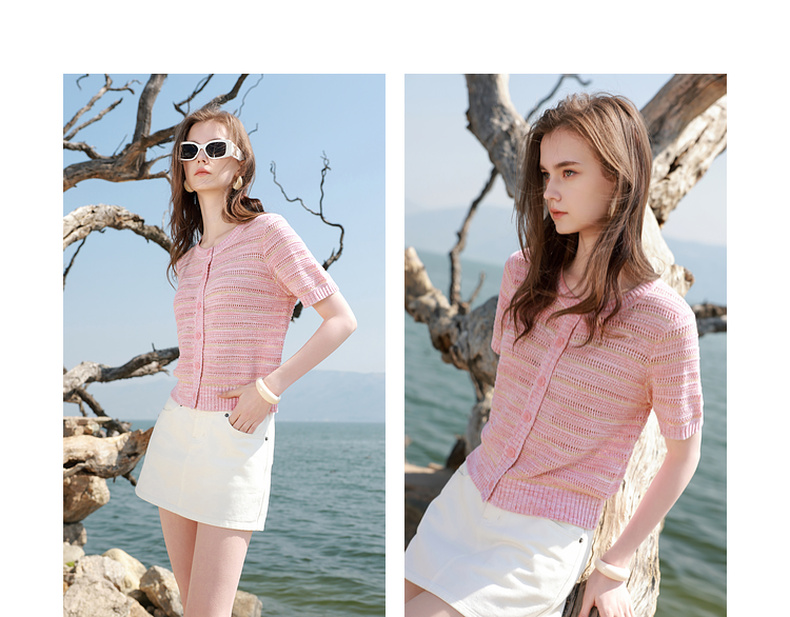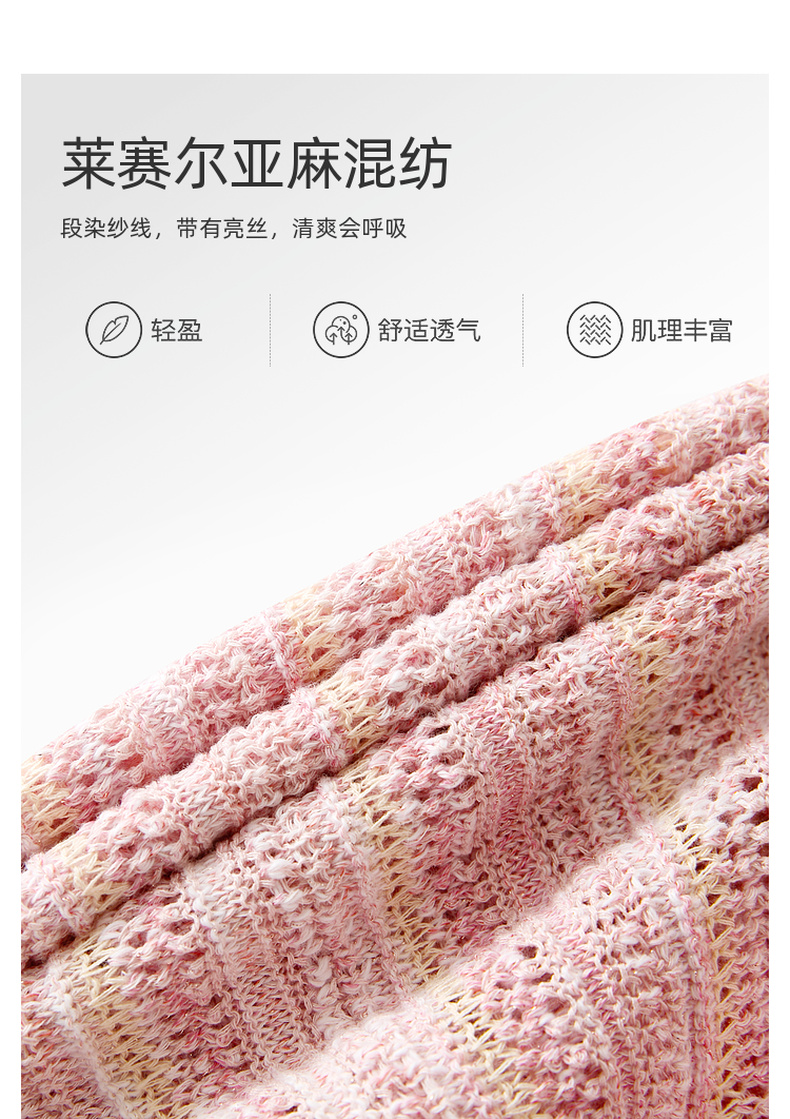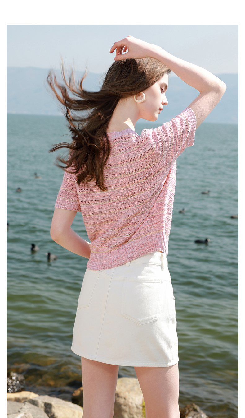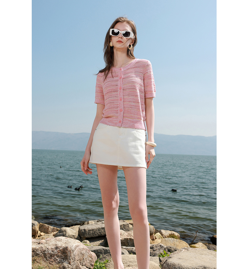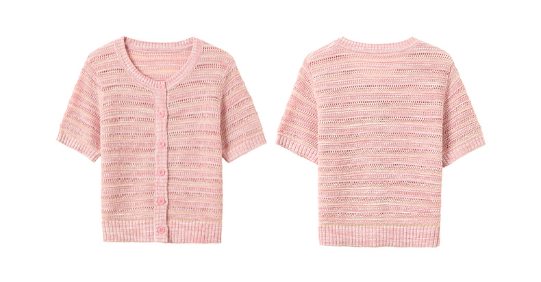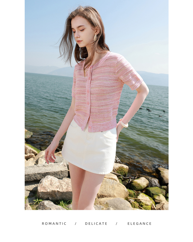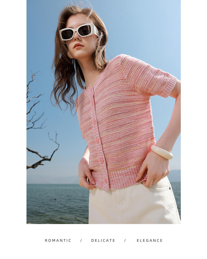三彩2025夏季新款条纹针织衫镂空肌理感短袖毛衫多巴胺开衫M