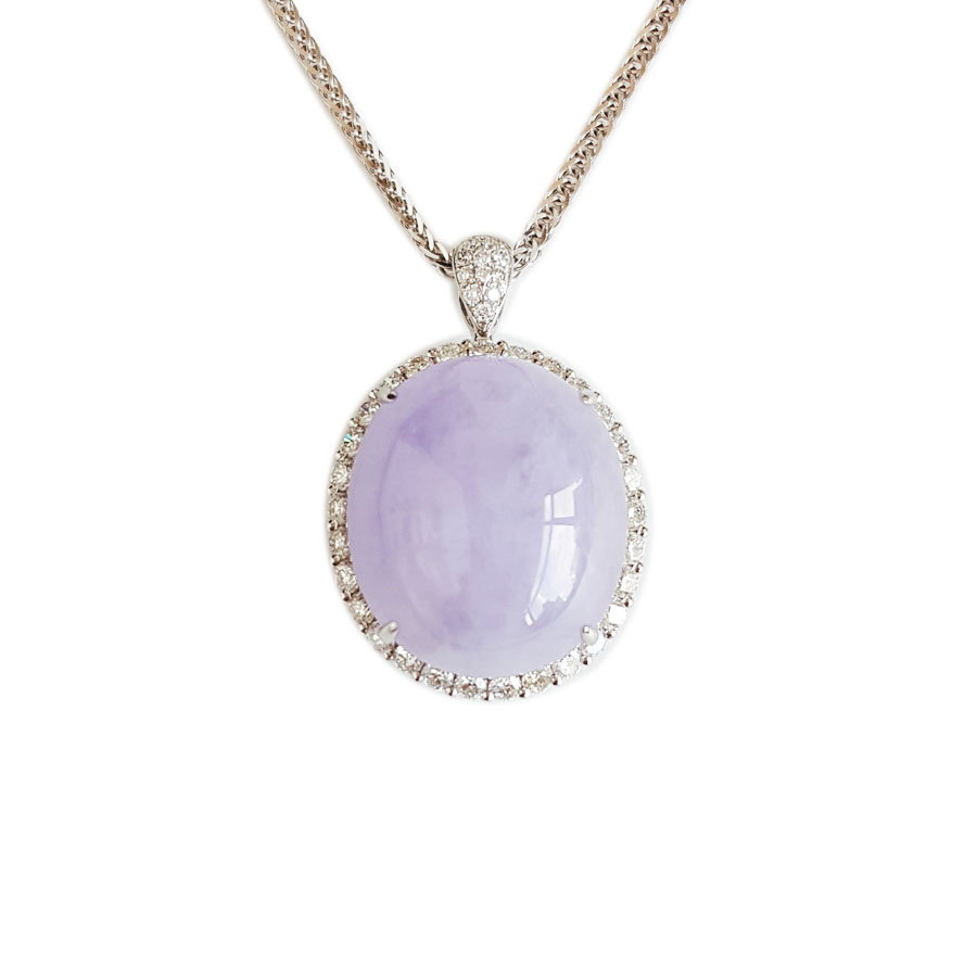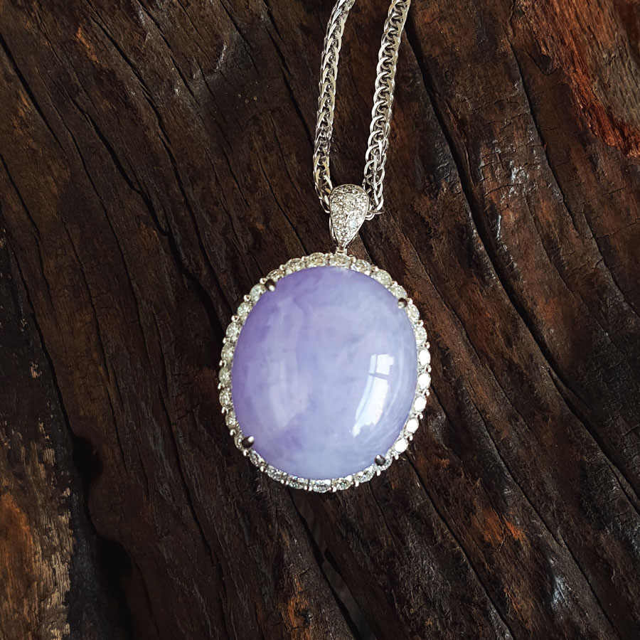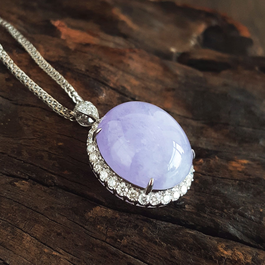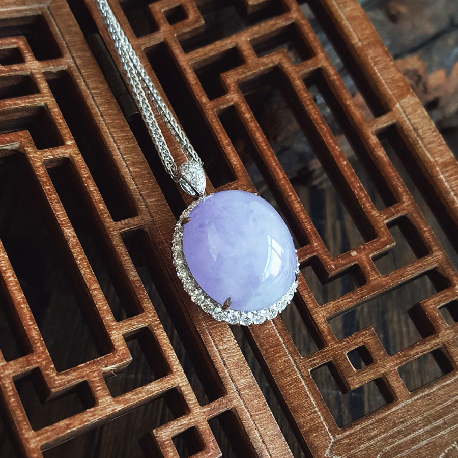名称 | AU750收藏级白金豪镶钻镶天然细腻糯冰种浓紫紫罗兰蛋面翡翠戒指项链两用款 |