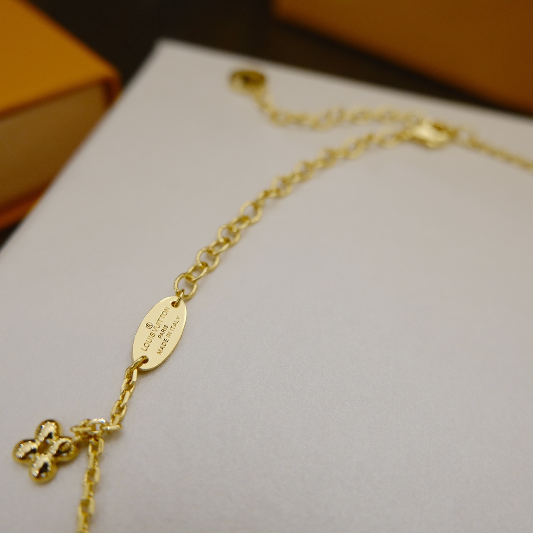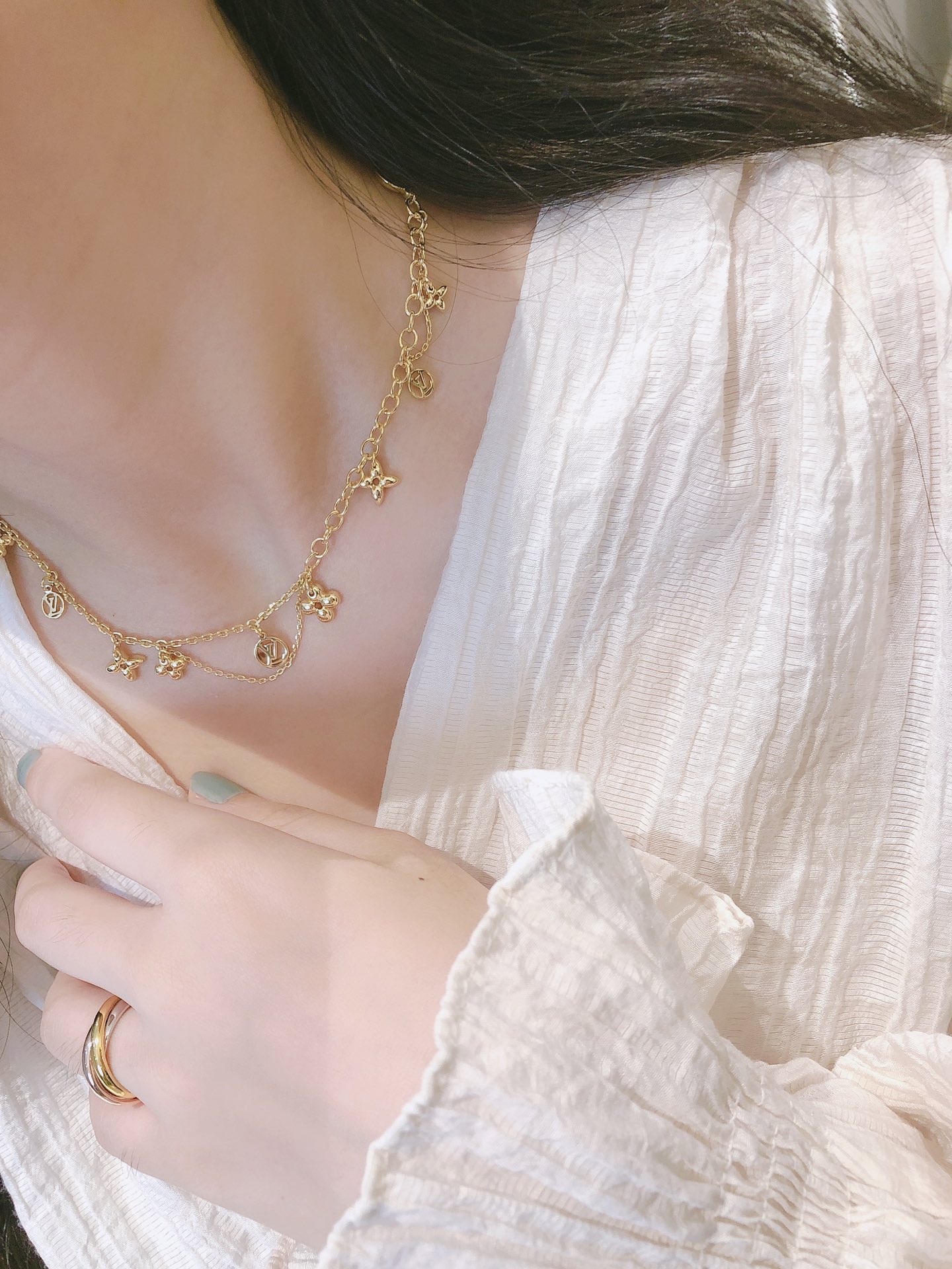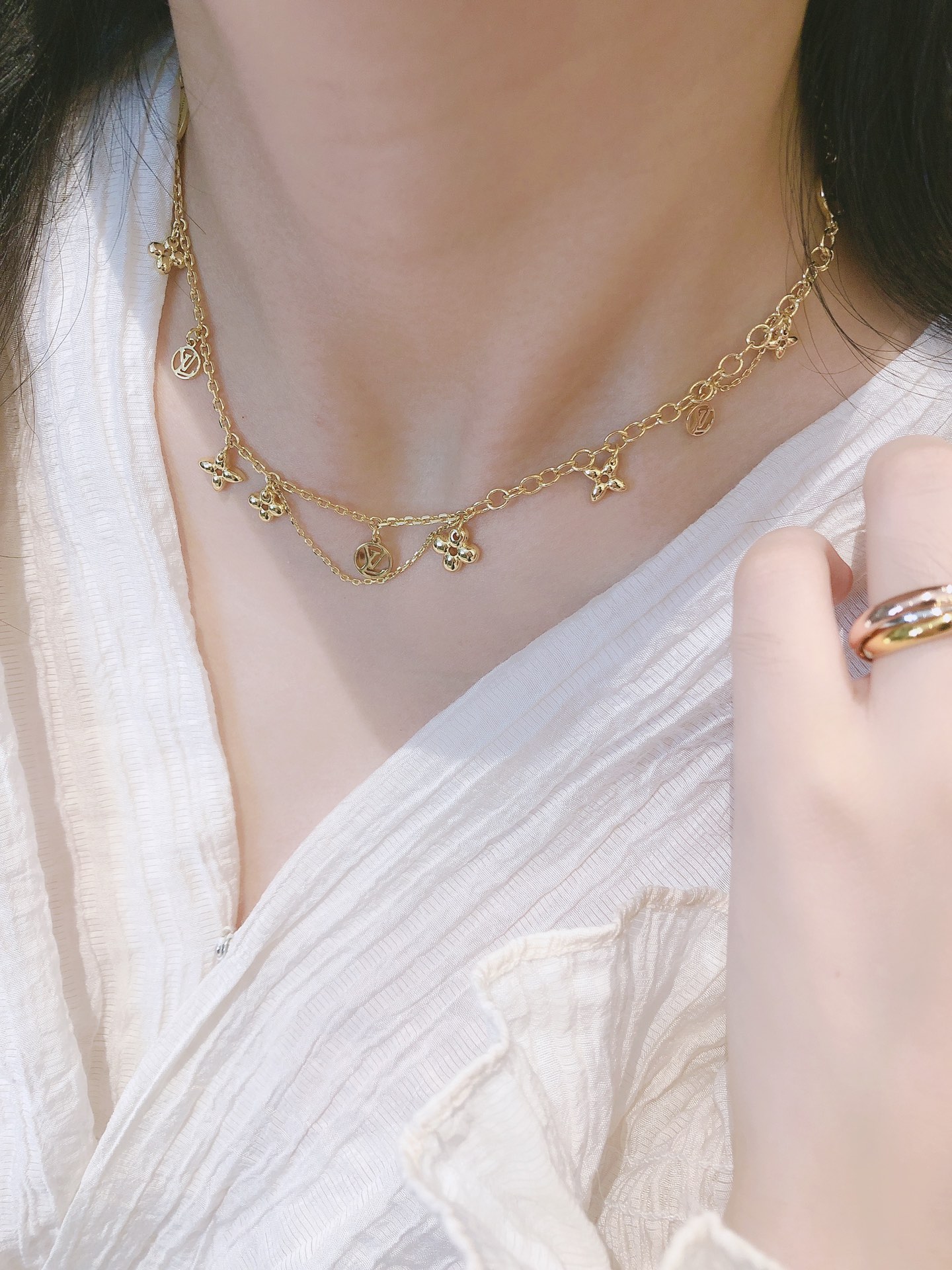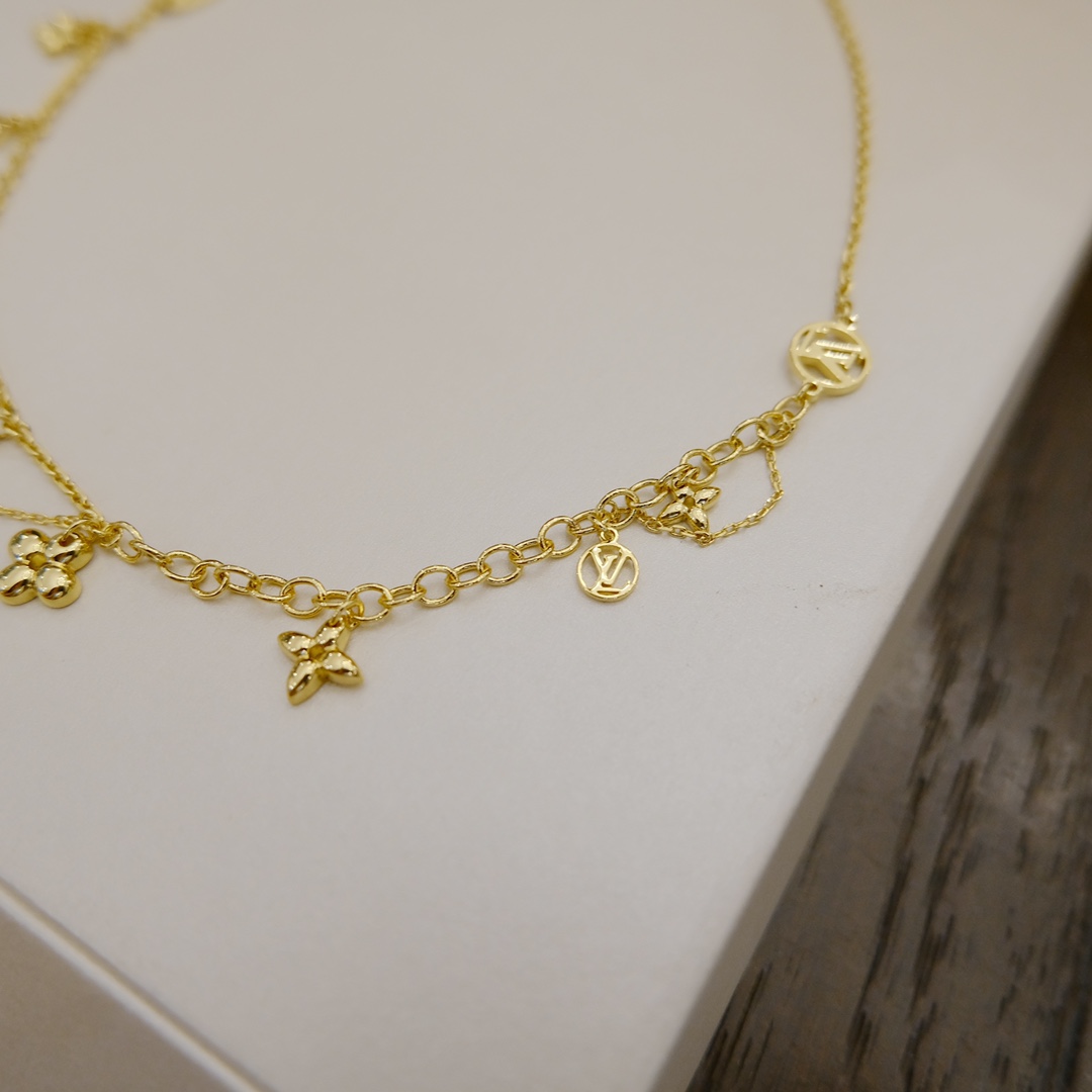 Blooming系列项链,外层厚镀18K真金表层!整条手链有精美小吊坠,一眼种草,瞬间被俘获!此款风格优美的手链将成为时尚而优雅的腕间配饰!设计中融入Monogram花卉与圆形lv标志元素,经典而精致,没有钻石的闪耀,一样抵挡不住它的美丽? 每个小吊饰都有优美的弯曲曲面,立体感和质感都非常棒,戴起来刚刚好的温柔,一点不浮夸!金色显白
