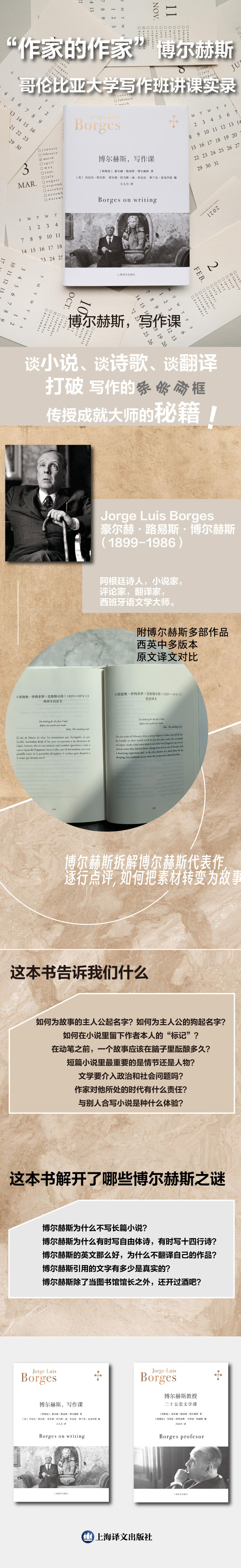 《博尔赫斯,写作课》以讲课的录音稿为底稿,为保留原汁原味,未作任何编辑。另附课堂中所举范例的西班牙文原文与英文译文,供对比阅读。