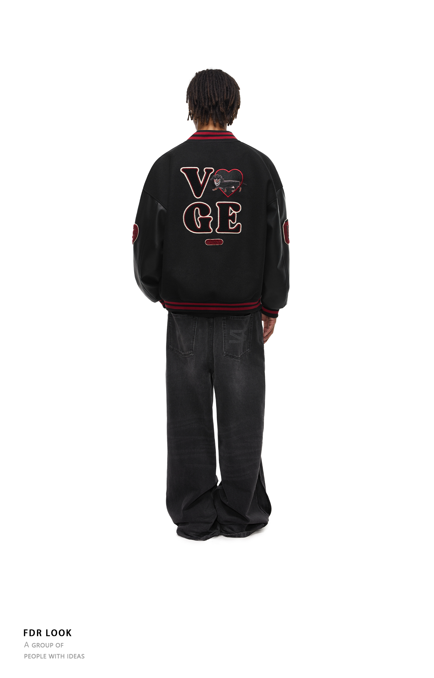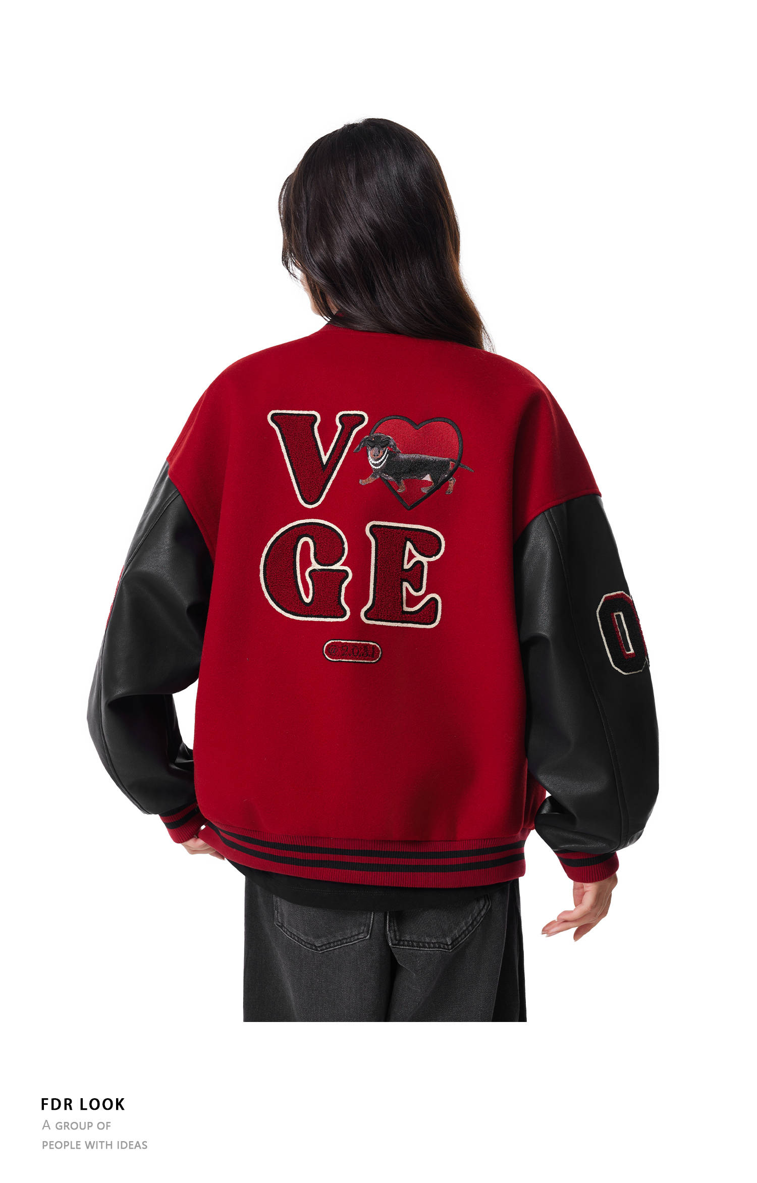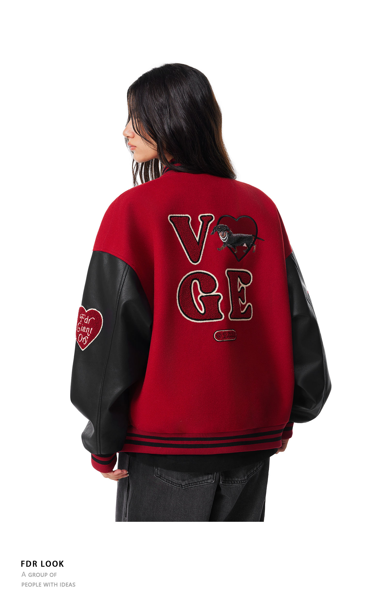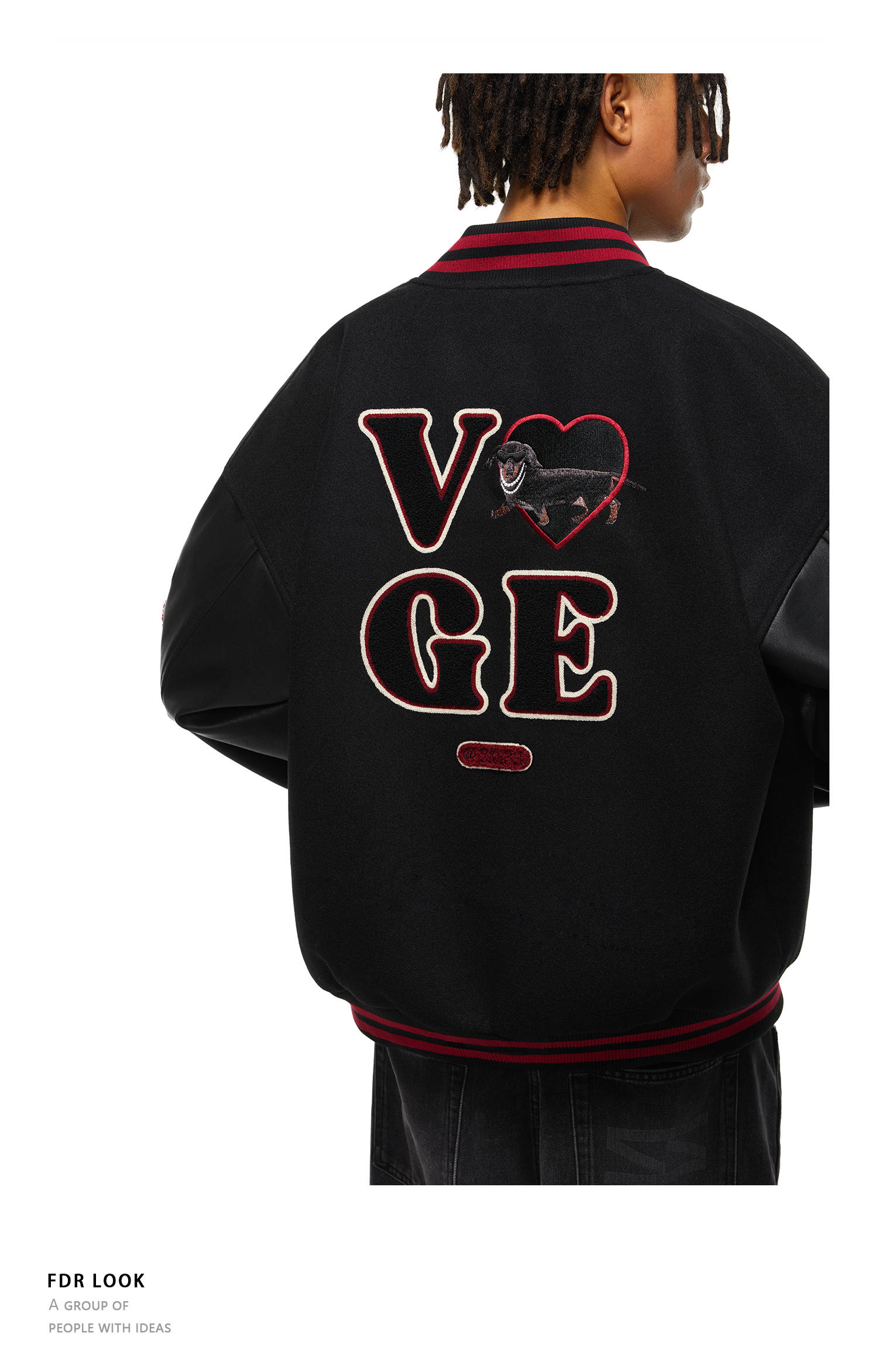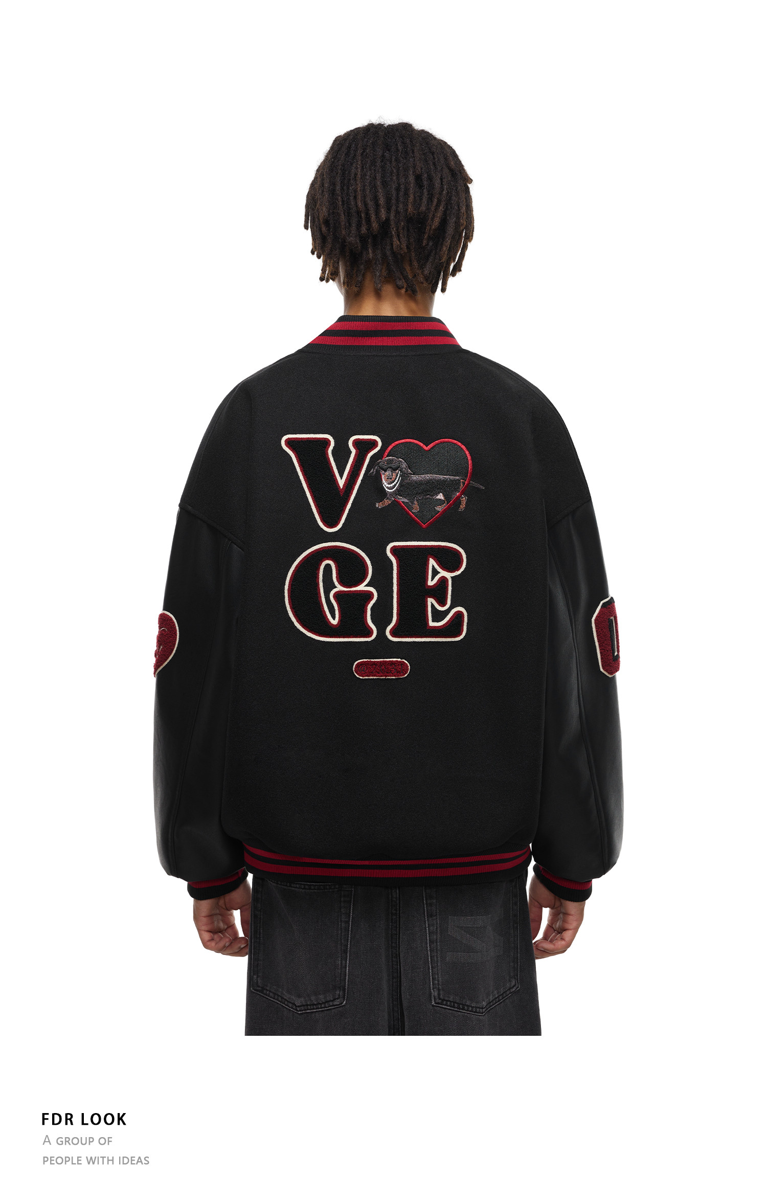 【限时7折】FDR官方店 “我爱狗狗”腊肠狗美式复古爱心皮袖刺绣棒球夹克外套