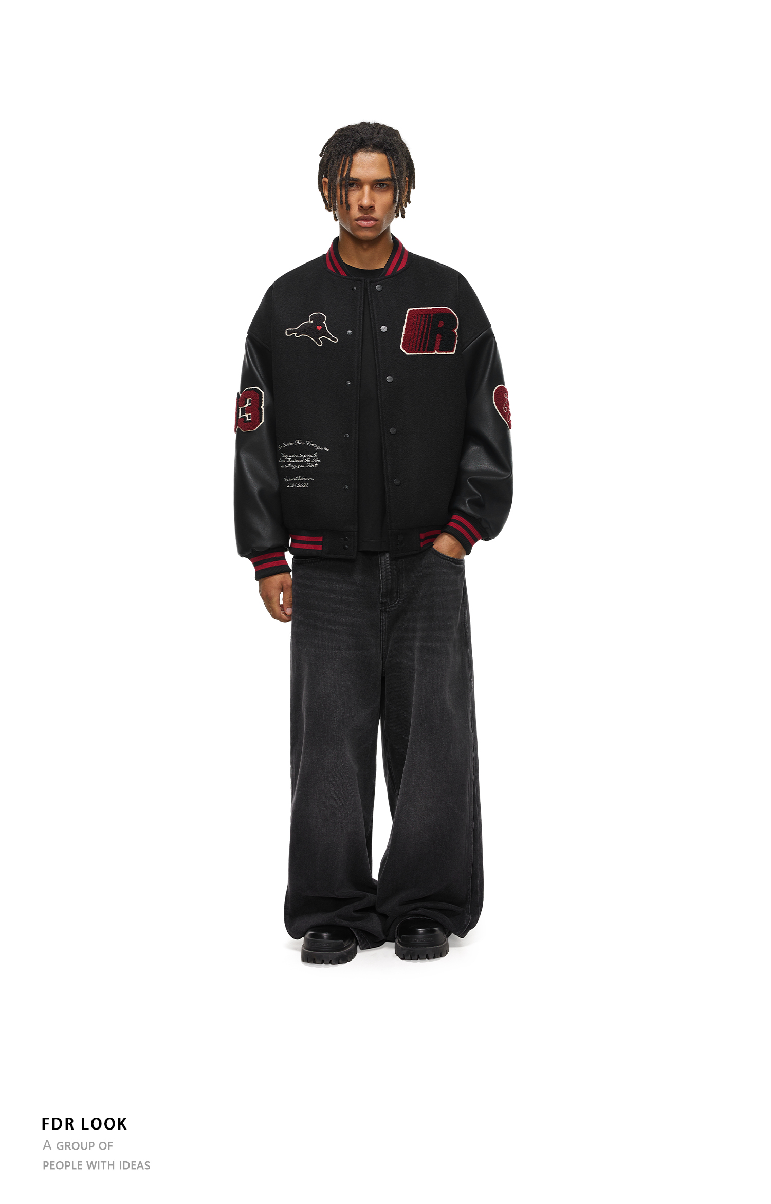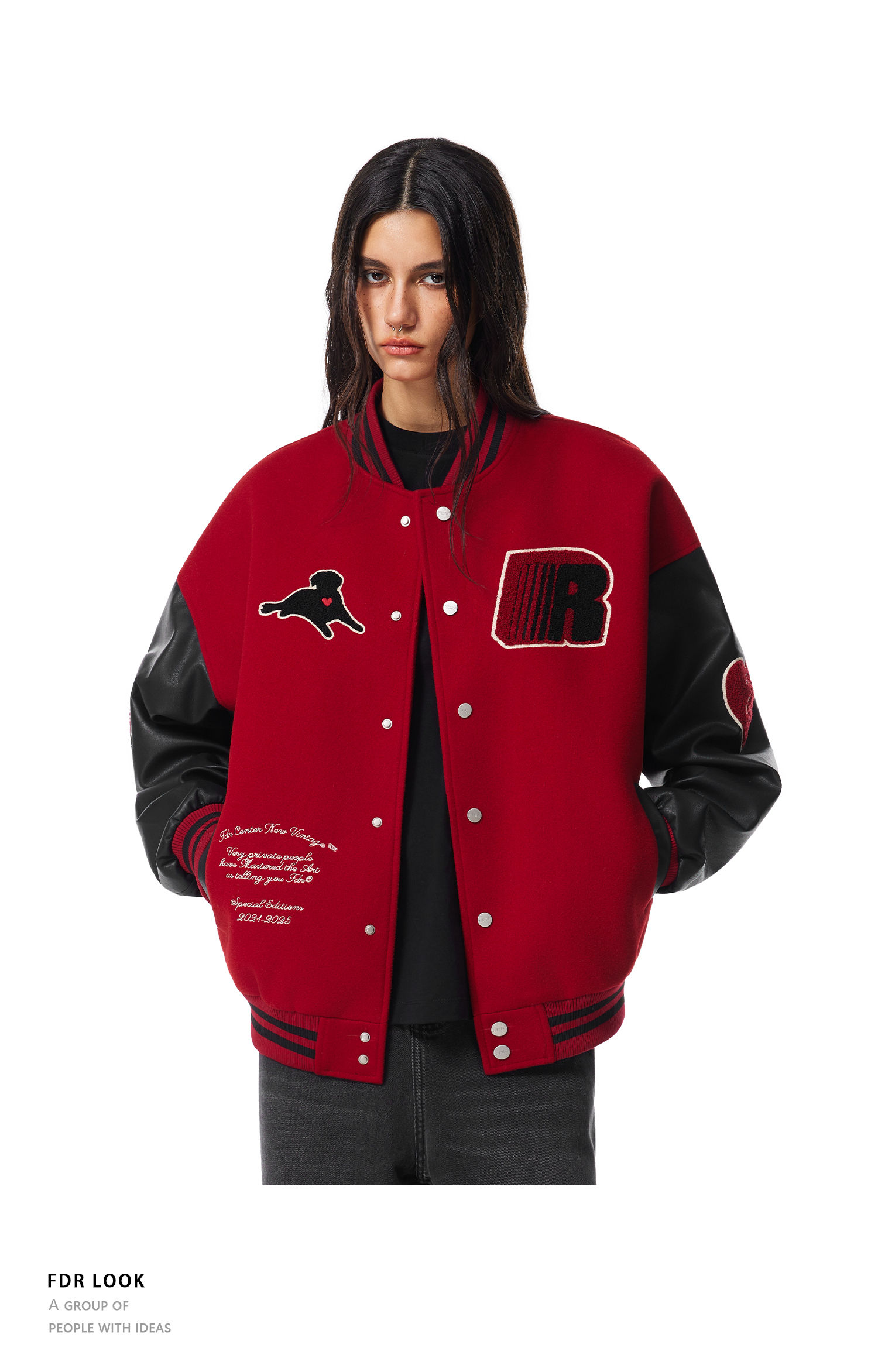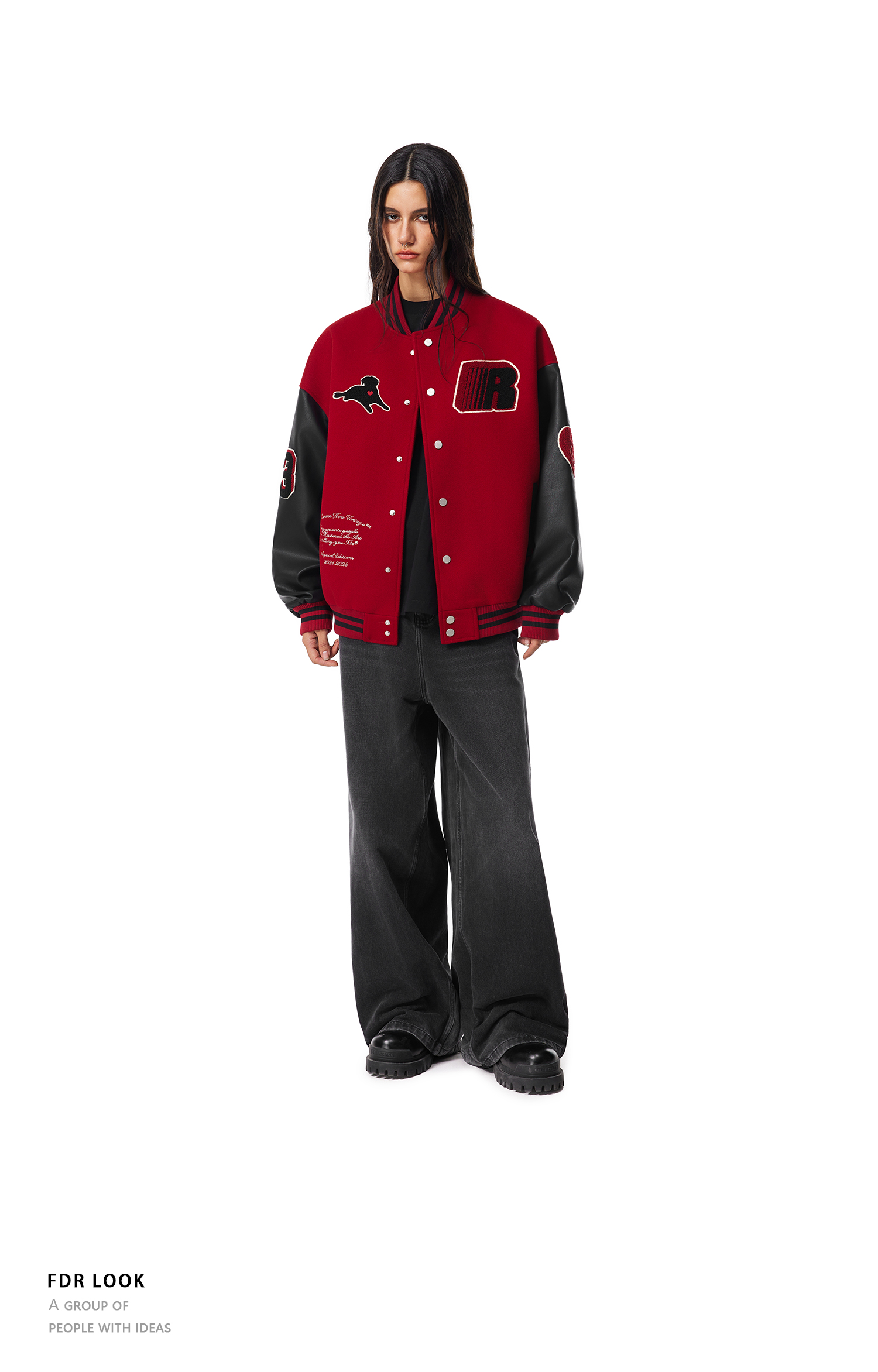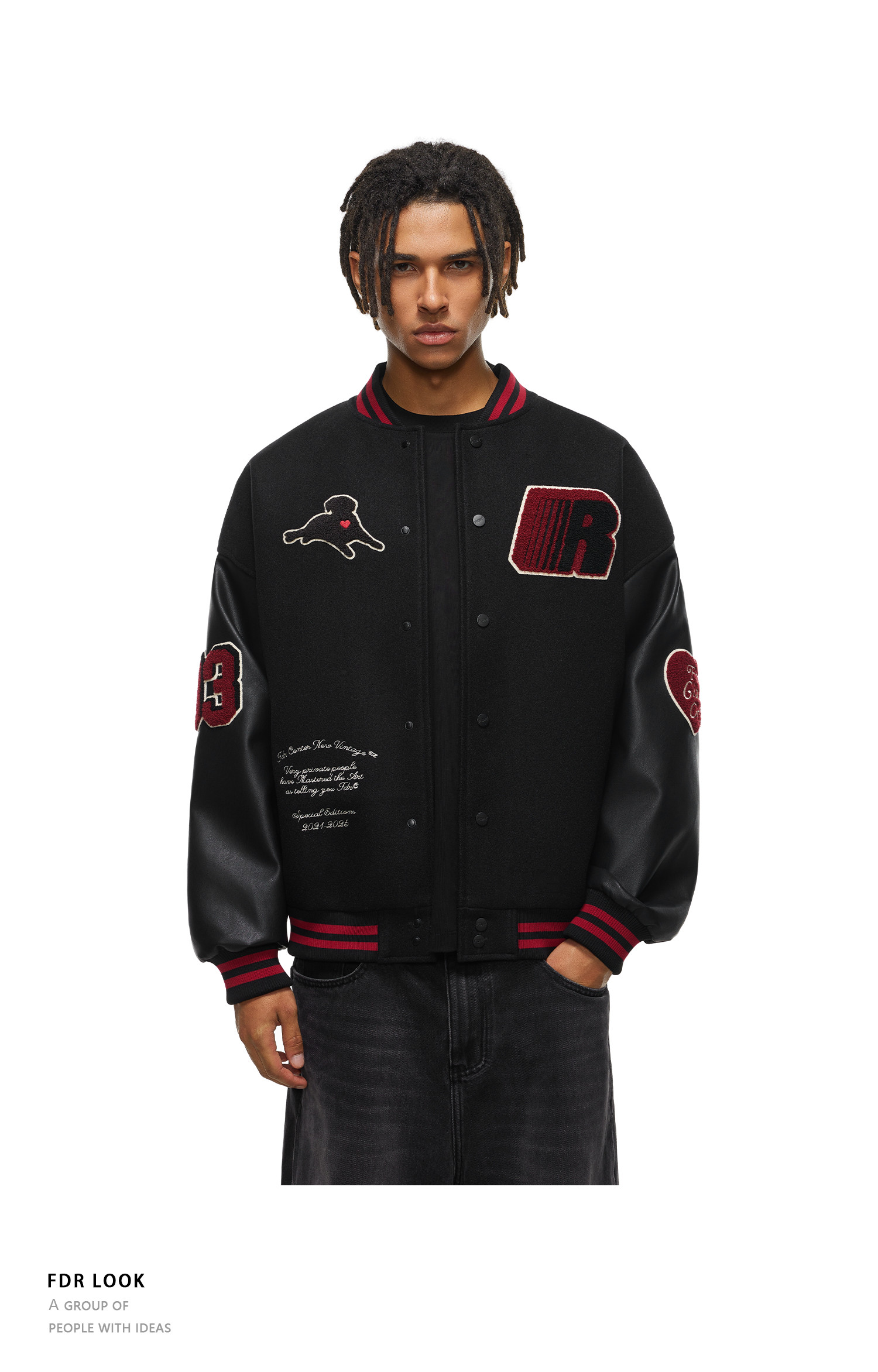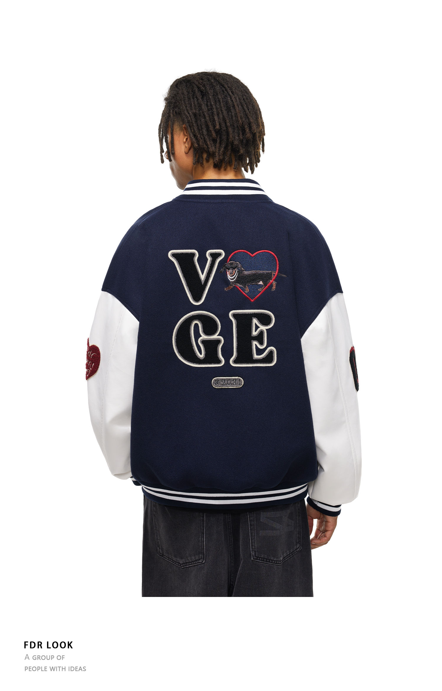 【限时7折】FDR官方店 “我爱狗狗”腊肠狗美式复古爱心皮袖刺绣棒球夹克外套