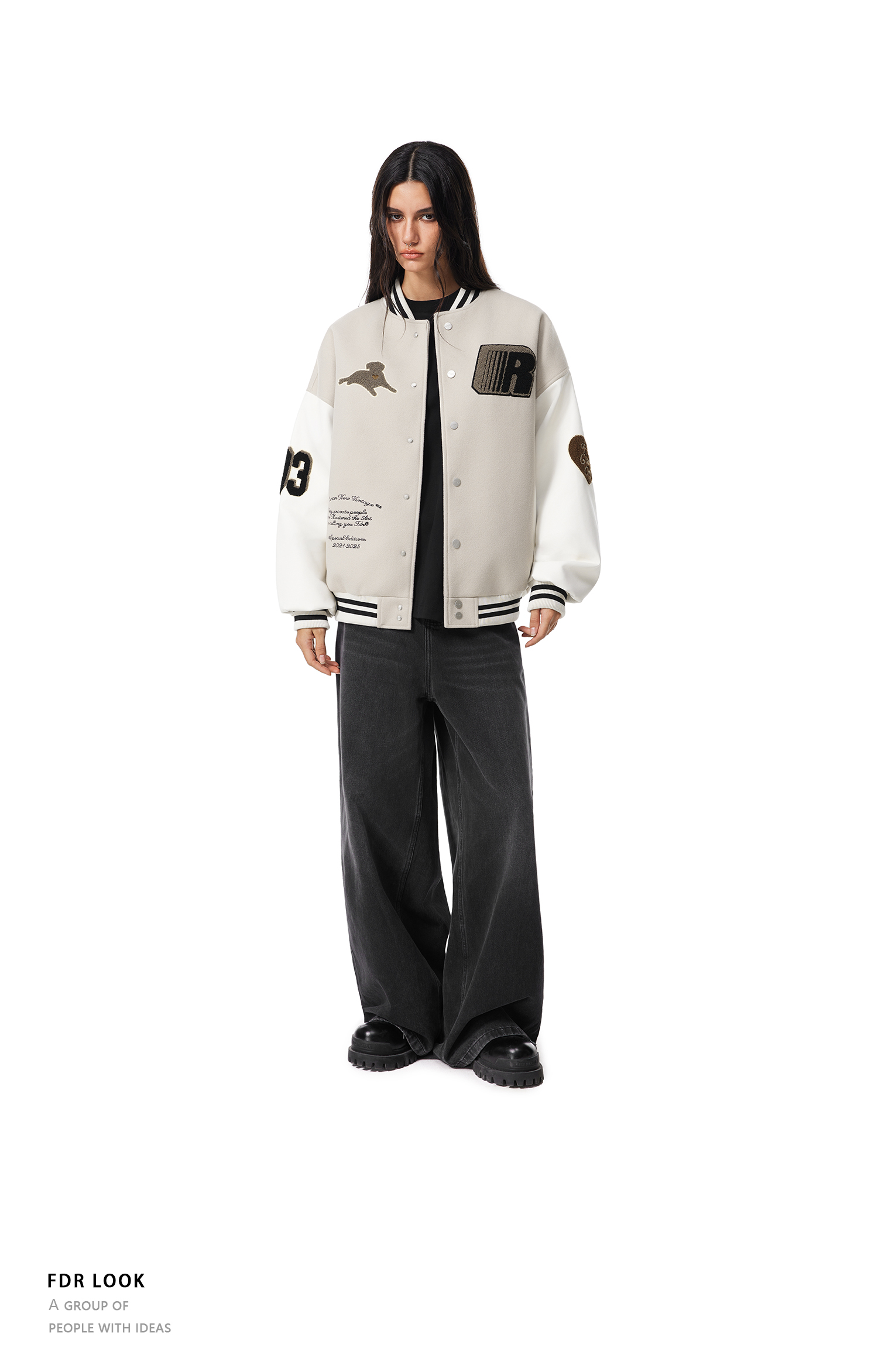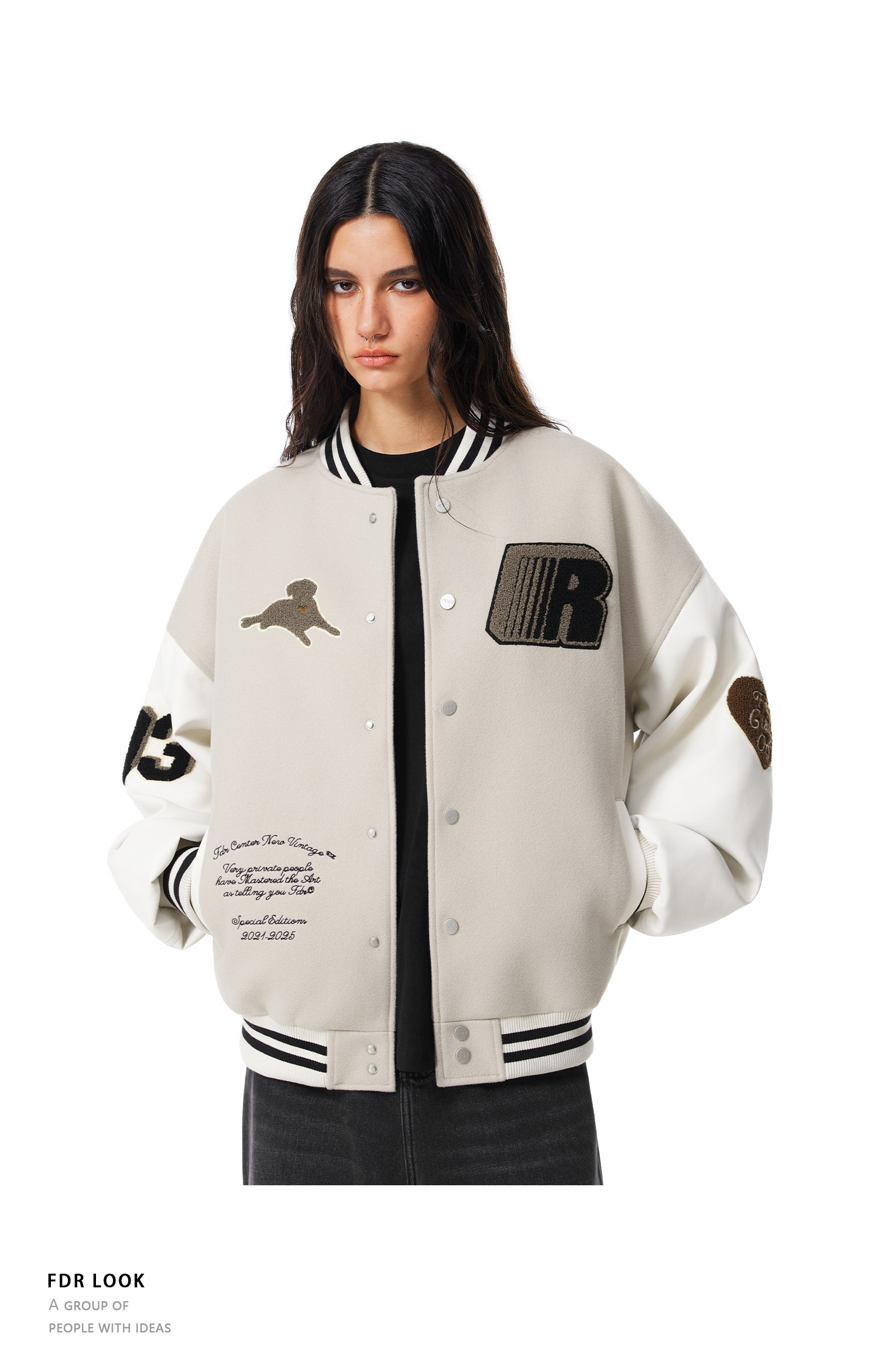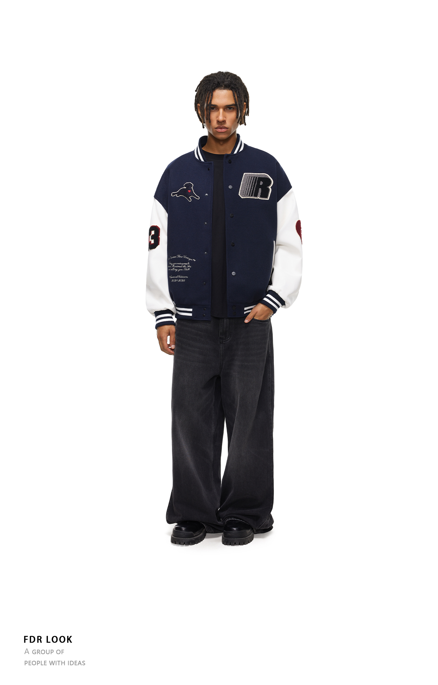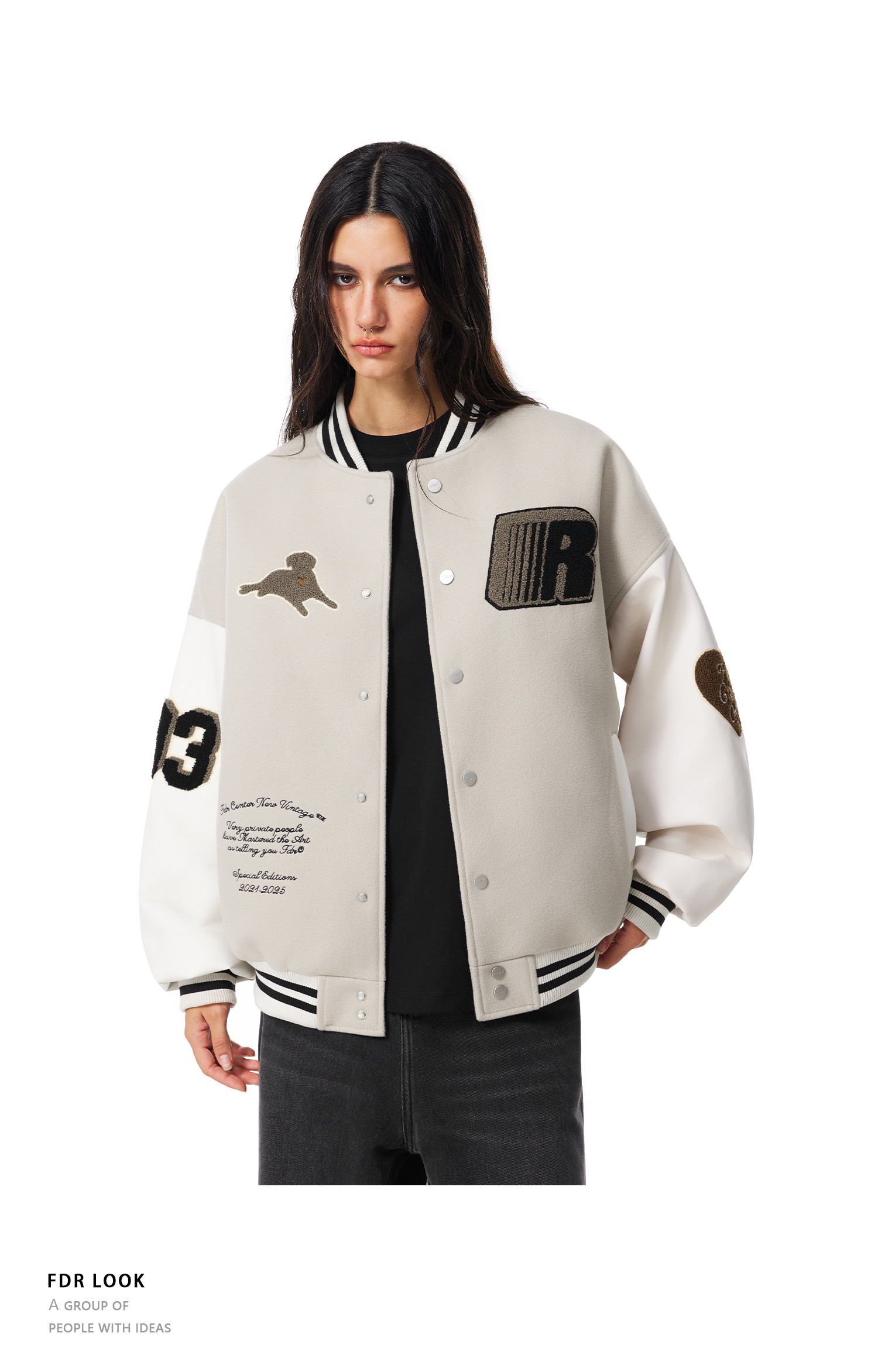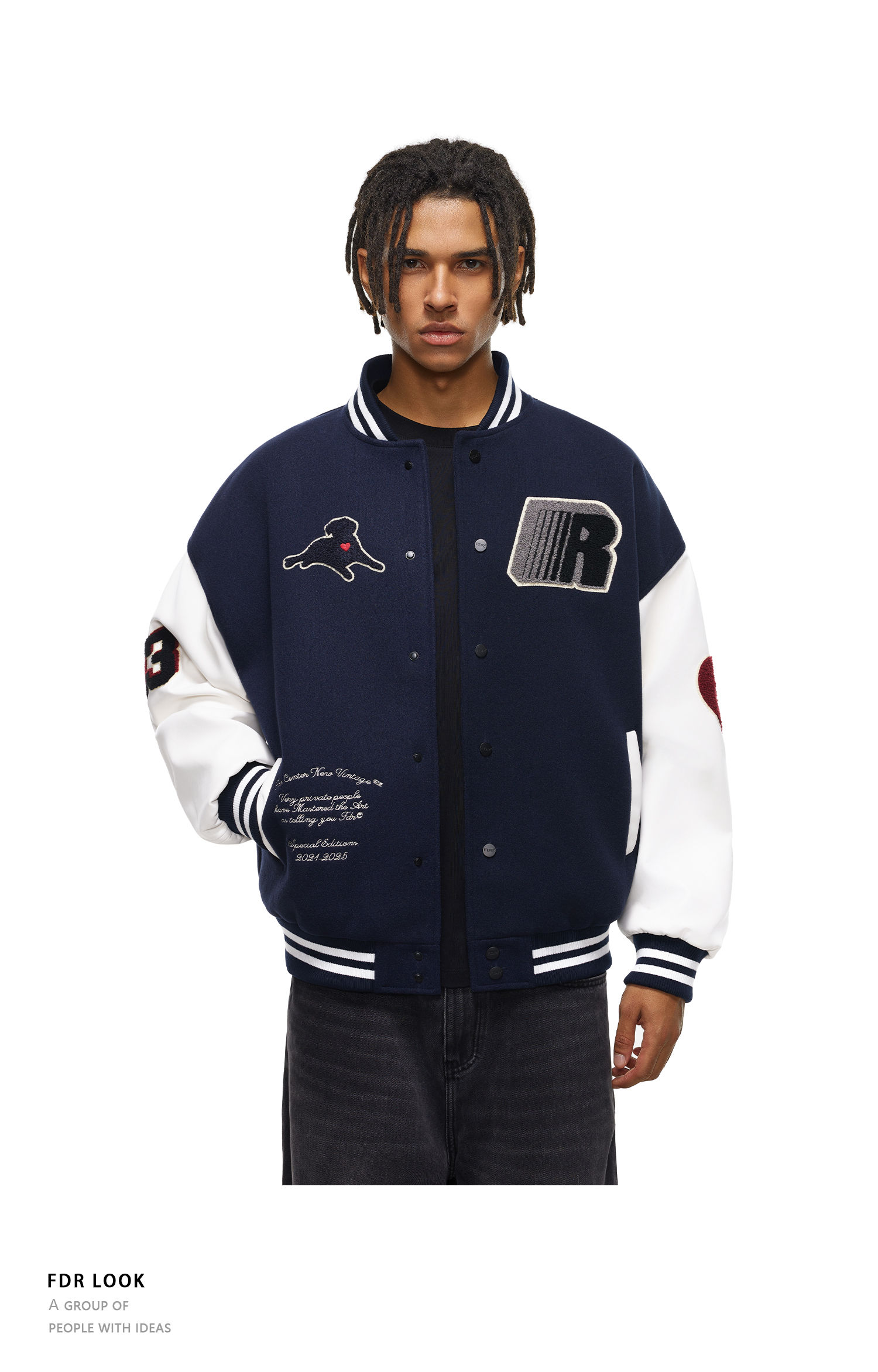 【限时7折】FDR官方店 “我爱狗狗”腊肠狗美式复古爱心皮袖刺绣棒球夹克外套
