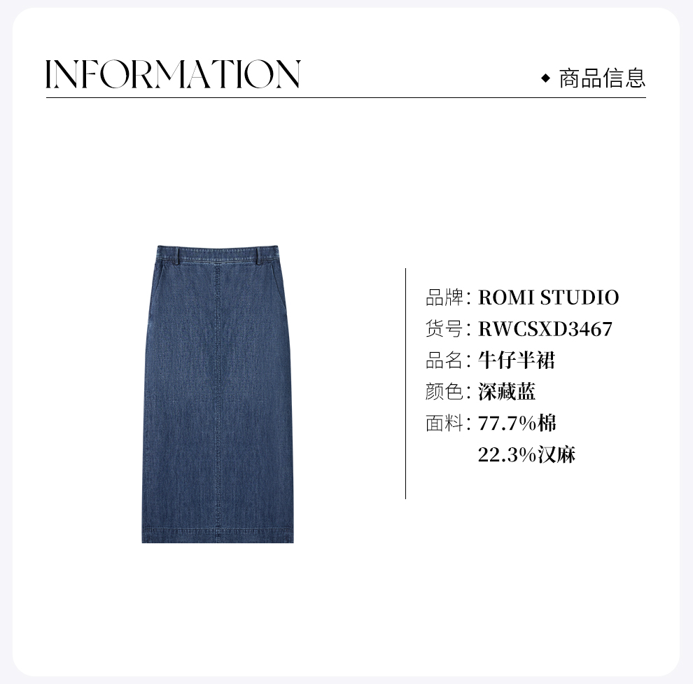 ROMI STUDIO“汉麻牛仔”汉麻棉混纺轻薄后开叉牛仔半裙 RWCSXD3467