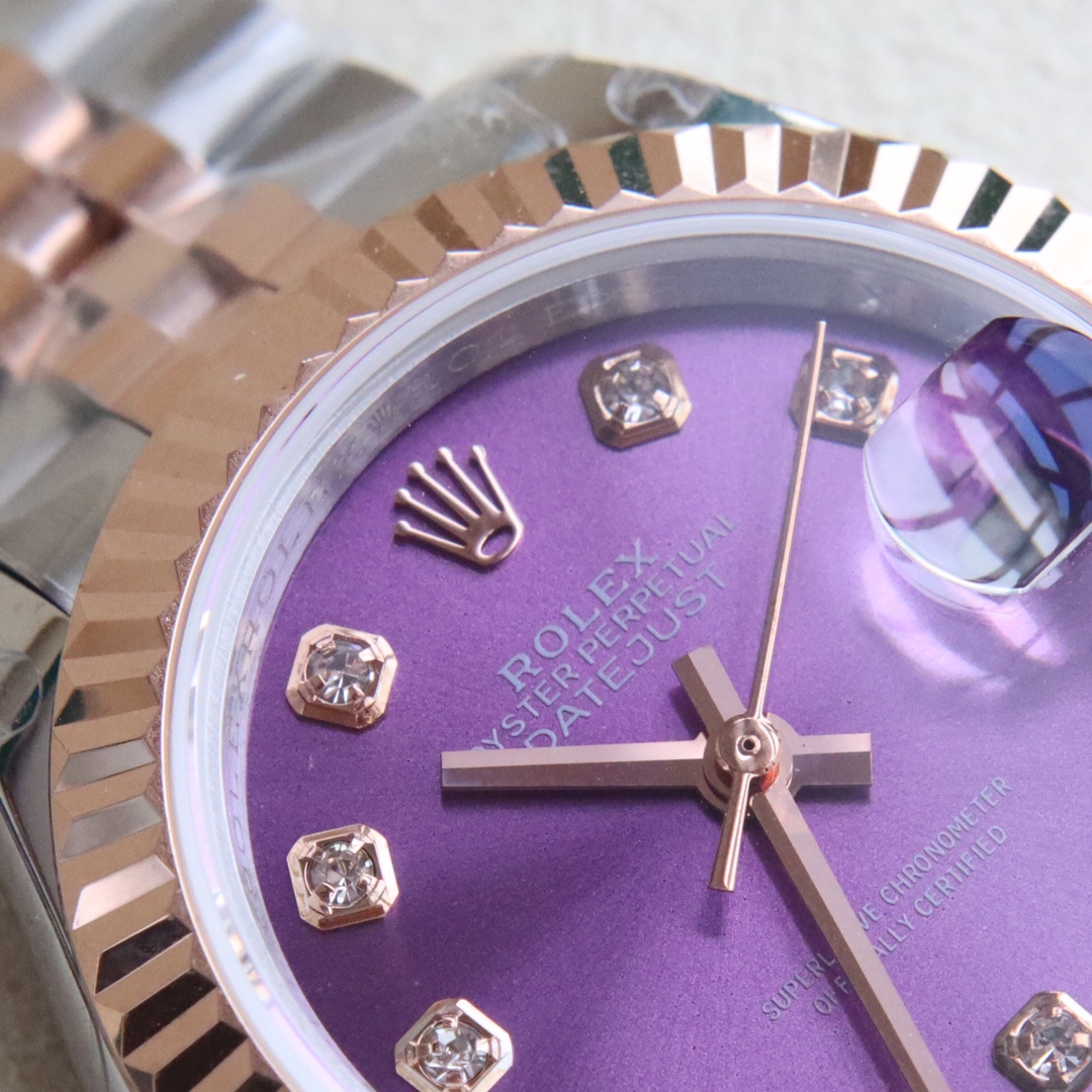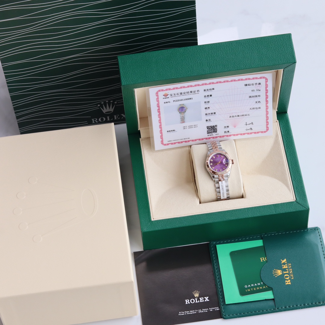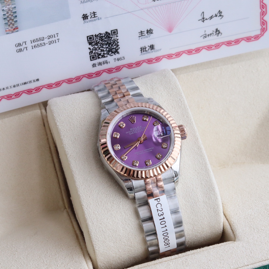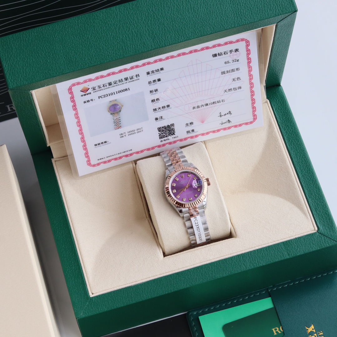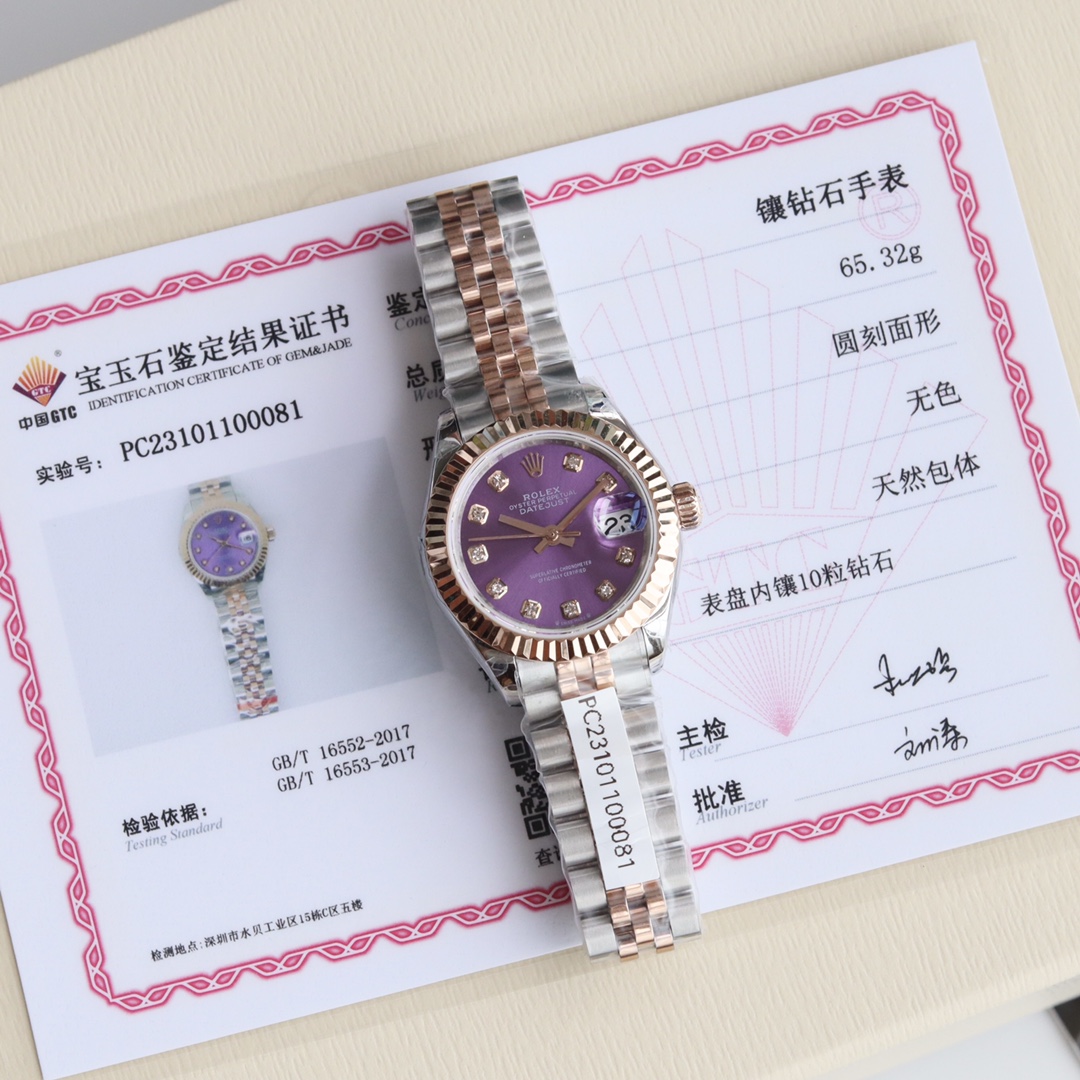 银白色表盘镶嵌10颗天然真钻时标,配国检GTC检测证书一表一遍码可扫可查,手表机身码 保卡 官网入检码 三码合一。采用904L不锈钢来锻造,具备高抗腐蚀性。搭配2671全自动机械机芯性能极为稳定,抗震力强、几何结构使机芯在任何位置都可保持稳定运行。三角坑纹底盖以专用工具的旋紧,使表壳完全密封,上链表冠采用双扣锁双重防水系统,牢固旋紧于表壳,使得更加防水。镜面具有耐磨性高蓝宝石材料制造,3点钟位置装有小窗凸透镜(2.5倍)女装日志型的防水蚝式表壳给予高精准机芯最佳防护!