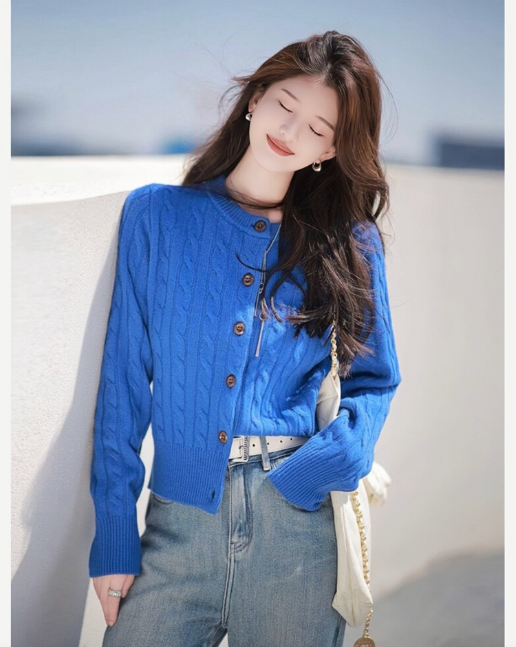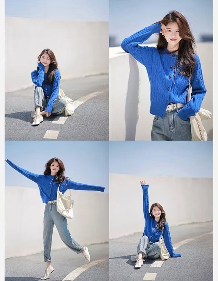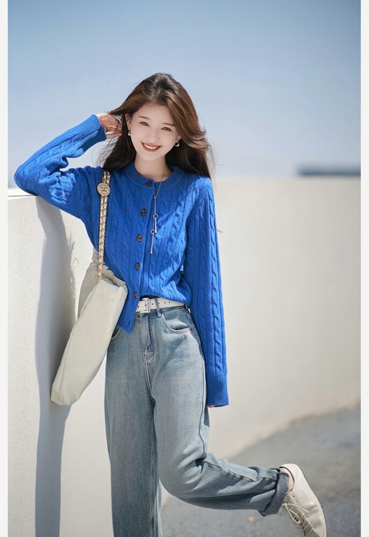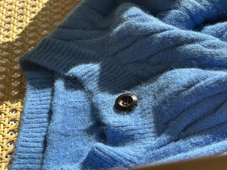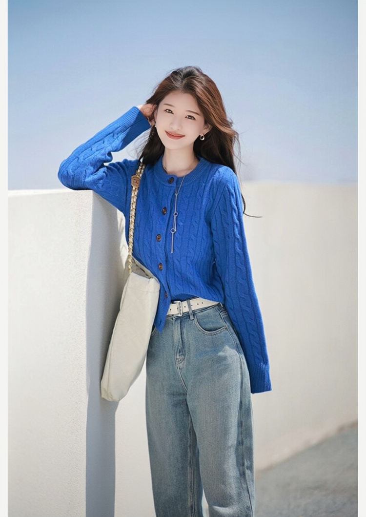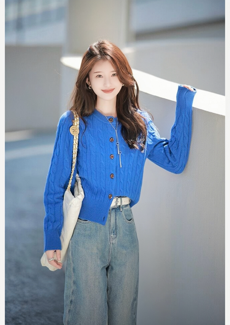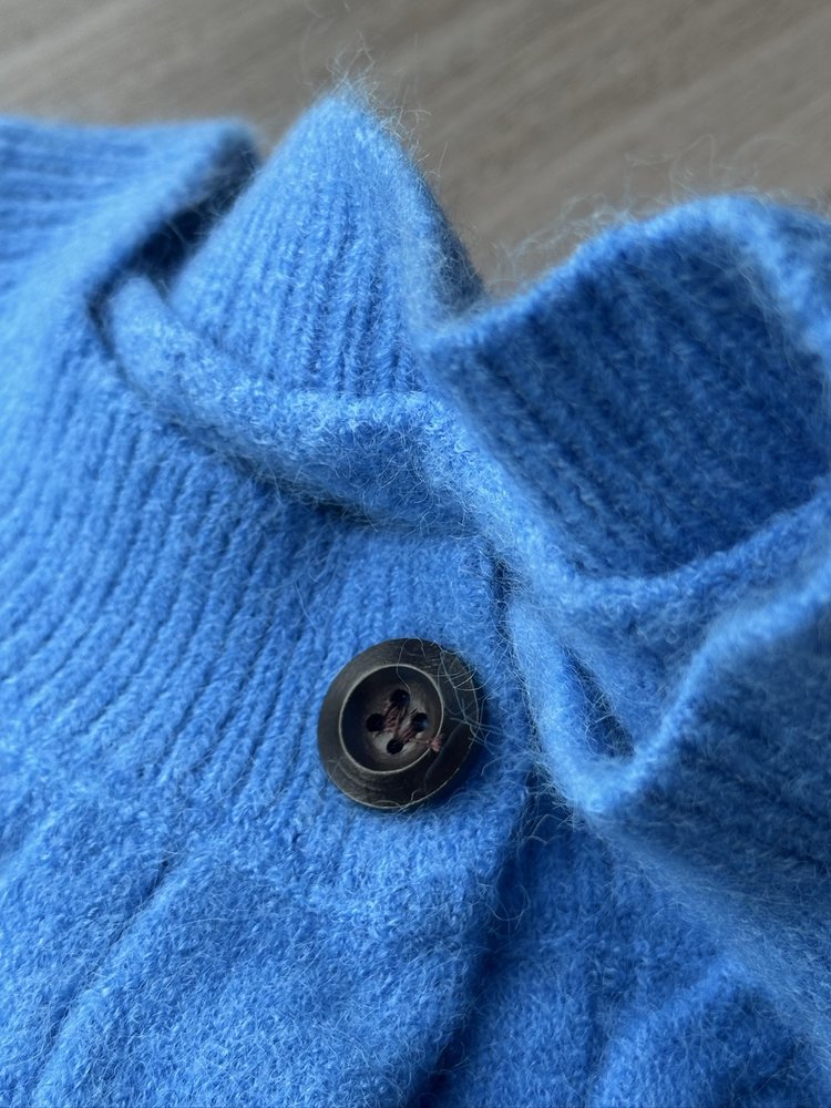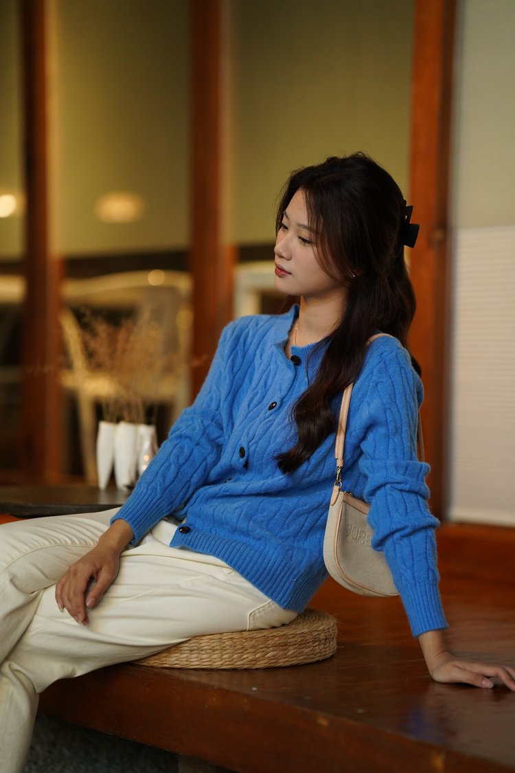ORIGNAL&CO 克莱因蓝经典复古绞花羊毛开衫 进口马海毛+绵羊毛,手感绵密舒适柔软,显瘦版型,高饱和度颜色初秋更显白