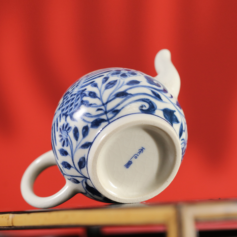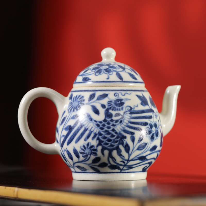 问鼎旗下天石窑白陶泥元青花梨形壶(凤穿牡丹)(缺货)