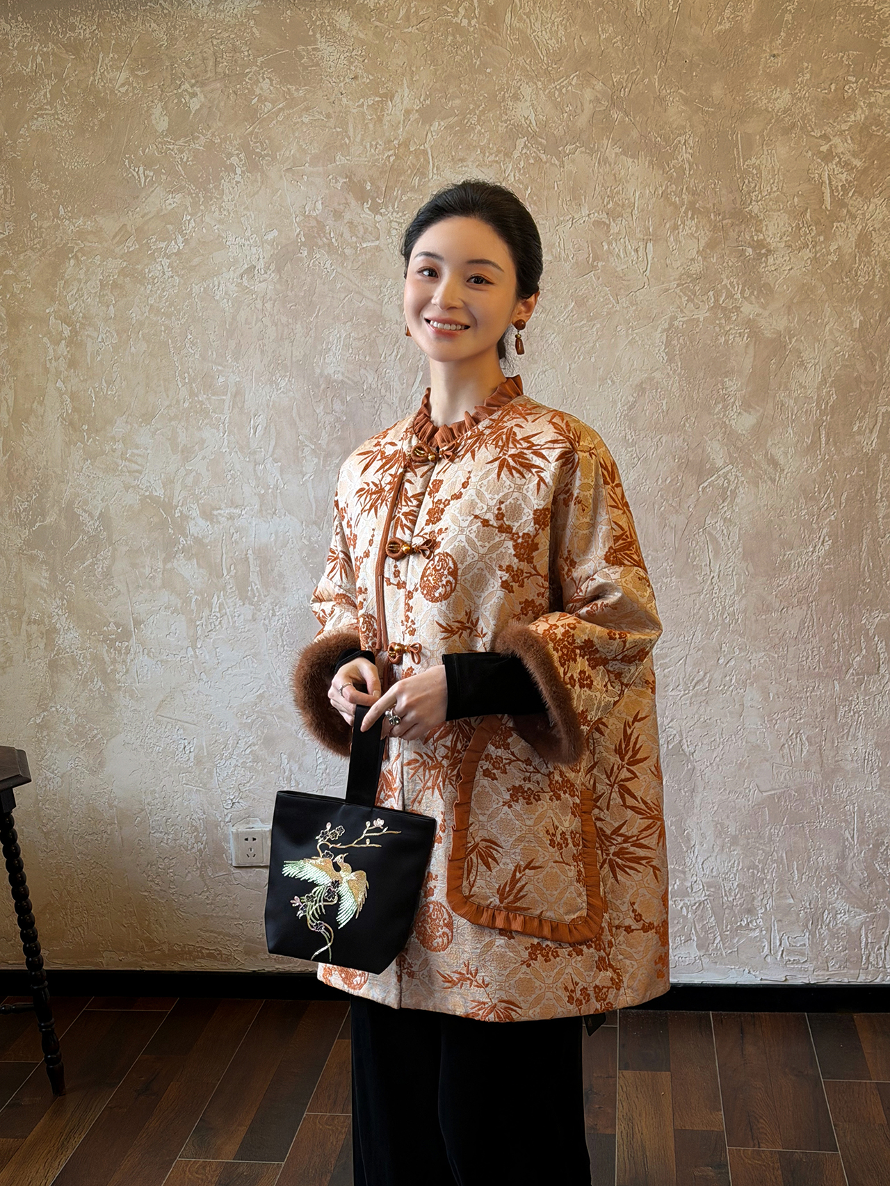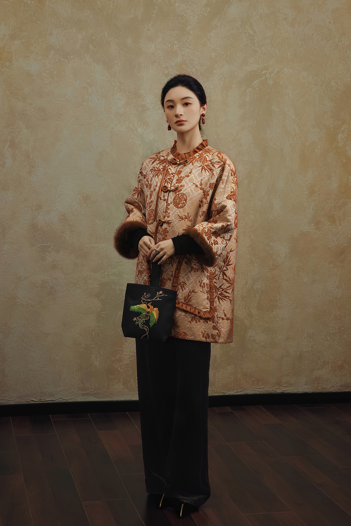 盛唐婧 | 梅竹双清新中式提花绒拼水貂中长款外套