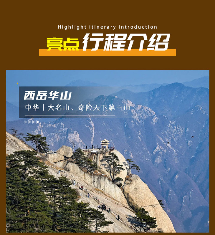 2)门票:华山门票需自行预约(选择4.5日最早场次门票+西峰进山车+西峰上北峰下索道票+北峰出车),兵马俑需自行预约(选择4.6日最早场次);门票价格供参考,以景区实际政策为准;