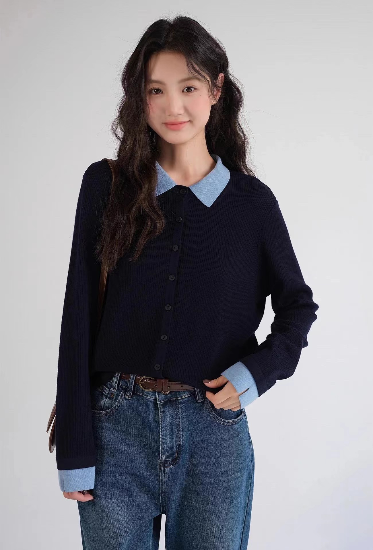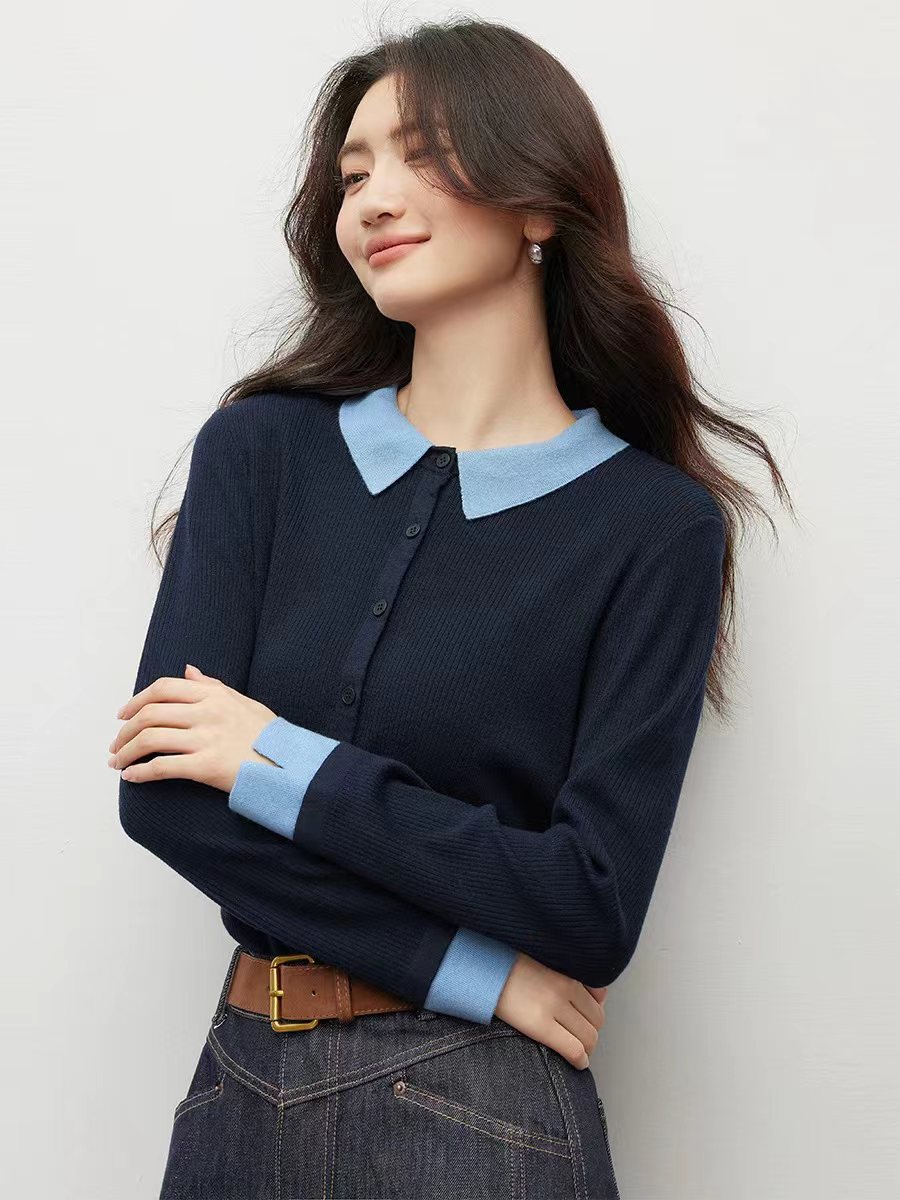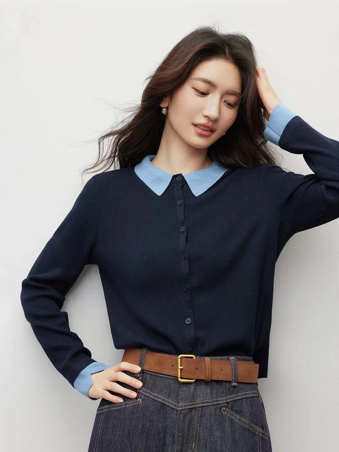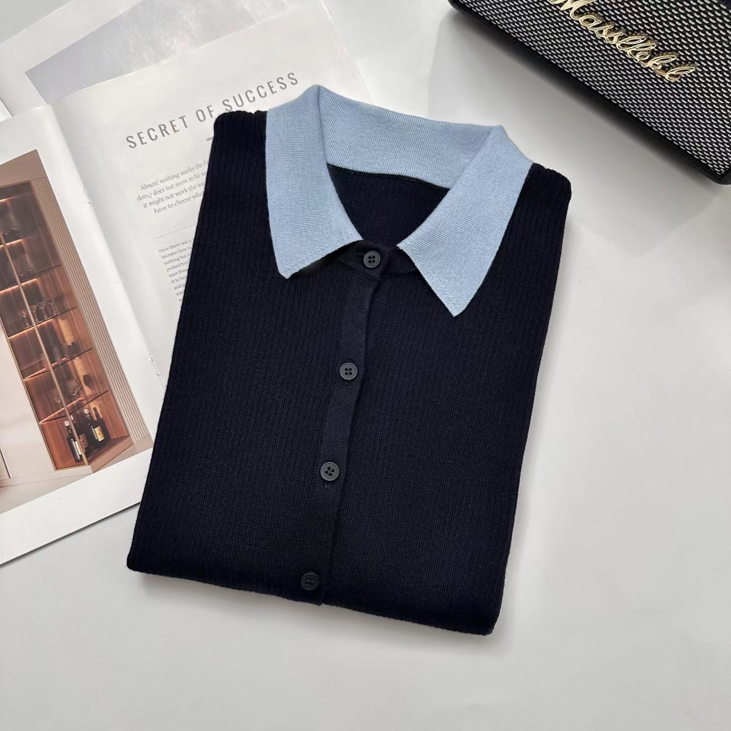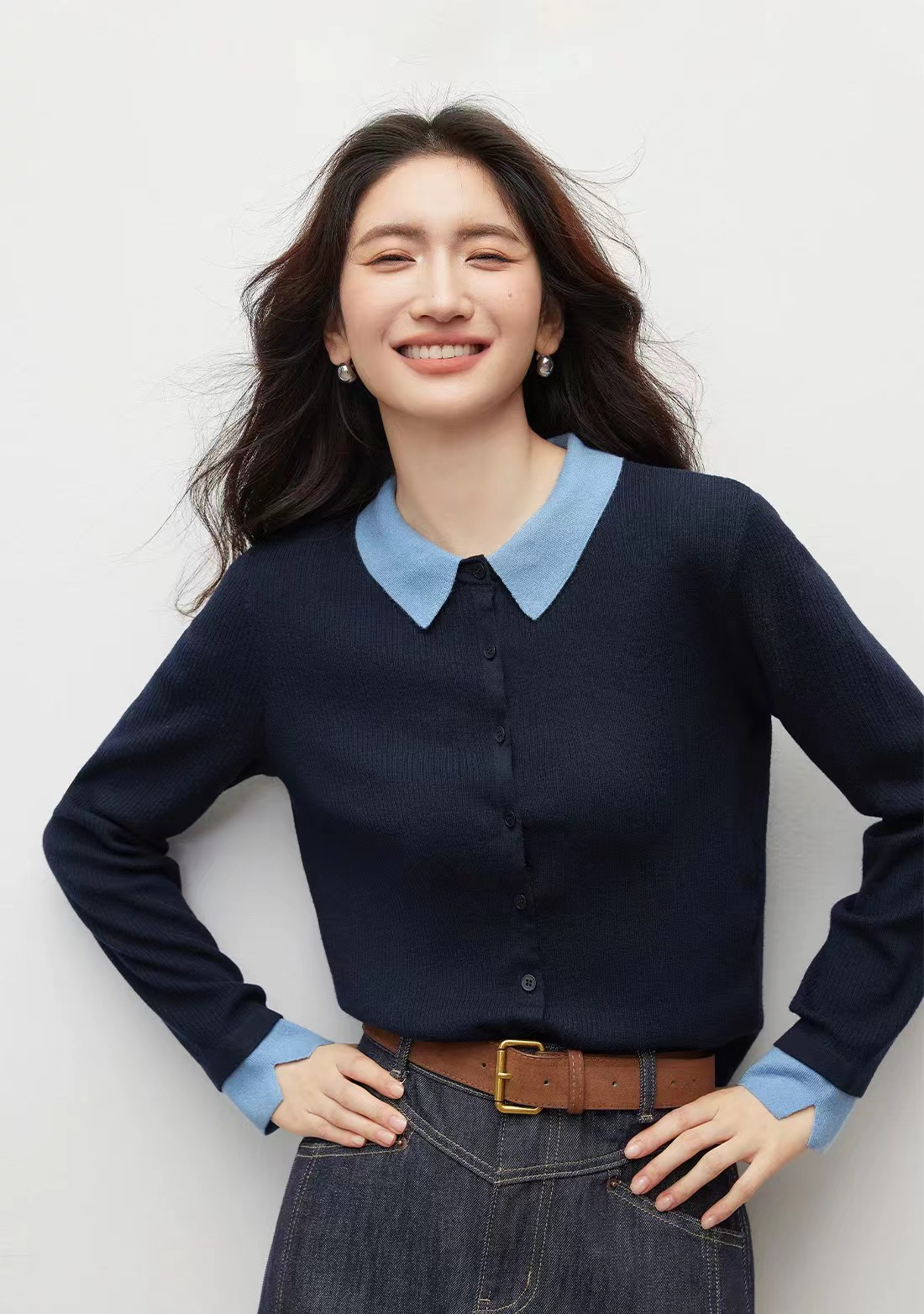 冬季新款时尚撞色翻领针织衫显瘦开衫上衣微宽松直筒版型,适度的宽松度包容腰腹赘肉,对各种身形都十分友好。同时保持整体廓形的挺括,不会有软塌的拖沓感,抬手或活动时也能自在无束缚。设计上的点睛之笔,莫过于撞色拼接。浅蓝色的衬衫翻领与袖口,和藏青色针织主体形成清新的色彩碰撞,还原了衬衫叠穿针织开衫的精典造型,却省去了搭配的繁琐。又能修饰颈部线条,增添知性的通勤气质;袖口处的浅蓝拼接做了小开叉处理,让手臂线条更显纤细,也为整体增添了灵动的细节感。面料选用竖坑条针织纹理,藏青色的针织底布带着细腻的竖向肌理,不仅在视觉上起到显瘦效果,还让面料更具弹性与透气性,贴身穿柔软亲肤,外搭也能保持版型的立体度。坑条纹理的质感还让藏青色多了几分层次,避免了纯色针织的单调。藏青与浅蓝的配色,自带沉稳又清爽的氛围,适配职场的正式感,也能融入日常的休闲场景。搭配个牛仔裤,是随性的复古风;配西装裤或半身裙,又能切换成干练的通勤造型;叠穿风衣或大衣,更是秋冬里层次感满满的穿搭范本~