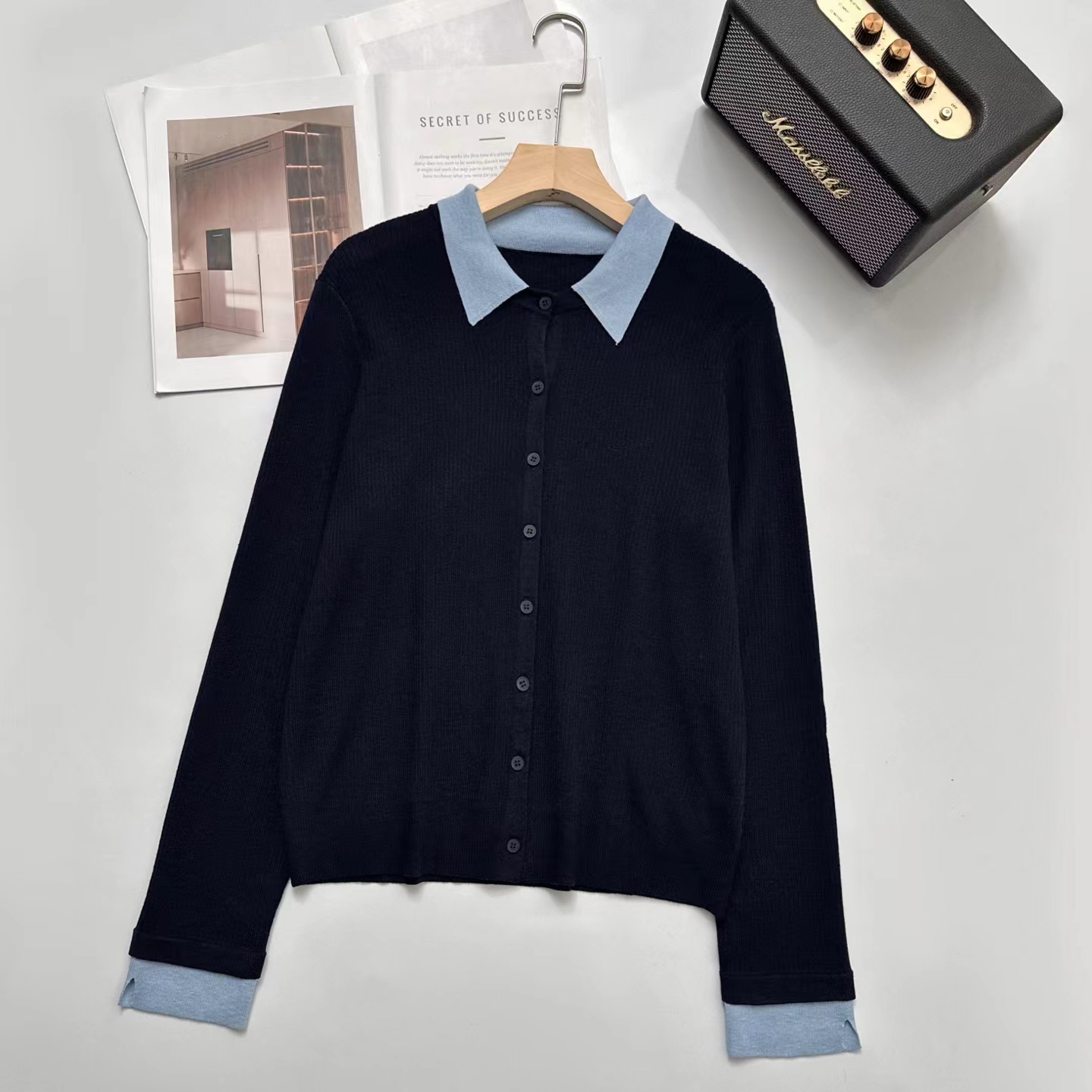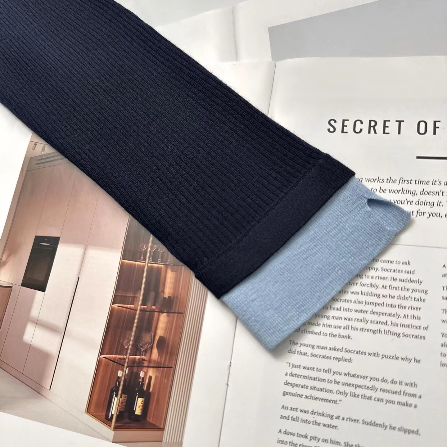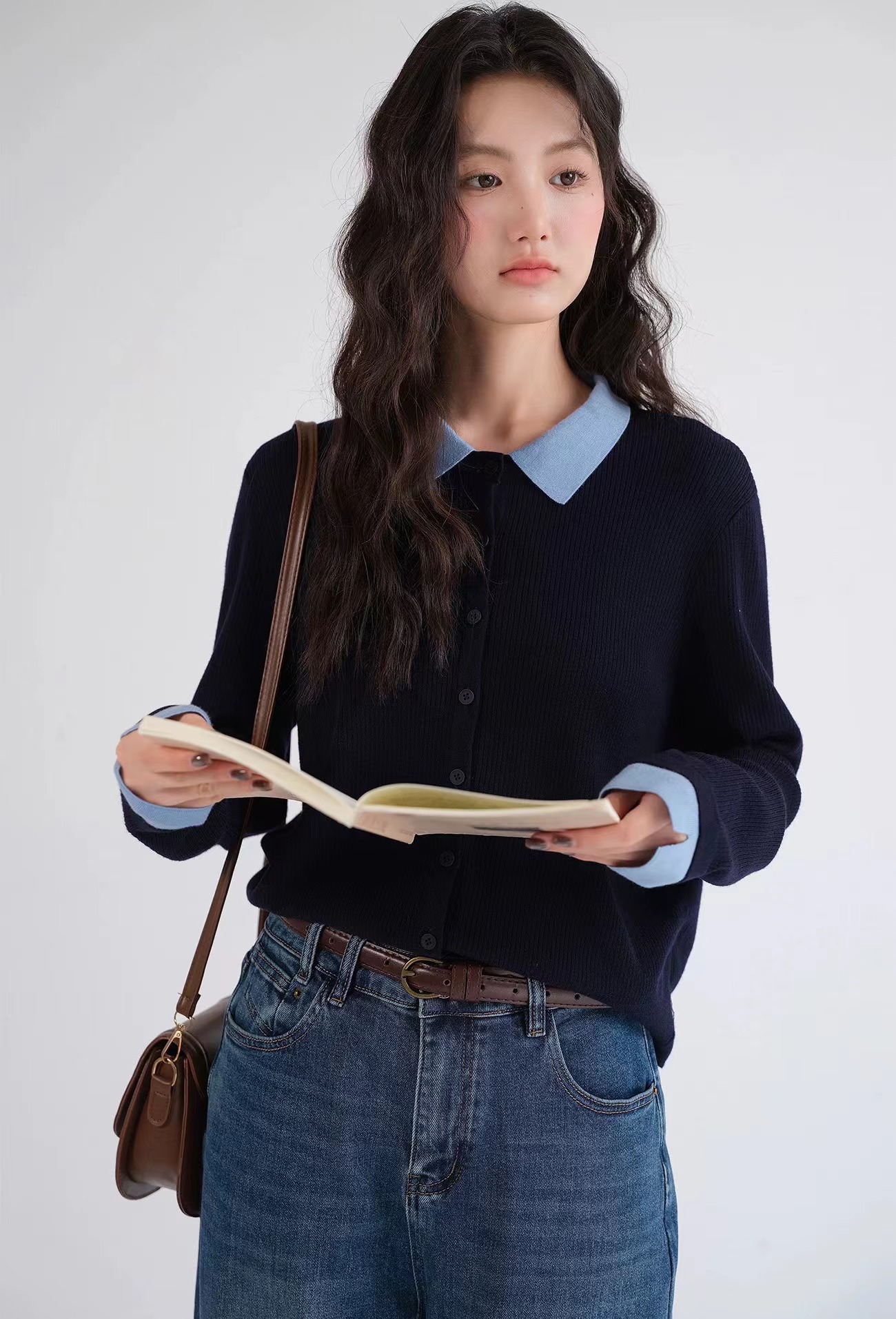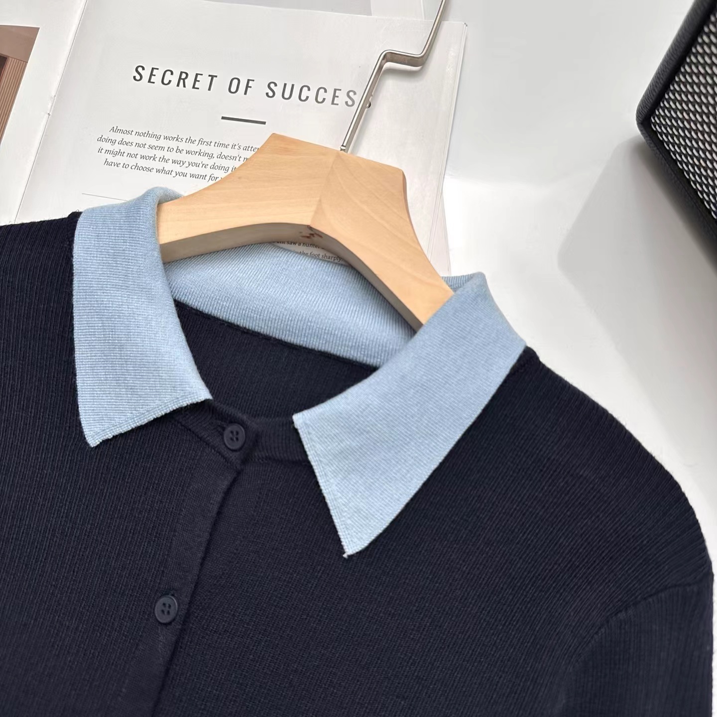 冬季新款时尚撞色翻领针织衫显瘦开衫上衣微宽松直筒版型,适度的宽松度包容腰腹赘肉,对各种身形都十分友好。同时保持整体廓形的挺括,不会有软塌的拖沓感,抬手或活动时也能自在无束缚。设计上的点睛之笔,莫过于撞色拼接。浅蓝色的衬衫翻领与袖口,和藏青色针织主体形成清新的色彩碰撞,还原了衬衫叠穿针织开衫的精典造型,却省去了搭配的繁琐。又能修饰颈部线条,增添知性的通勤气质;袖口处的浅蓝拼接做了小开叉处理,让手臂线条更显纤细,也为整体增添了灵动的细节感。面料选用竖坑条针织纹理,藏青色的针织底布带着细腻的竖向肌理,不仅在视觉上起到显瘦效果,还让面料更具弹性与透气性,贴身穿柔软亲肤,外搭也能保持版型的立体度。坑条纹理的质感还让藏青色多了几分层次,避免了纯色针织的单调。藏青与浅蓝的配色,自带沉稳又清爽的氛围,适配职场的正式感,也能融入日常的休闲场景。搭配个牛仔裤,是随性的复古风;配西装裤或半身裙,又能切换成干练的通勤造型;叠穿风衣或大衣,更是秋冬里层次感满满的穿搭范本~