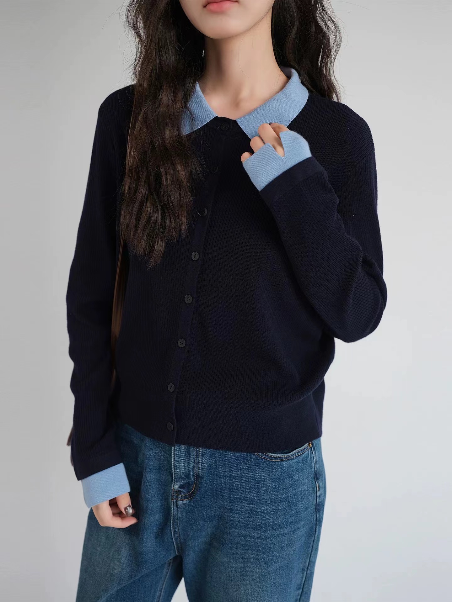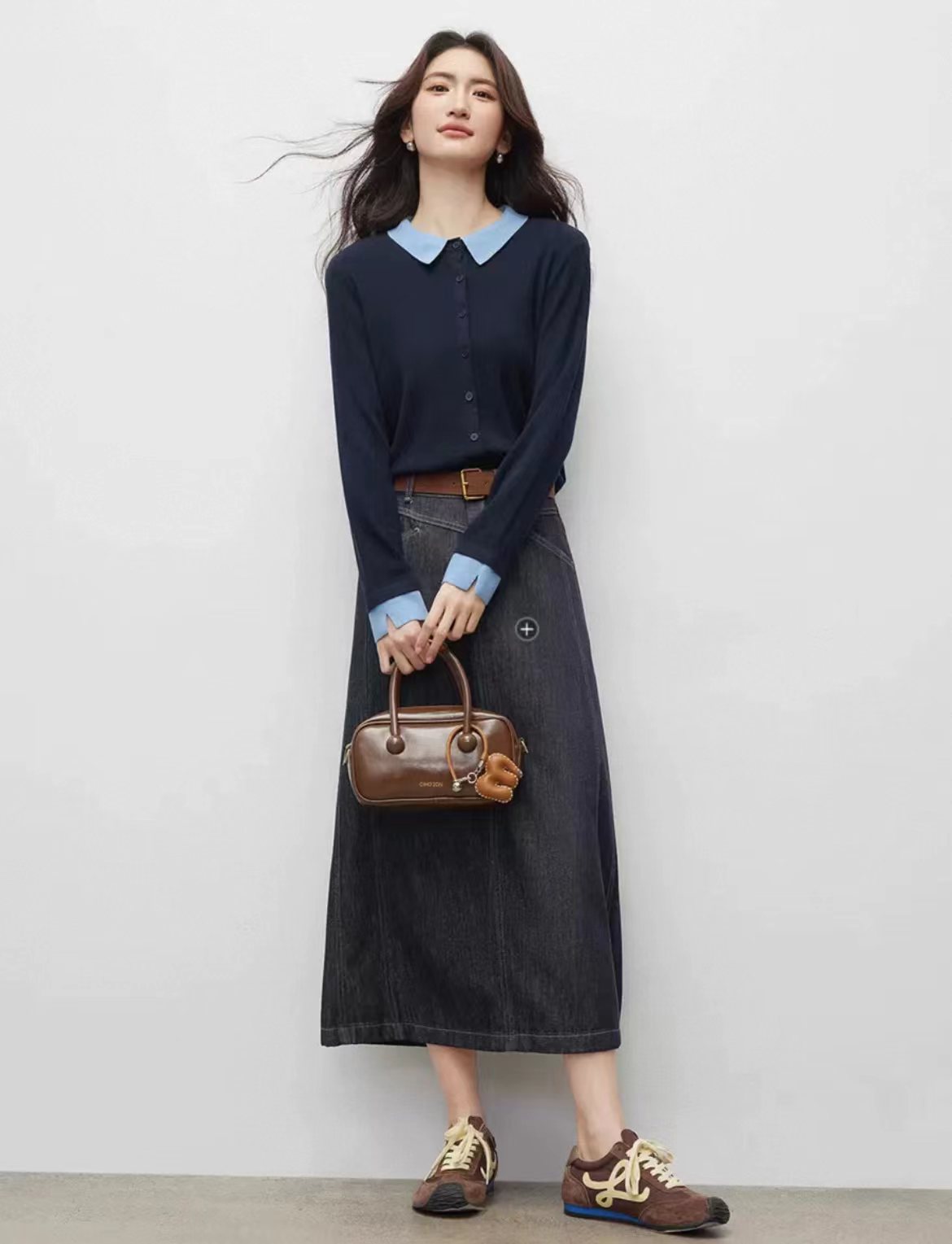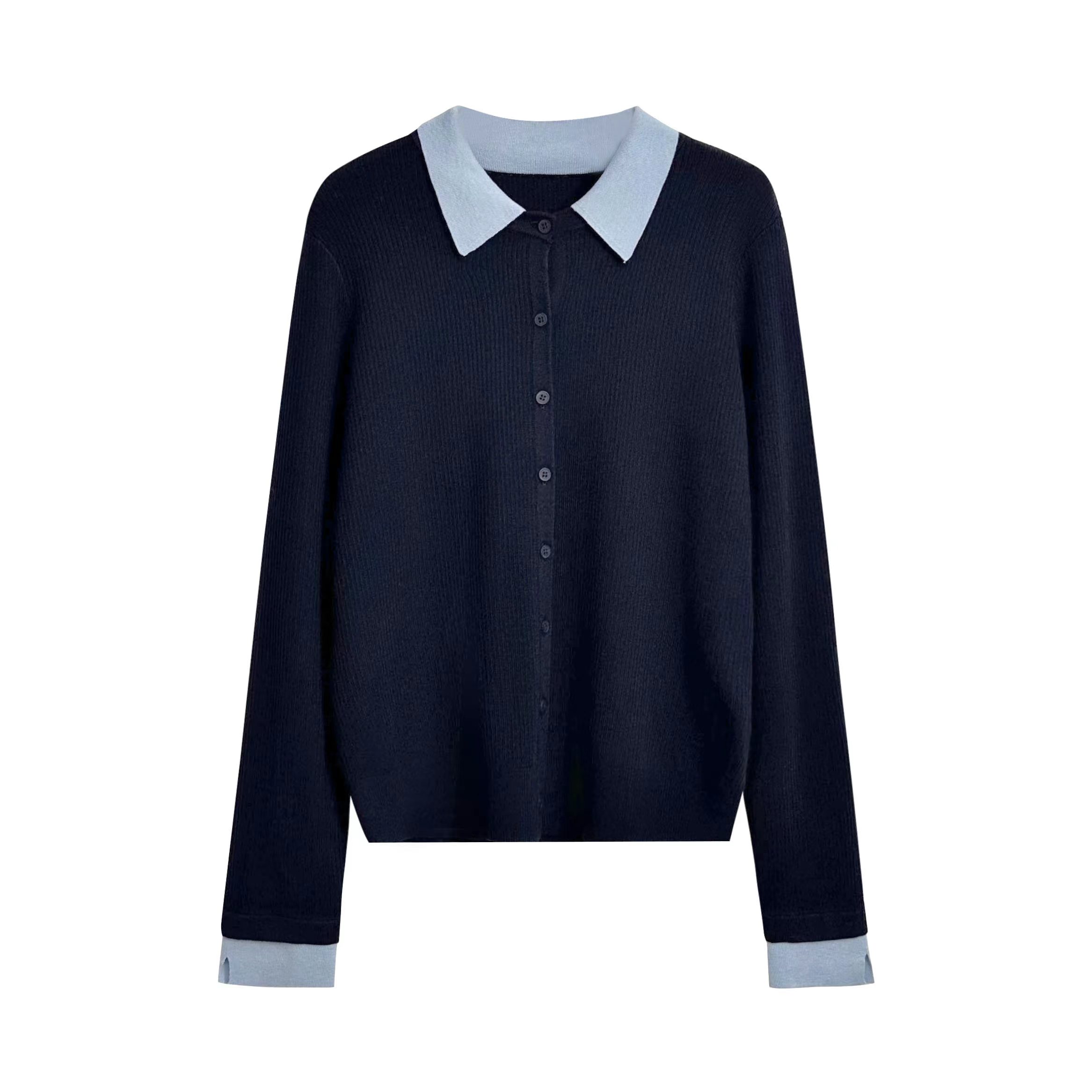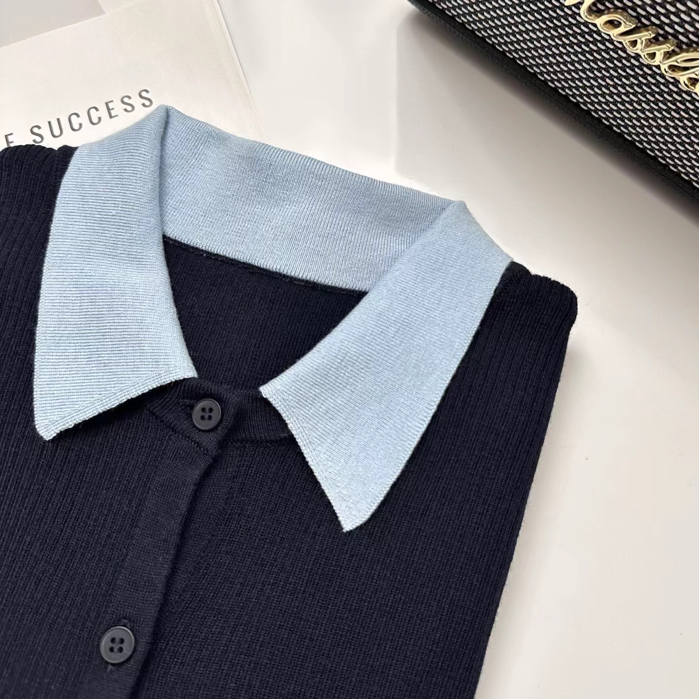 冬季新款时尚撞色翻领针织衫显瘦开衫上衣微宽松直筒版型,适度的宽松度包容腰腹赘肉,对各种身形都十分友好。同时保持整体廓形的挺括,不会有软塌的拖沓感,抬手或活动时也能自在无束缚。设计上的点睛之笔,莫过于撞色拼接。浅蓝色的衬衫翻领与袖口,和藏青色针织主体形成清新的色彩碰撞,还原了衬衫叠穿针织开衫的精典造型,却省去了搭配的繁琐。又能修饰颈部线条,增添知性的通勤气质;袖口处的浅蓝拼接做了小开叉处理,让手臂线条更显纤细,也为整体增添了灵动的细节感。面料选用竖坑条针织纹理,藏青色的针织底布带着细腻的竖向肌理,不仅在视觉上起到显瘦效果,还让面料更具弹性与透气性,贴身穿柔软亲肤,外搭也能保持版型的立体度。坑条纹理的质感还让藏青色多了几分层次,避免了纯色针织的单调。藏青与浅蓝的配色,自带沉稳又清爽的氛围,适配职场的正式感,也能融入日常的休闲场景。搭配个牛仔裤,是随性的复古风;配西装裤或半身裙,又能切换成干练的通勤造型;叠穿风衣或大衣,更是秋冬里层次感满满的穿搭范本~