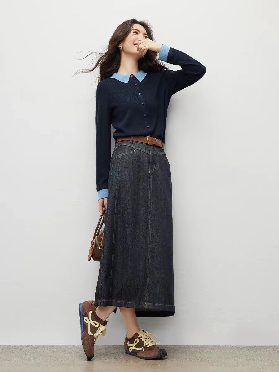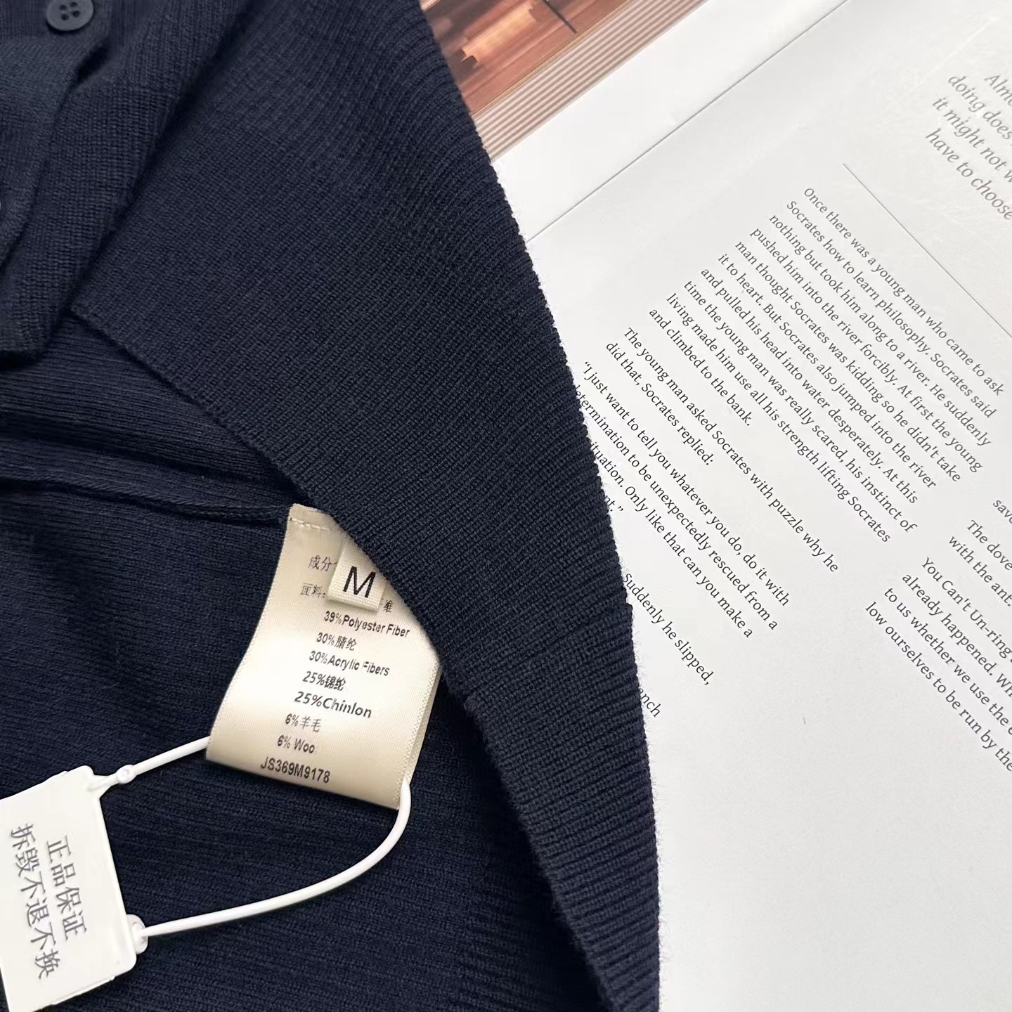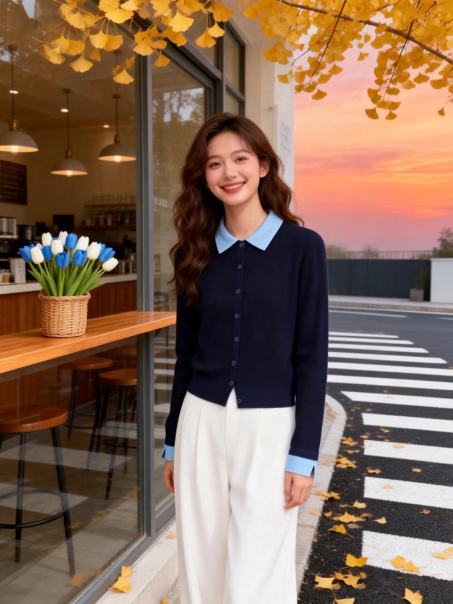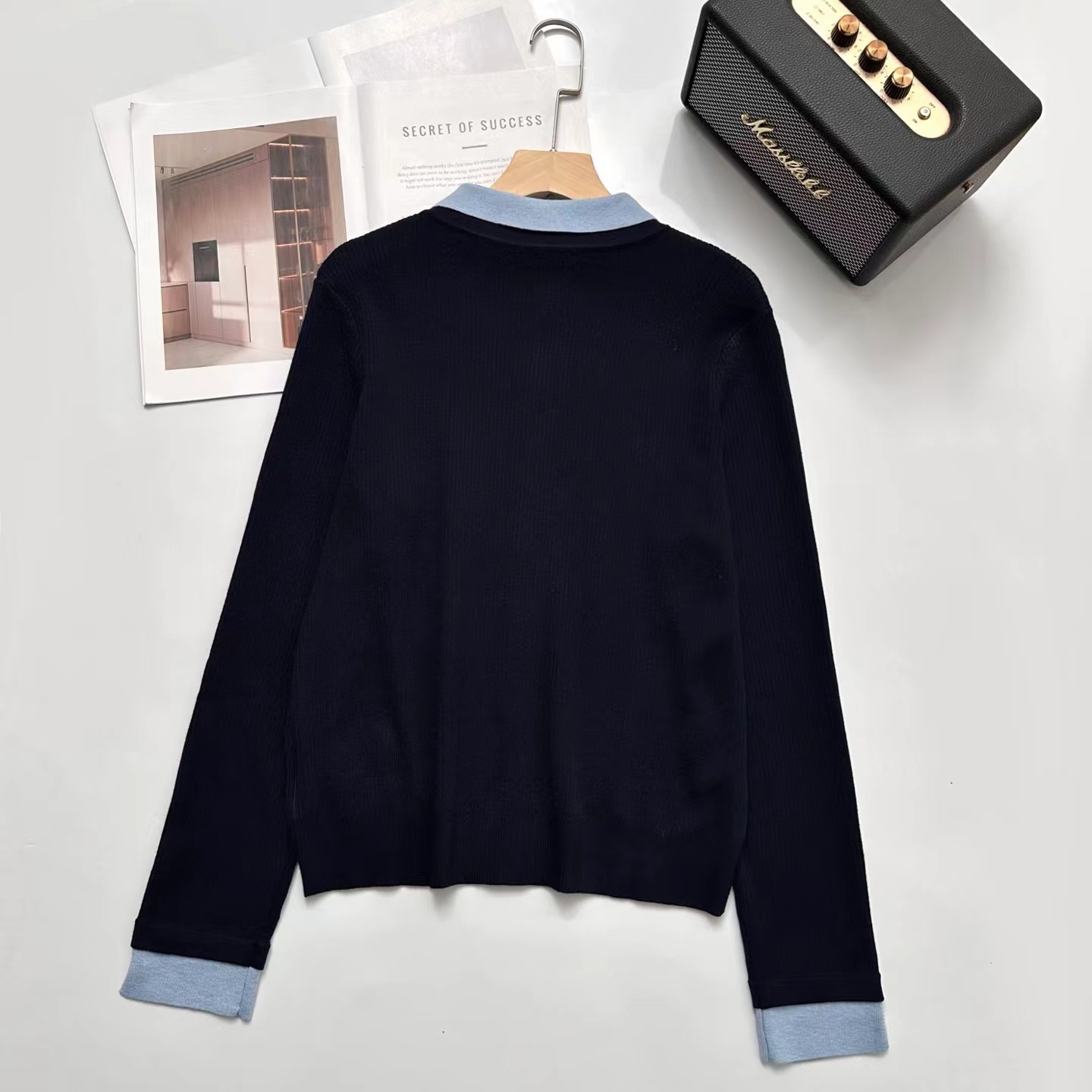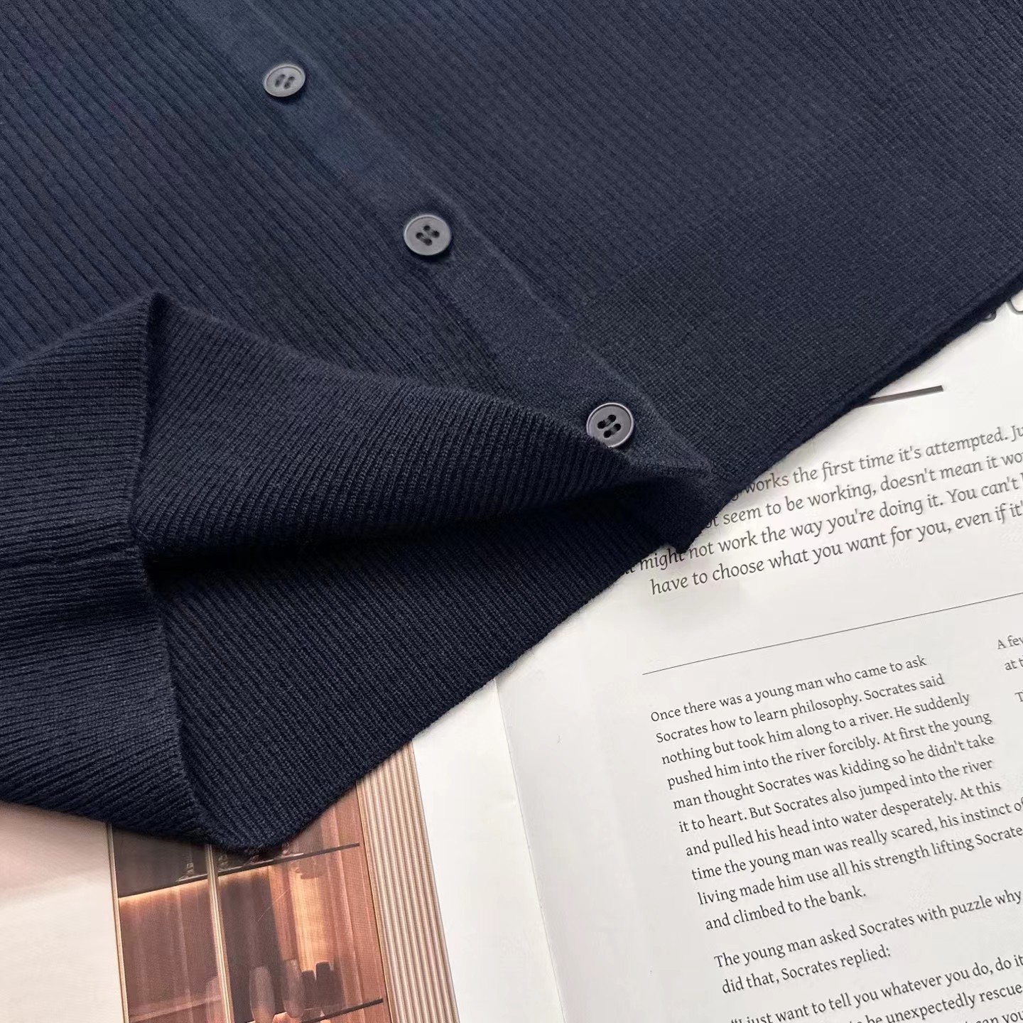 冬季新款时尚撞色翻领针织衫显瘦开衫上衣微宽松直筒版型,适度的宽松度包容腰腹赘肉,对各种身形都十分友好。同时保持整体廓形的挺括,不会有软塌的拖沓感,抬手或活动时也能自在无束缚。设计上的点睛之笔,莫过于撞色拼接。浅蓝色的衬衫翻领与袖口,和藏青色针织主体形成清新的色彩碰撞,还原了衬衫叠穿针织开衫的精典造型,却省去了搭配的繁琐。又能修饰颈部线条,增添知性的通勤气质;袖口处的浅蓝拼接做了小开叉处理,让手臂线条更显纤细,也为整体增添了灵动的细节感。面料选用竖坑条针织纹理,藏青色的针织底布带着细腻的竖向肌理,不仅在视觉上起到显瘦效果,还让面料更具弹性与透气性,贴身穿柔软亲肤,外搭也能保持版型的立体度。坑条纹理的质感还让藏青色多了几分层次,避免了纯色针织的单调。藏青与浅蓝的配色,自带沉稳又清爽的氛围,适配职场的正式感,也能融入日常的休闲场景。搭配个牛仔裤,是随性的复古风;配西装裤或半身裙,又能切换成干练的通勤造型;叠穿风衣或大衣,更是秋冬里层次感满满的穿搭范本~