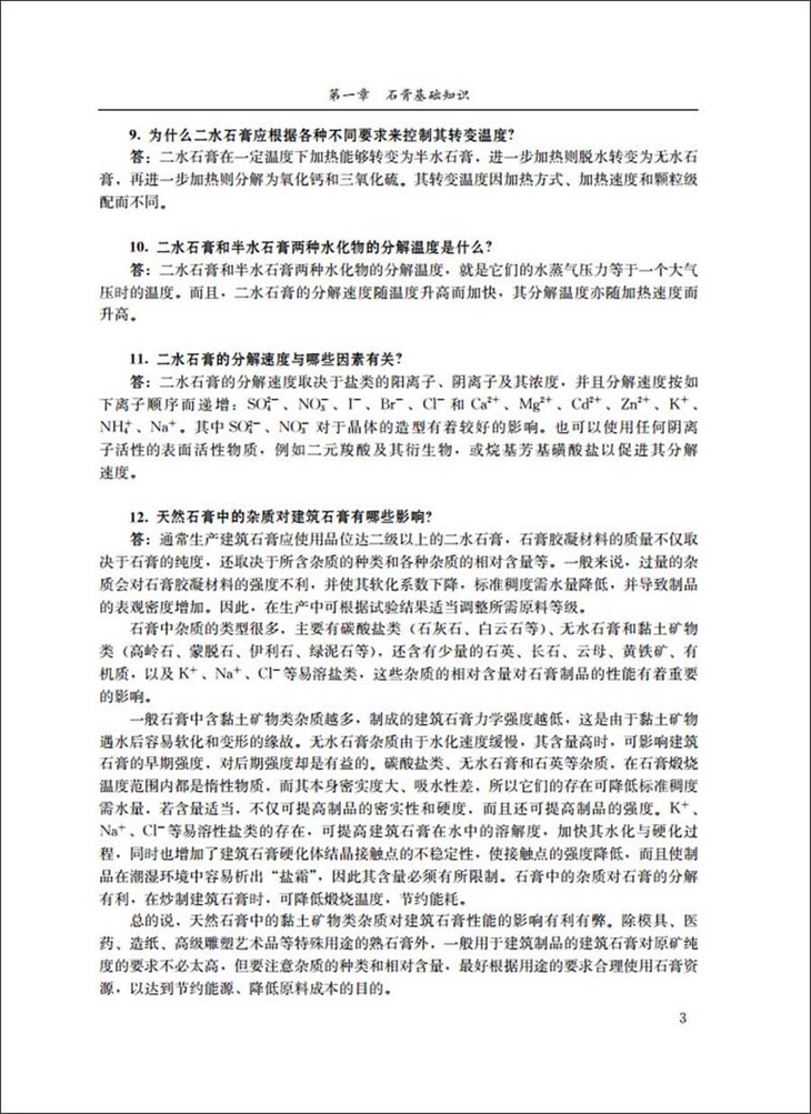 过去的十多年,石膏建材在我国取得了飞速的发展,应用领域和范围不断扩大,新的产品不断涌现。但是在快速发展的同时,石膏建材的应用还存在各种各样的问题,这些问题影响到石膏性能的发挥和市场的推广应用,本书以问答的形式解答了石膏的基本性能和应用方面的部分问题,希望能够对石膏行业生产和应用的从业人员提供一些参考和指导。
