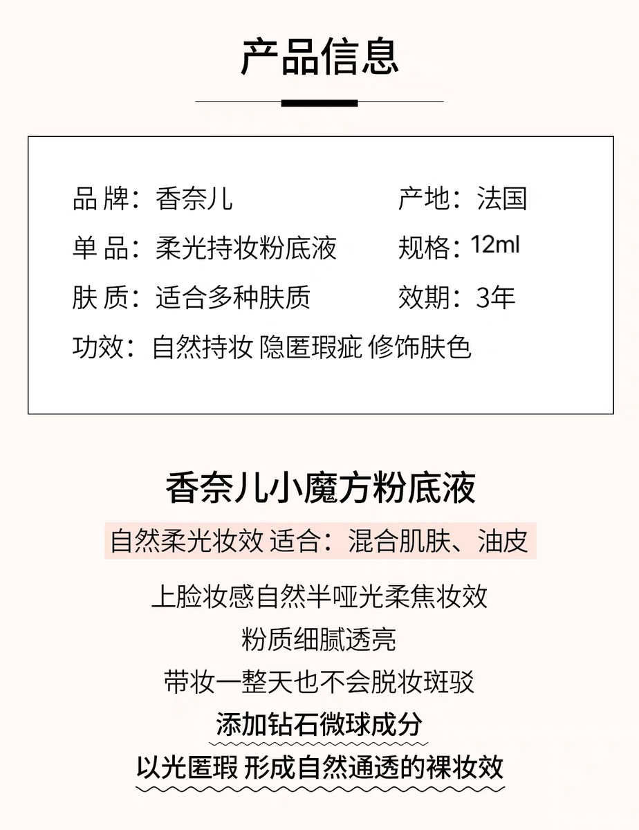香奈儿 持久遮瑕柔光粉底液中样12ml 为油皮和混油皮设计