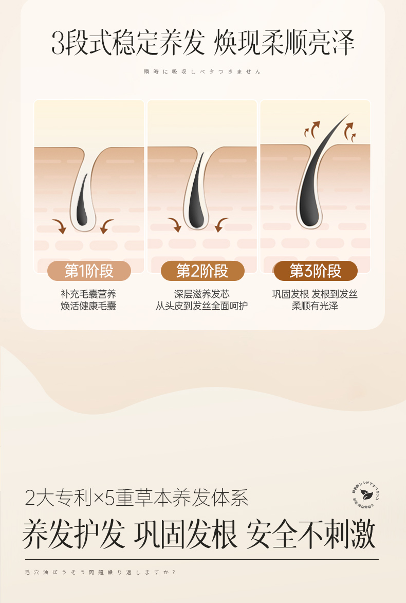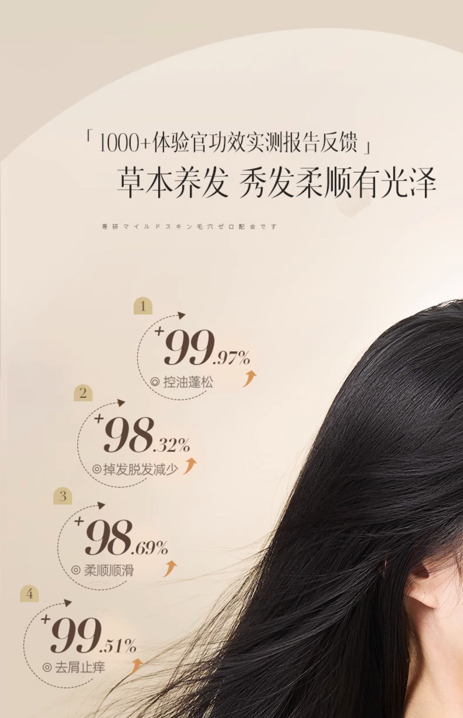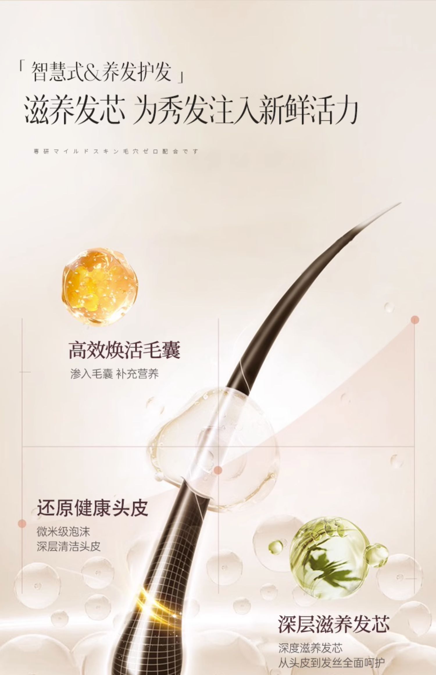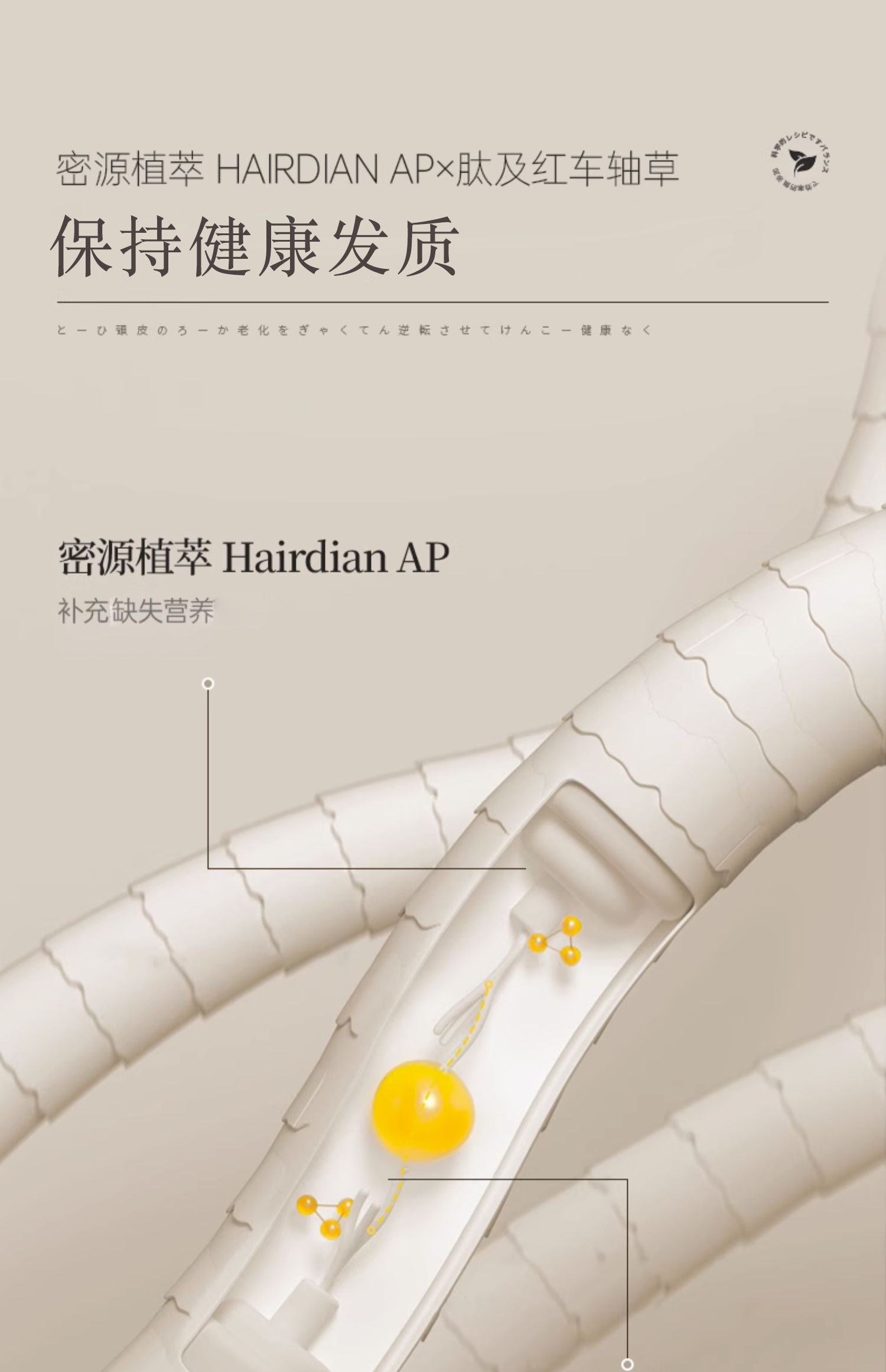 一方面利用草本植萃焕活毛囊、滋养头皮,给头发吃进去足够的营养,展现柔顺亮泽。