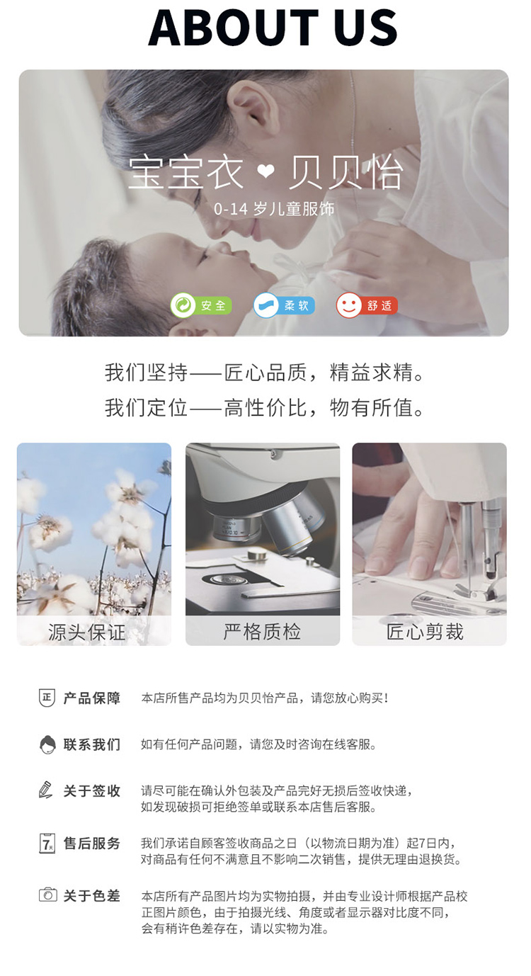 - 贝贝怡专注0-6岁婴幼儿服饰,坚持安全、柔软、舒适的产品理念,为千万中国家庭提供超高品质、安全可靠的婴幼儿服饰产品,妈妈放心,宝宝开心!
