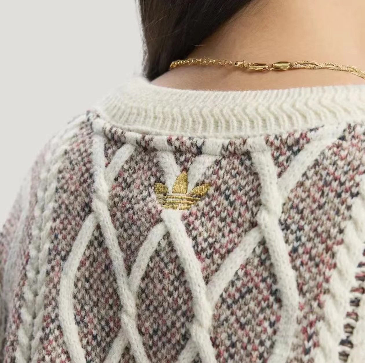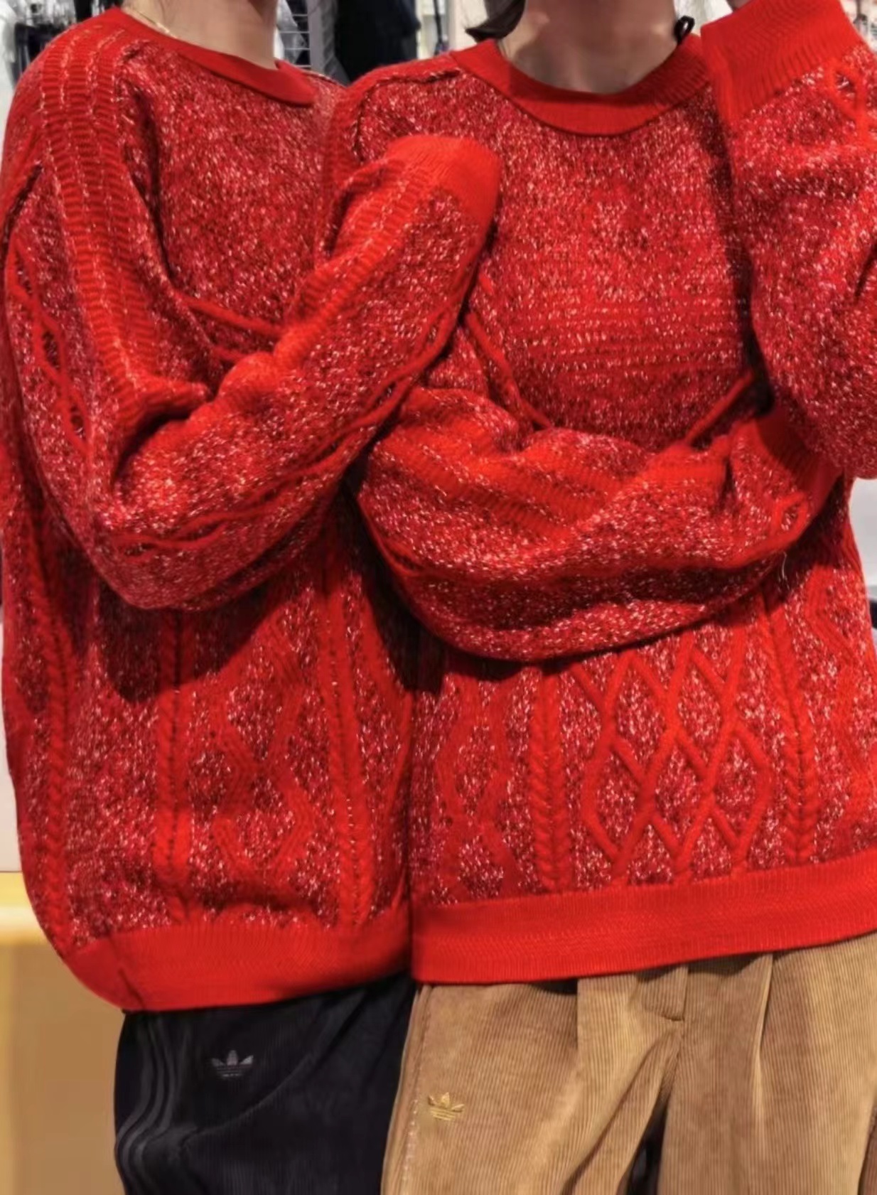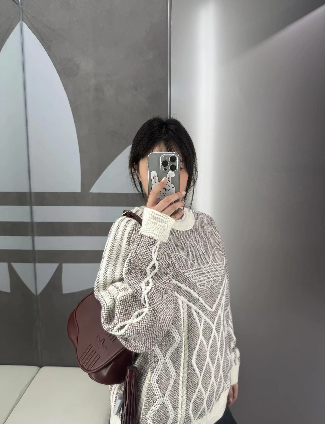 新款新年何与同款针织衫套头撞色提花针织毛衣,以几何线条提花与宽松慵懒版型,打造秋冬兼具艺术感与松弛感的百搭单品。波浪纹提花交织出抽象艺术感,视觉层次丰富。领口、袖口和下摆的米白色罗纹包边形成柔和撞色,肩袖处的条纹元素强化了复古休闲属性。宽松落肩的oversize版型对身材包容度高,慵懒随性还能修饰身形。采用华夫格纹理针织面料,触感软糯亲肤,保暖性与舒适度兼备,适合深秋及初冬穿着。单穿可打造艺术感松弛风,叠穿夹克或大衣也能增加层次。搭配牛仔裤、阔腿裤或半裙都很出彩,无论是日常通勤、艺术看展还是周末出街,都能轻松营造温柔又时髦