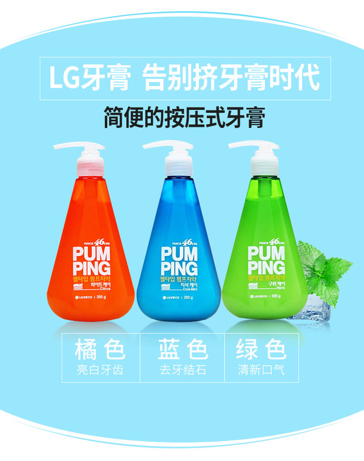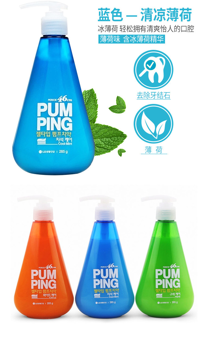 〖一般贸易〗韩国进口LG倍瑞傲按压式牙膏成人牙齿清新口气美白去口臭285g