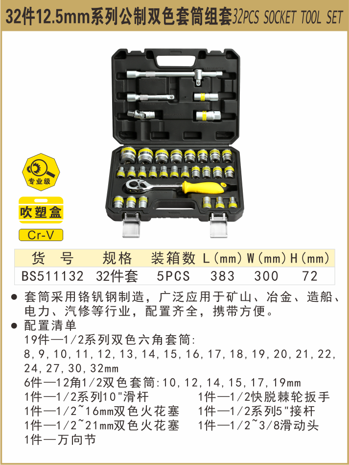 波斯 32件12.5mm系列公制双色套筒组套 32PC BS511132