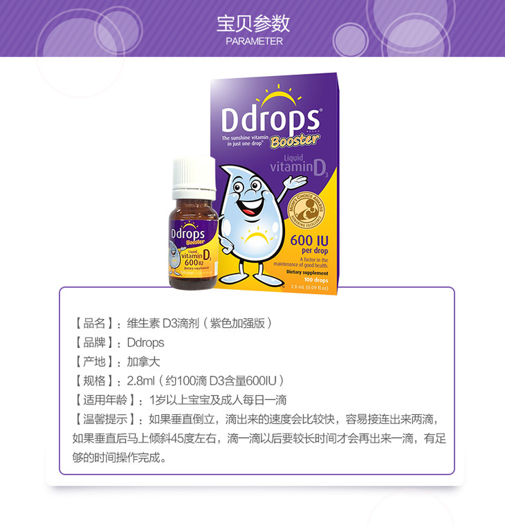 美国本土 · 美国Ddrops婴幼儿纯维生素D3剂 100滴 紫色款 2.8ml(1岁以上)|美国直邮