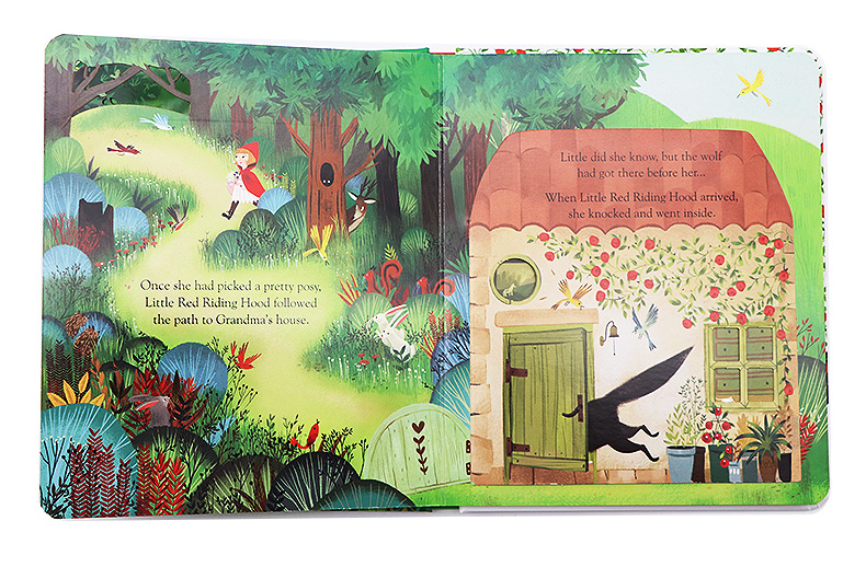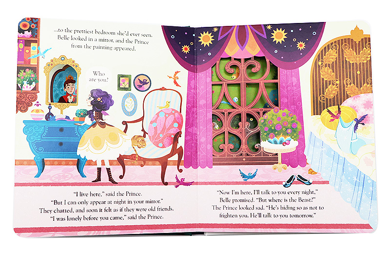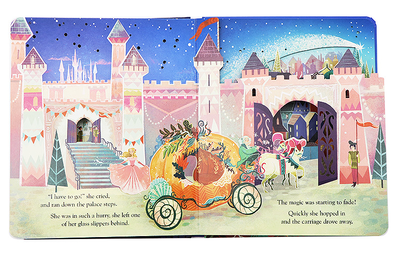 Peep Inside a Fairy Tale系列,除了翻页机关之外,画面中增加许多雕花镂空,创造层层穿透的视觉效果,并且透过镂空处巧妙地前后映照呼应,更增添窥探感,不仅吸引小宝宝好奇探寻洞洞后面的世界,对大人读者来说也是值得收藏的精致作品。