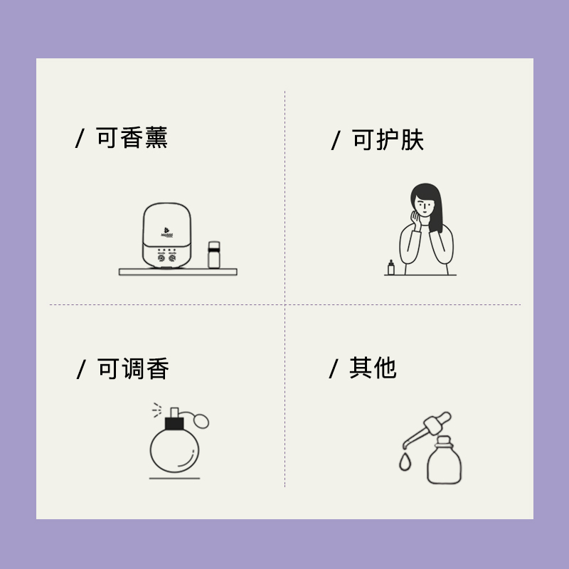使用场景:➀ 香薰:250ML水中加入10滴精油、② 基础护肤:配合基础油以合适的比例稀释后,进行全身/局部按摩涂抹、③ 身体保养:葡萄柚3滴+轻盈净化2滴+姜2滴+多维漾5ML,涂抹在有需要的地方并按摩至微发热