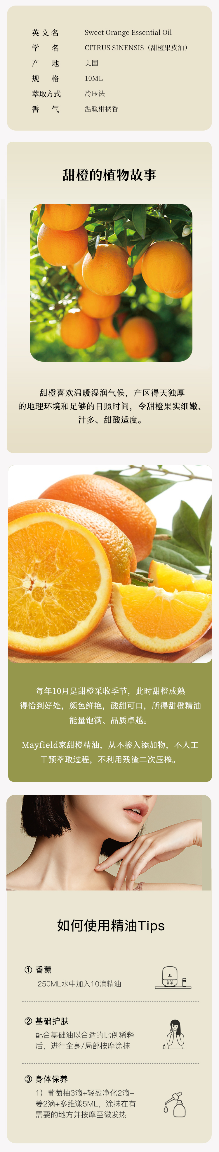3.护肤:稀释后的甜橙精油可用于面部按摩,或者加入乳液、面霜中使用,改善肌肤状态。