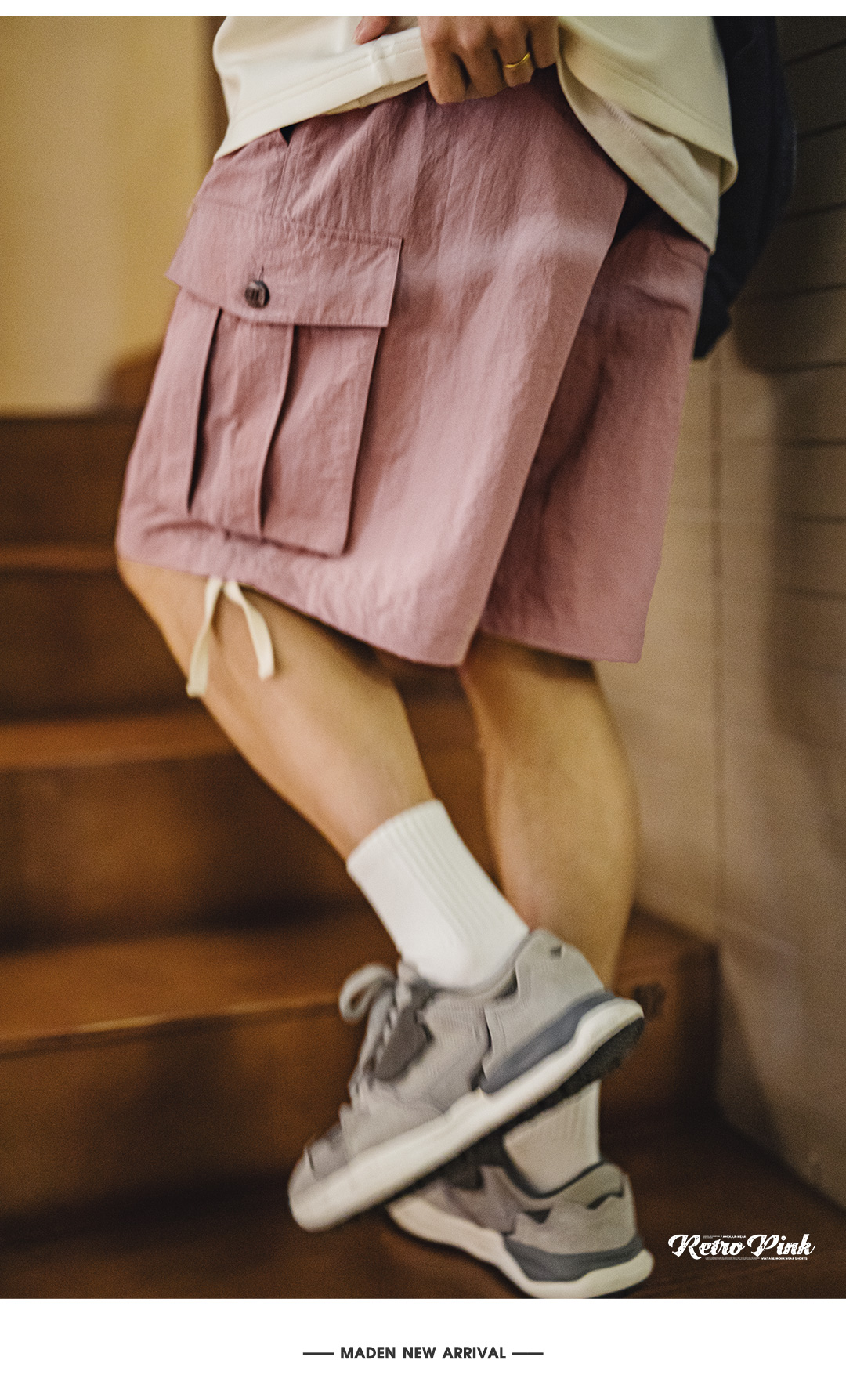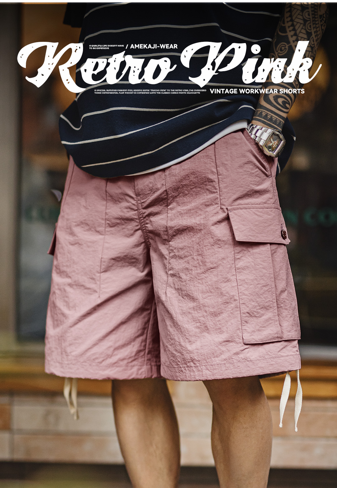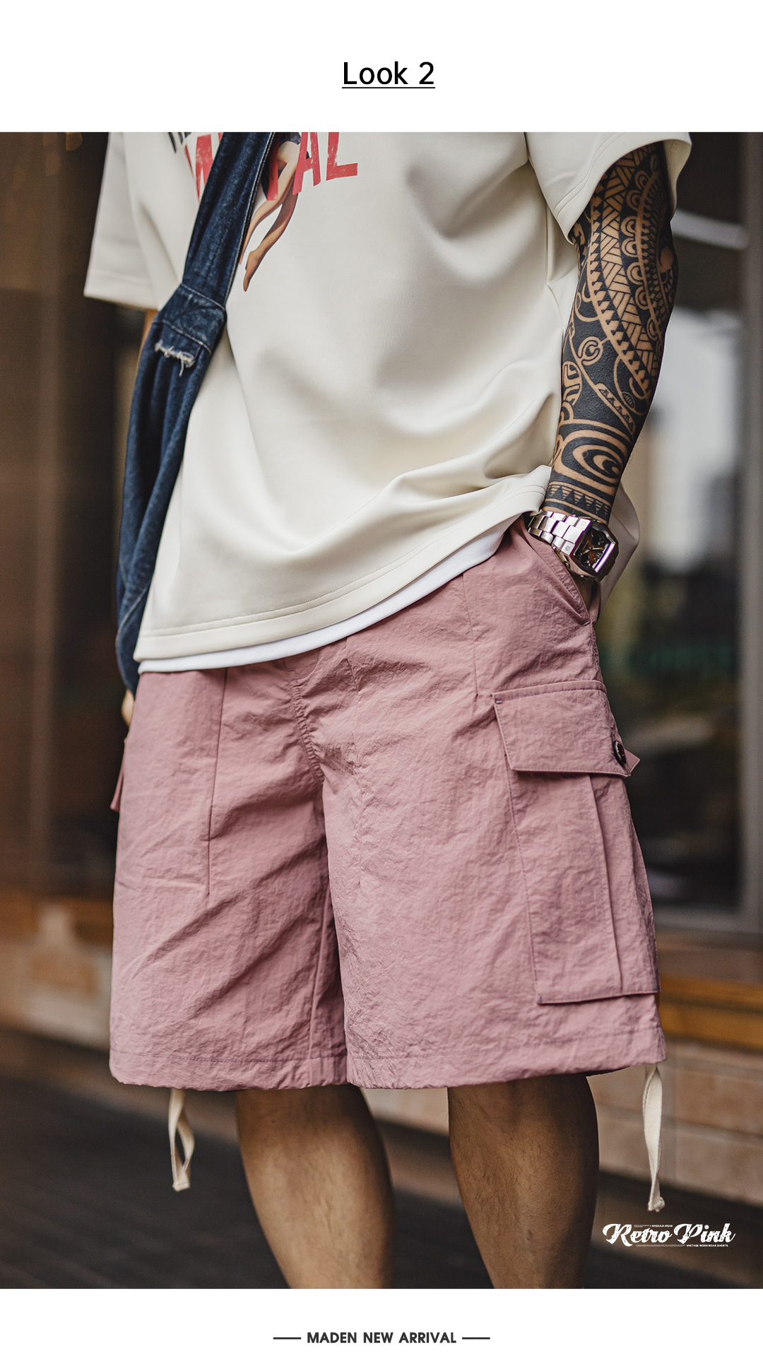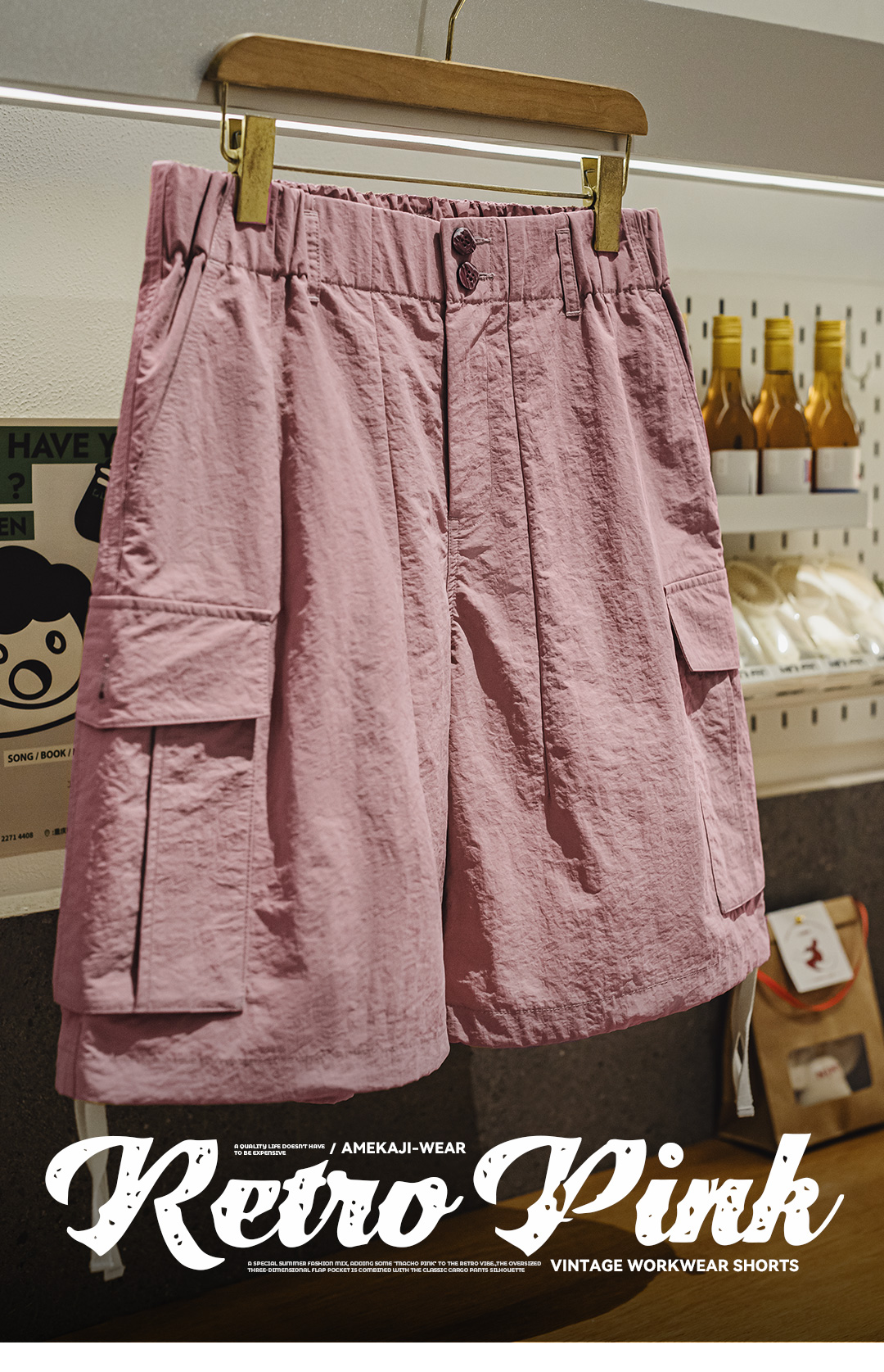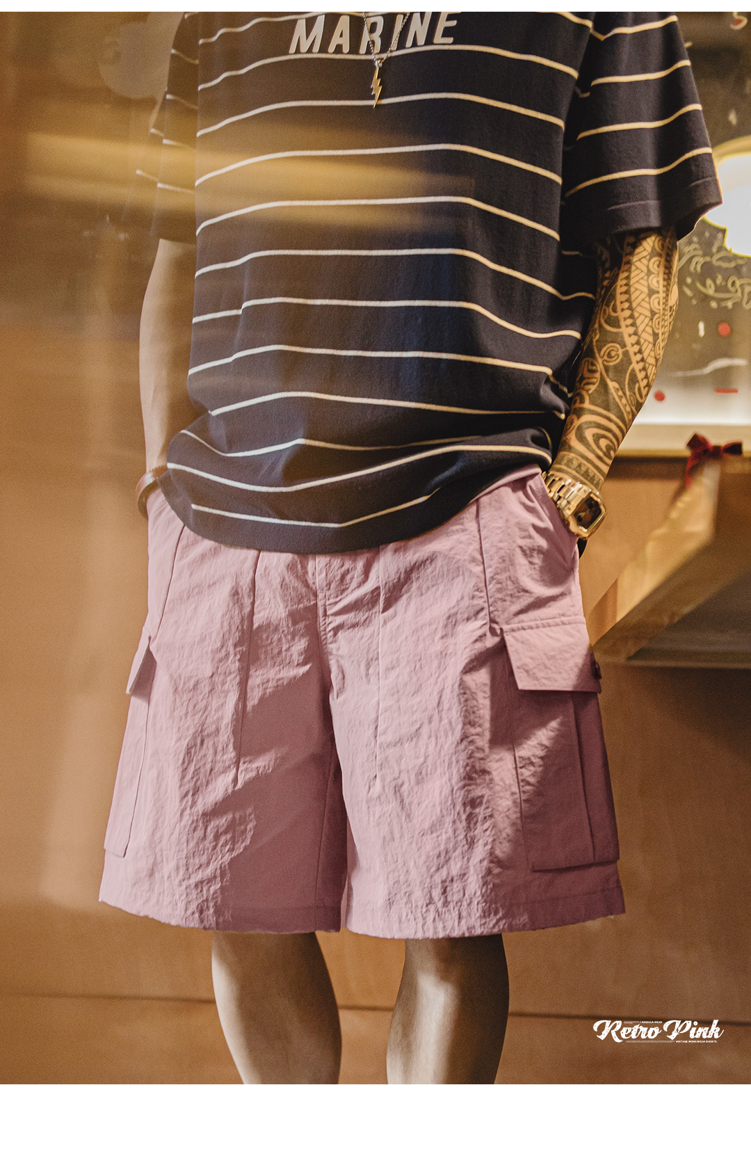 马登工装山系速干短裤美式大口袋梭织宽松直筒粉色薄款短裤男夏季