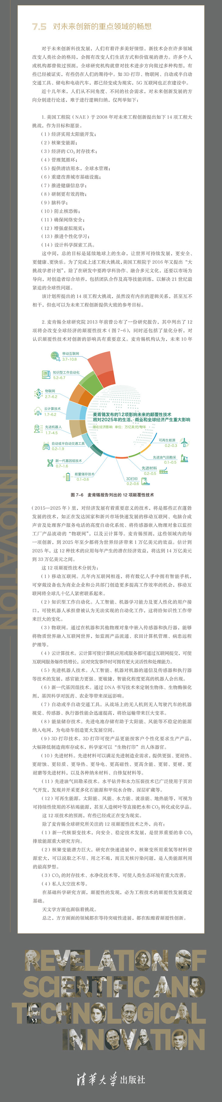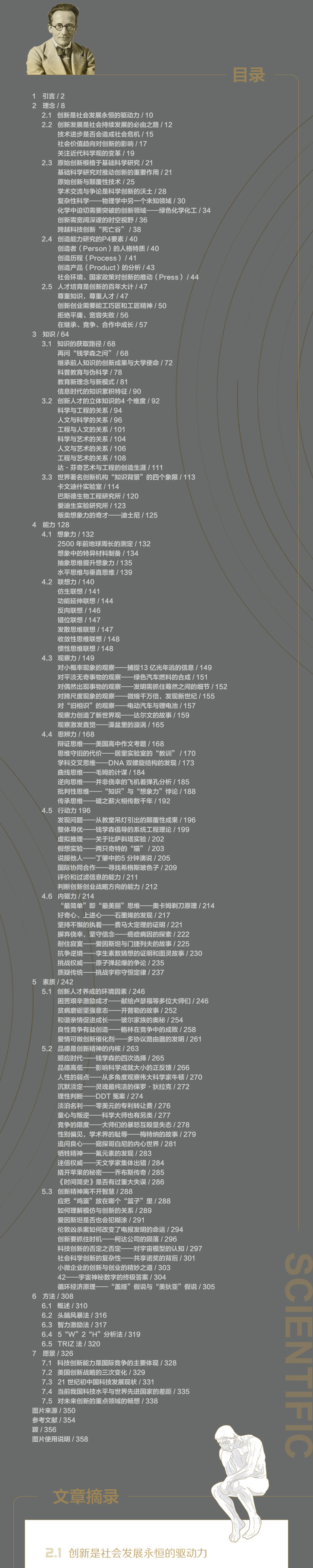 目录 1 引言 2 2 理念 8 2.1 创新是社会发展永恒的驱动力 10 2.2 创新发展是社会持续发展的必由之路 12 技术进步是否会造成社会危机 15 社会价值趋向对创新的影响 17 关注近代科学观的变革 19 2.3 原始创新根植于基础科学研究 21 基础科学研究对推动创新的重要作用 21 原始创新与颠覆性技术 25 学术交流与争论是科学创新的沃土 28 2.4 创造能力研究的P4要素 40 创造者(Person)的人格特质 40 创造历程(Process) 41 创造产品(Product)的分析 43 社会环境、国家政策对创新的推动(Press) 44 2.5 人才培育是创新的百年大计 47 尊重知识,尊重人才 47 创新创业需要能工巧匠和工匠精神 50 拒绝平庸、宽容失败 56 在继承、竞争、合作中成长 57 3 知识 64 3.1 知识的获取路径 68 再问“钱学森之问” 68 继承前人知识的创新成果与大学使命 72 科普教育与伪科学 78 教育新理念与新模式 81 信息时代的知识累积特征 90 3.2 创新人才的立体知识的4个维度 92 科学与工程的关系 94 人文与科学的关系 96 工程与人文的关系 101 3.3 世界著名创新机构“知识背景”的四个象限 113 卡文迪什实验室 114 巴斯德生物工程研究所 120 爱迪生实验研究所 123 贩卖想象力的奇才——迪士尼 125 4 能力 128 4.1 想象力 132 2500年前地球周长的测定 132 想象中的特异材料制备 134 抽象思维提升想象力 135 水平思维与垂直思维 139 4.2 联想力 140 仿生联想 141 功能延伸联想 144 4.3 观察力 149 对小概率现象的观察——捕捉13亿光年远的信息 149 对平淡无奇事物的观察——绿色汽车燃料的合成 151 对偶然出现事物的观察——发明需抓住蓦然之间的细节 152 4.4 思辨力 168 辩证思维——美国高中作文考题 168 思维守旧的代价——居里实验室的“教训” 170 学科交叉思维——DNA双螺旋结构的发现 173 4.5 行动力 196 发现问题——从教堂吊灯引出的颠覆性成果 196 整体寻优——钱学森倡导的系统工程理论 199 4.6 内驱力 214 5.1 创新人才养成的环境因素 246 5.2 品德是创新精神的内核 263 顺应时代——钱学森的四次选择 265 品德高低——影响科学成就大小的正反馈 266 人性的弱点——从多角度观察伟大科学家牛顿 270 沉默淡定——灵魂最纯洁的保罗·狄拉克 272 理性判断——DDT冤案 274 5.3 创新精神离不开智慧 288 42——宇宙神秘数字的终极答案 304 循环经济原理——“盖娅”假说与“美狄亚”假说 305 6 方法 308 6.1 概述 310 6.2 头脑风暴法 316 6.3 智力激励法 317 6.4 5“W”2“H”分析法 319 6.5 TRIZ法 320 7 愿景 326 图片来源 350 参考文献 354 跋 356 图片使用说明 358 |