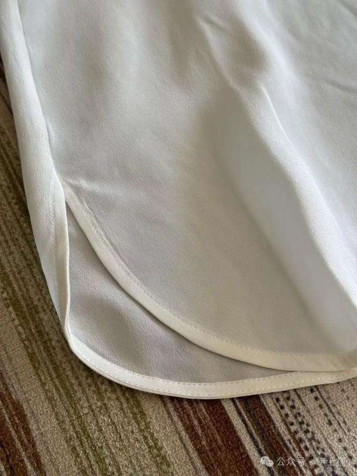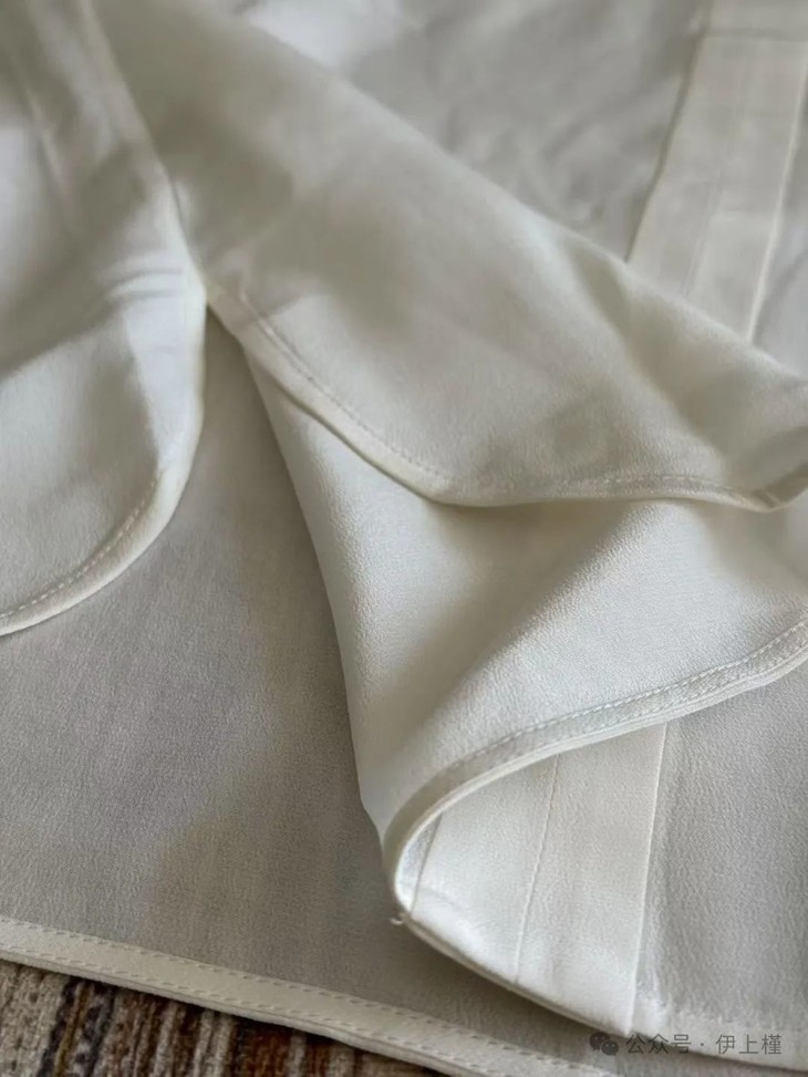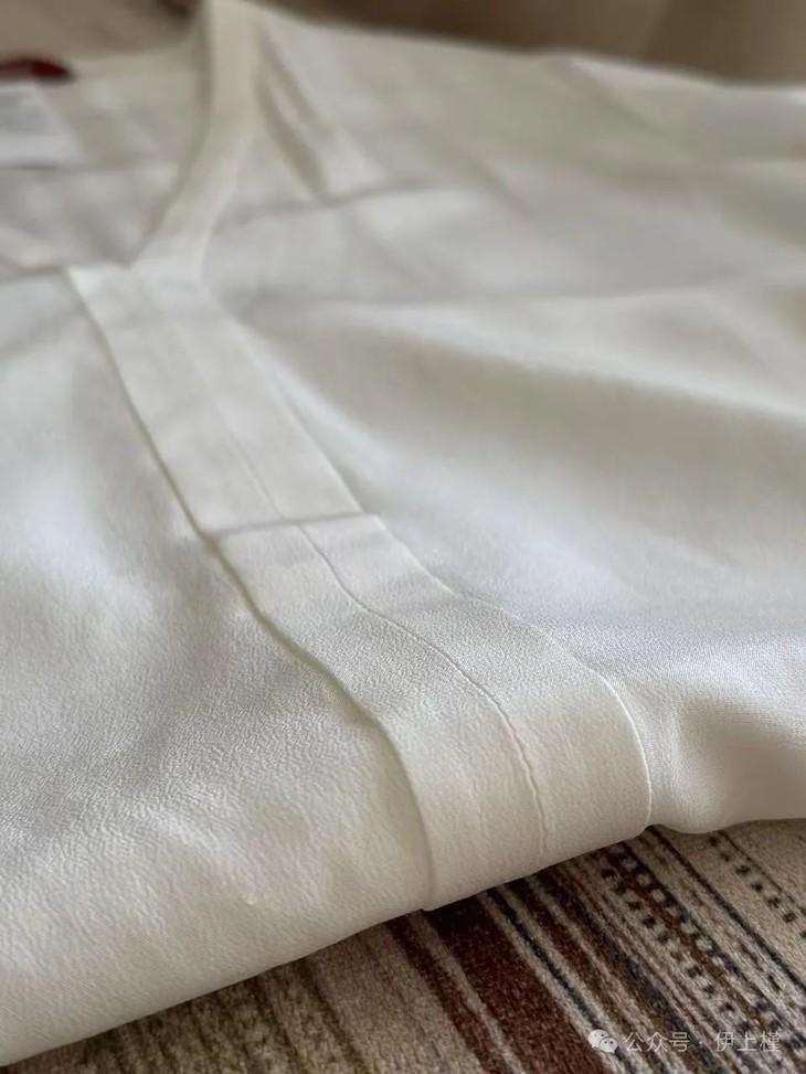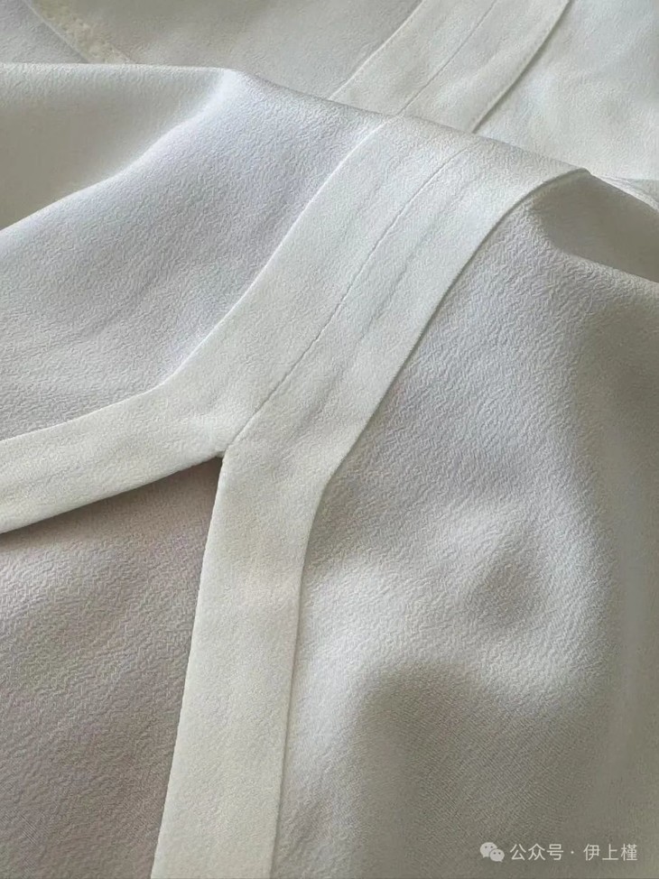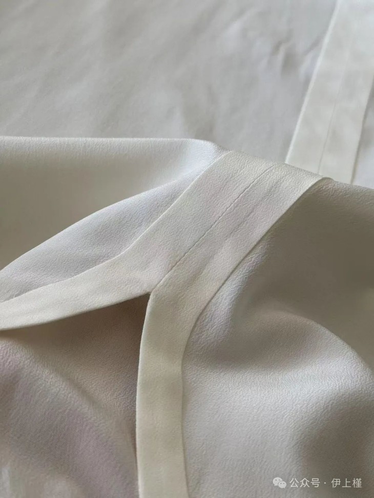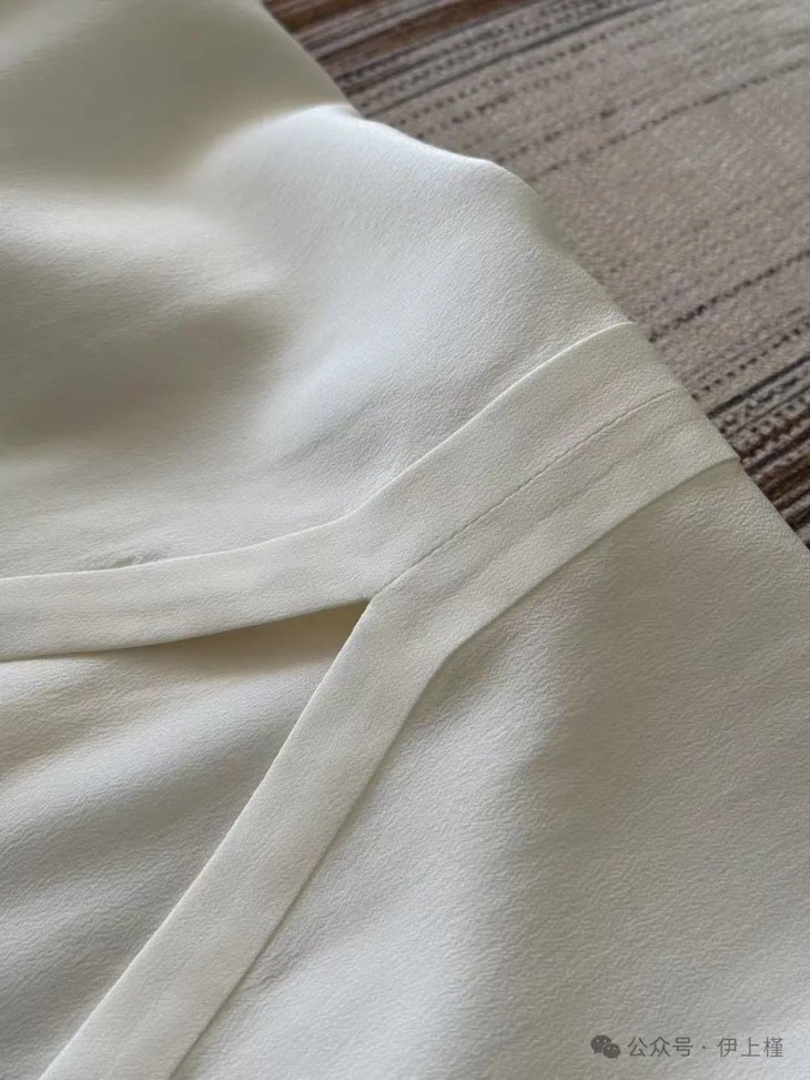 看似简洁的一款,实则非常重工,门襟里外均为手工隐形扦边,要把娇贵的真丝制作出如此笔直周正的门襟线,非常考验师傅的手工水准,只有代工老师傅才可以达成的水准,拍了很多特写你们仔细看。