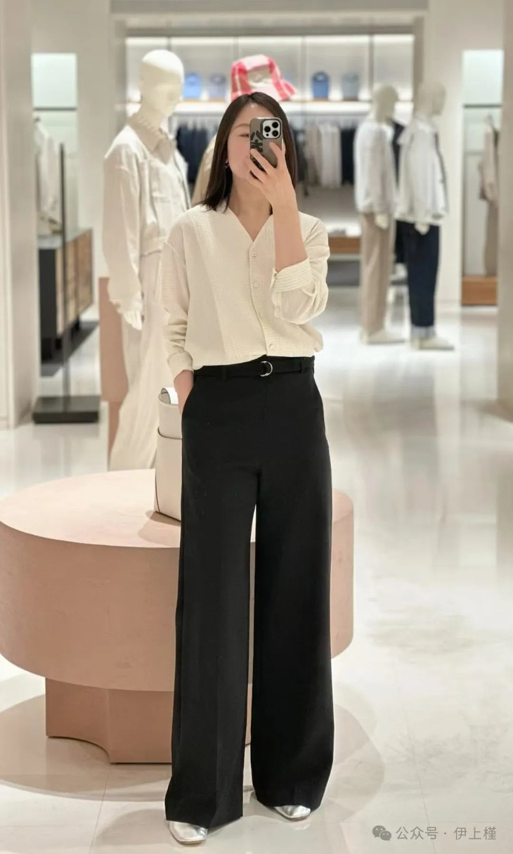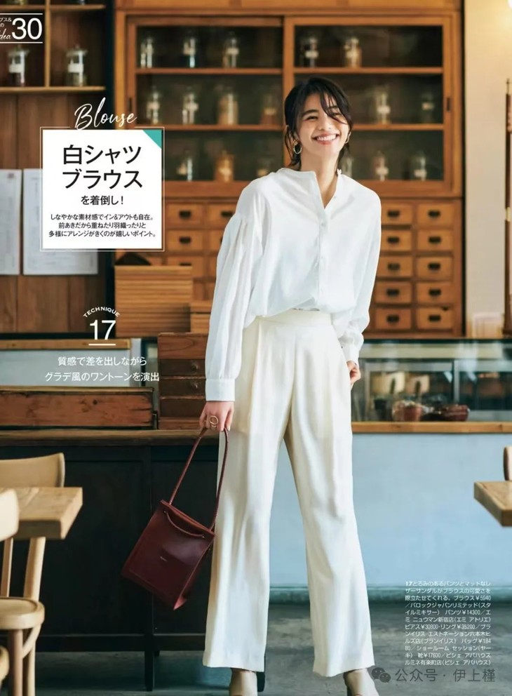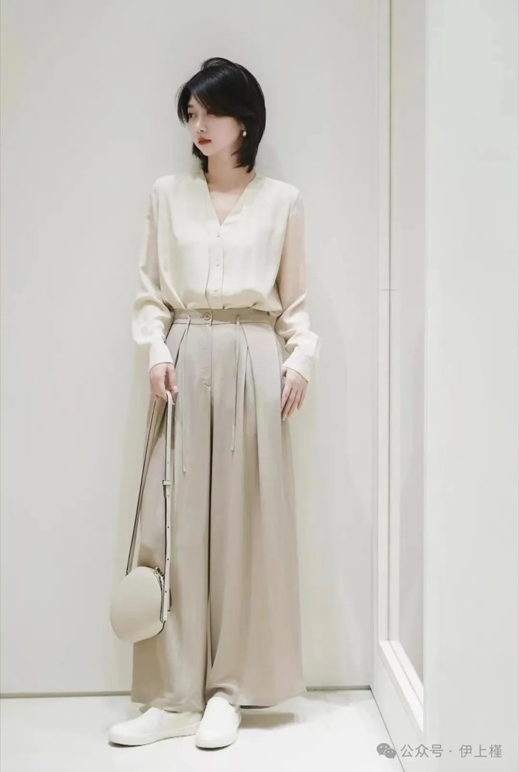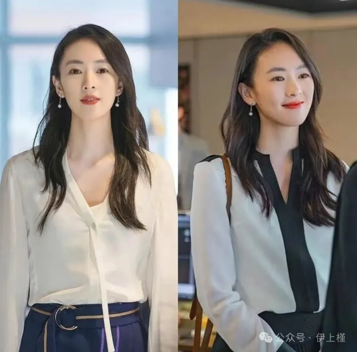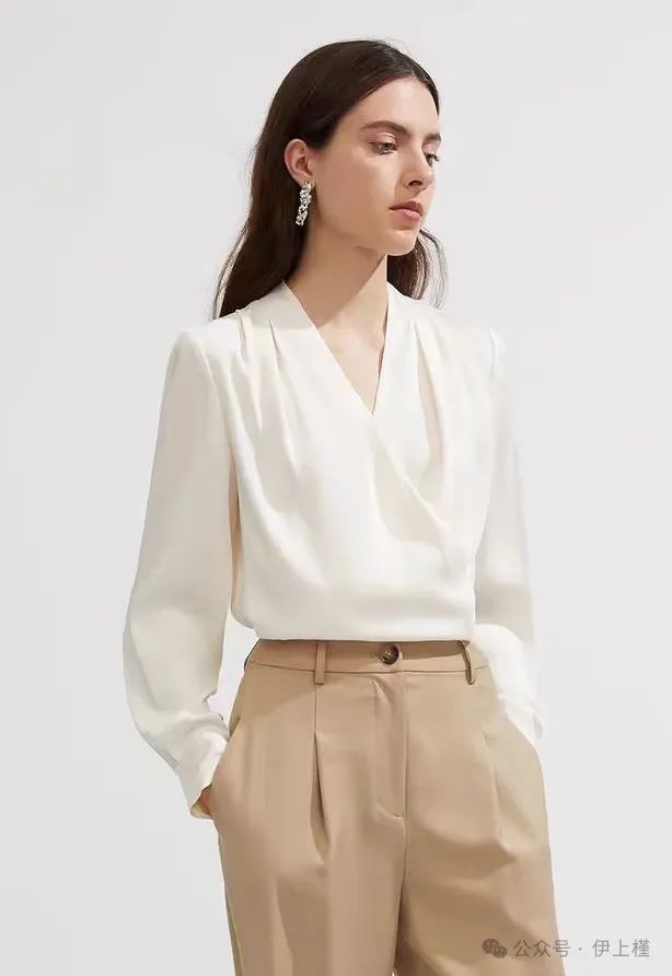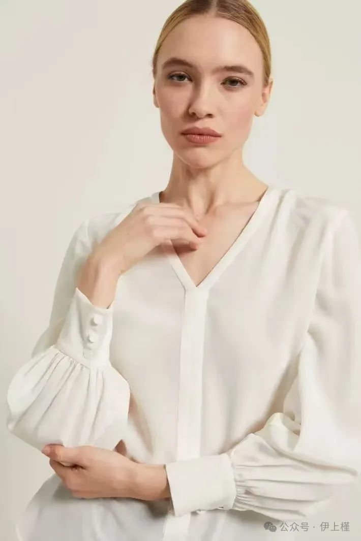 V领衬衫完美诠释了“知性是最高级的性感”,妥妥“贵气而不妈味”的模板,参考下类似衬衫的感觉: