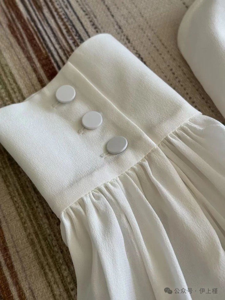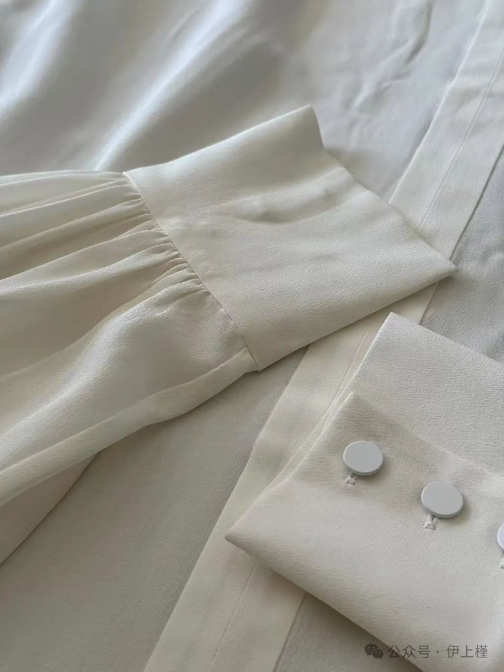 衣摆两侧弧形开叉,内侧筋骨镶边,袖子重工打褶,细密的褶皱袖管如文艺复兴画卷中走出的建筑廓形,抬手间自带大女主BGM,既能藏住拜拜肉,又能用立体褶皱演绎温柔的力量感。