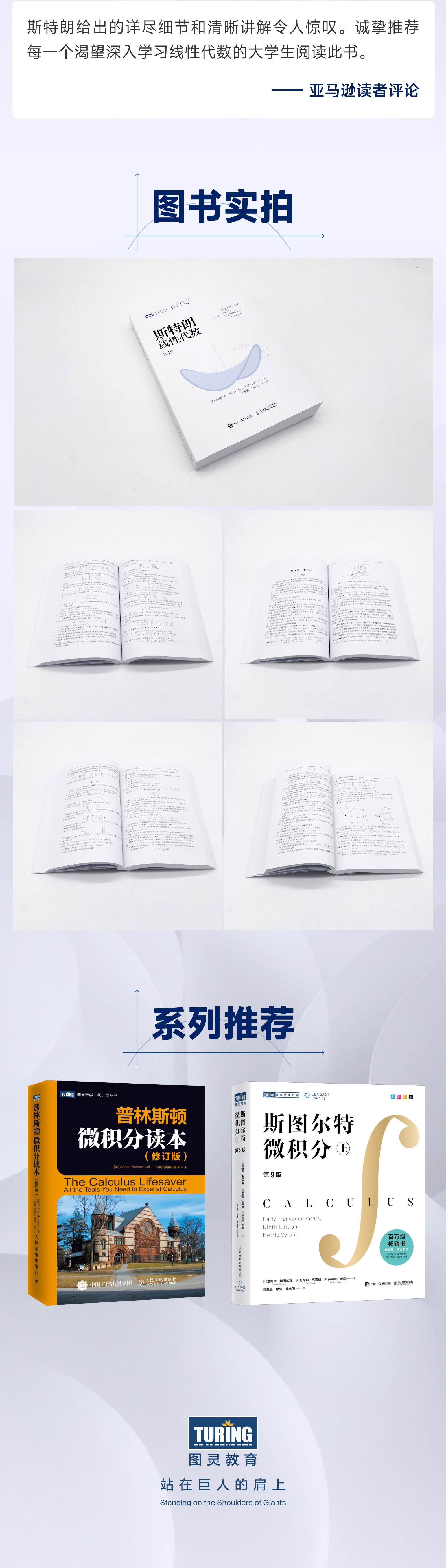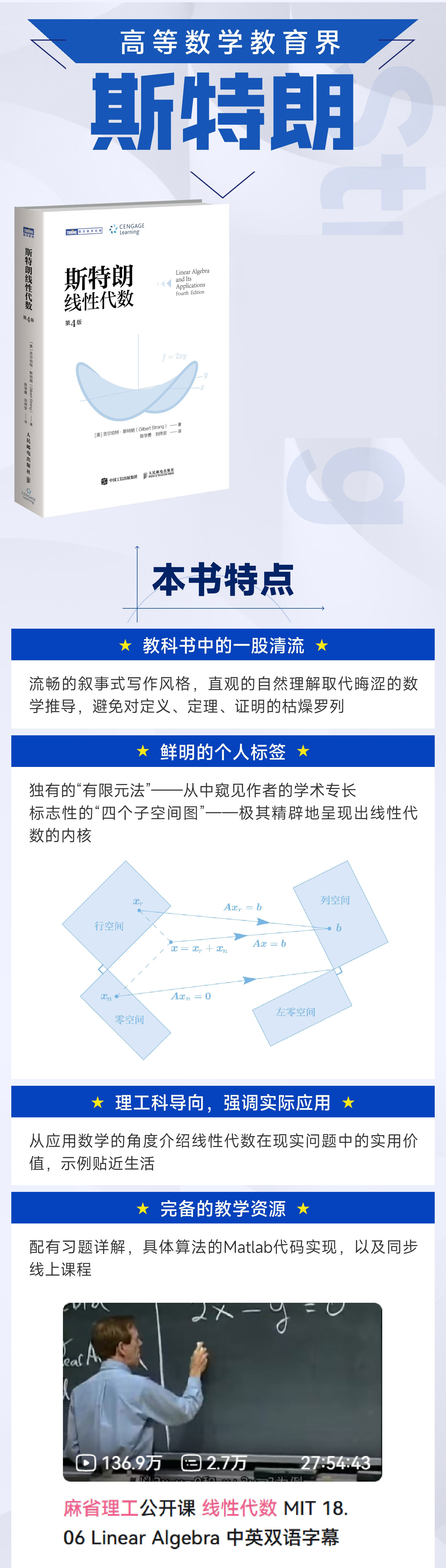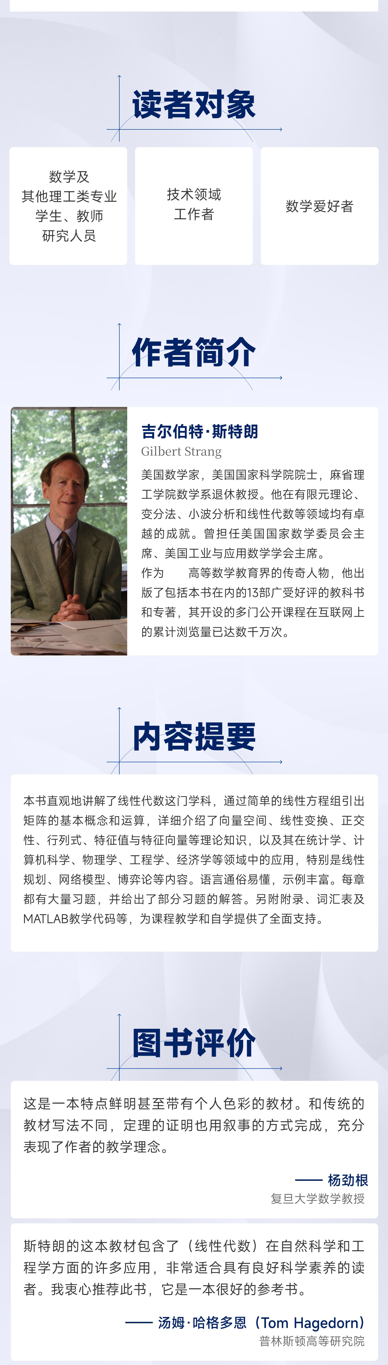 吉尔伯特·斯特朗(Gilbert Strang),美国数学家,美国国家科学院院士,麻省理工学院数学系退休教授。他在有限元理论、变分法、小波分析和线性代数等领域均有*的成*。曾担任美国国家数学委员会主席、美国工业与应用数学学会主席。 作为全球高等数学教育界的传奇人物,他出版了包括本书在内的13部广受好评的教科书和专著,其开设的多门公开课程在互联网上的累计浏览量已达数千万次。