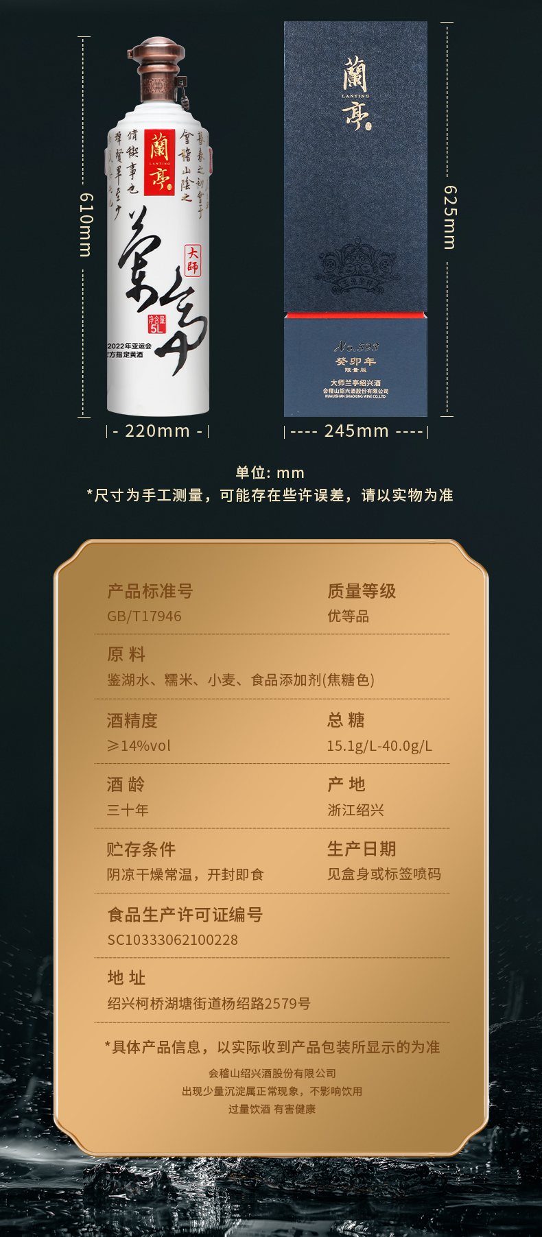 会稽山官旗 绍兴黄酒糯米酒大师兰亭30年陈5L花雕酒加饭酒送礼宴会