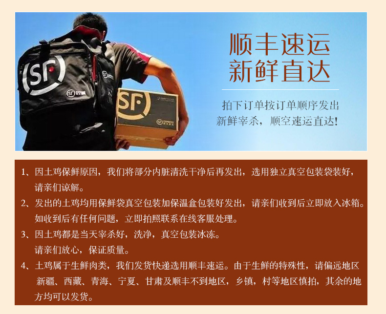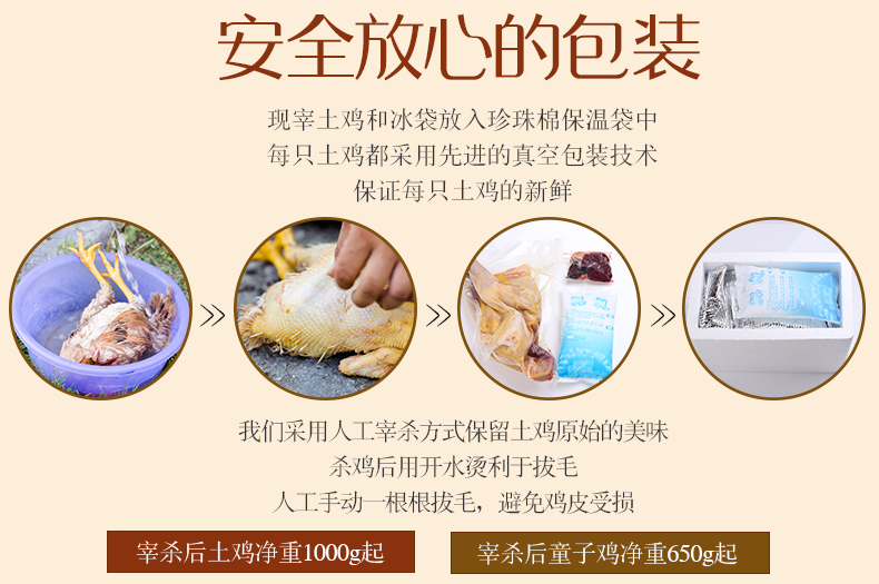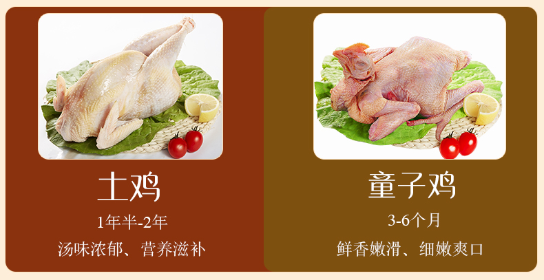 【产品规格】 童子鸡450g 老母鸡700g(每箱都是独立的包装,如购买多件分多个包裹发出,可能会前后陆续到货)。