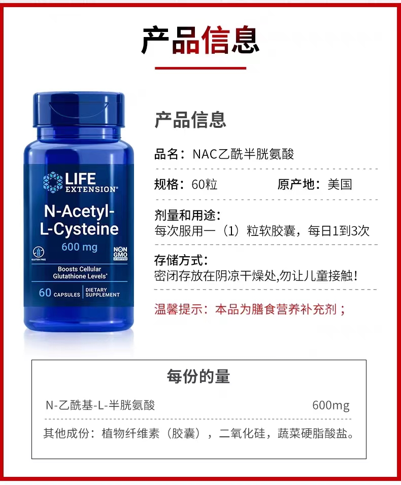 【香港直邮】沿寿LIFE EXTENSION N-Acetyl-L-Cysteine 600mg(沿寿·乙酰半胱氨酸)60粒