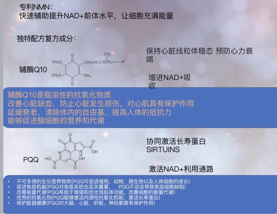 nmn+Q10+PQQ抗衰老的同时Q10能够保护心脏、PQQ能够全身抗炎、抗氧化(PQQ抗氧化能力是维C的5000倍)、增强细胞线粒体功能、促进脑力、保护肝脏(PQQ效果比水飞蓟素效果更好)。