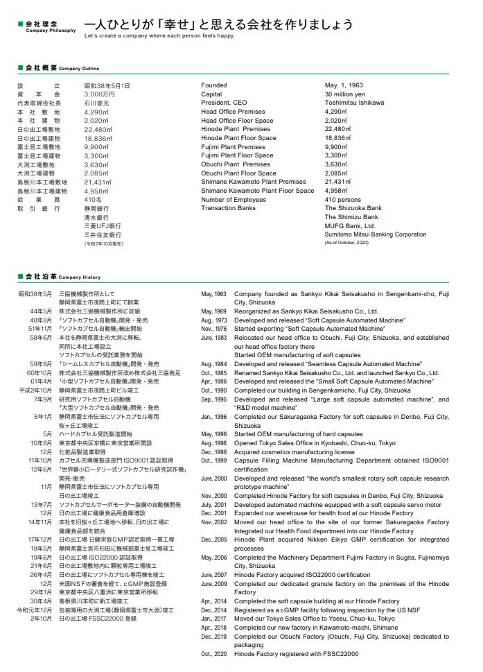 跨越半个世纪与大家一起完成健康食品制造的责任,公司理念:一人ひとりが幸 せと思える会 社 づくり,