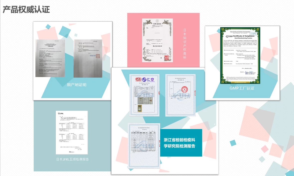 工厂Gmp、日本原产地证明、商标证书、以及浙江健康检疫科学院的检测报告