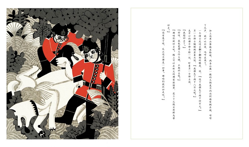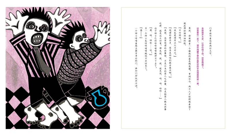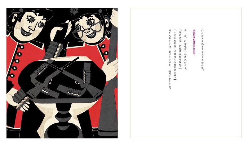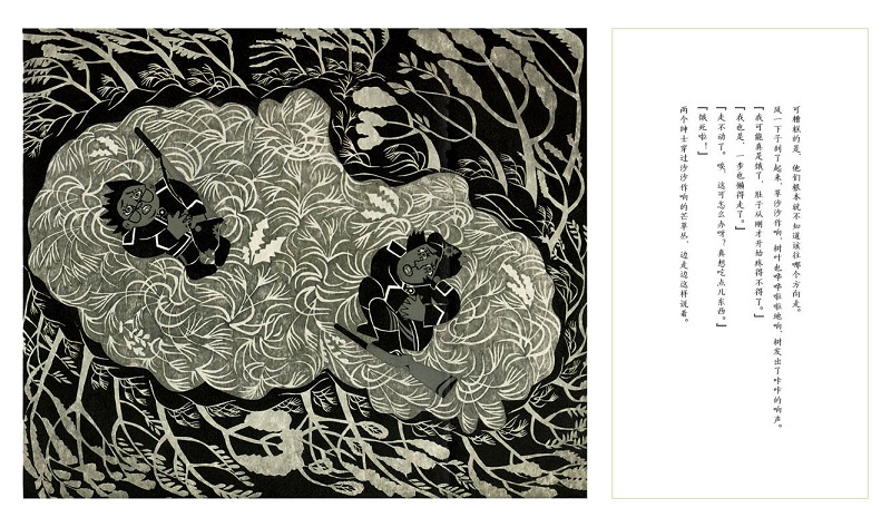 岛田老师擅长木版画,木版画的肌理暗示这是一个发生在森林里的事件,其配色虽不如油画、水彩画那样吸引眼球,但纯正、不张扬的天然色反而为这个荒诞事件增添了许多神秘色彩。