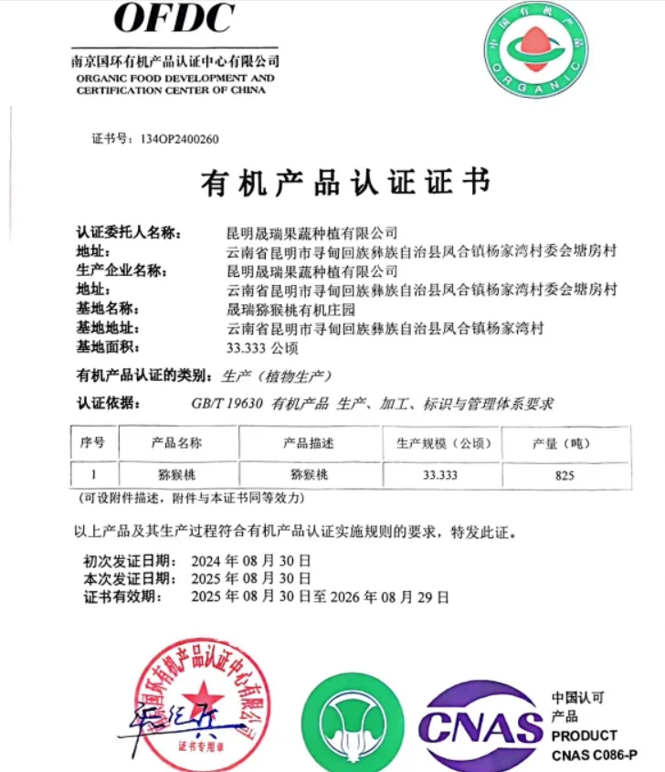 2.严格按照GAP、有机标准种植生产,严禁使用激素类农药、激素类化肥、催熟剂、膨大剂、甜蜜素、除草剂,2018年至今被认定为“中国良好农业规范(GAP)”一级认证,2019年至今成功获得“有机认证转换证书”,2022年正式获得有机认证。