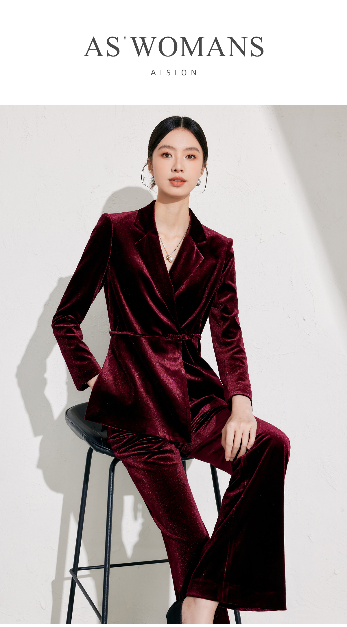 艾尚臣酒红丝绒西装外套女秋冬季显瘦修身新款高级感年会西服套装