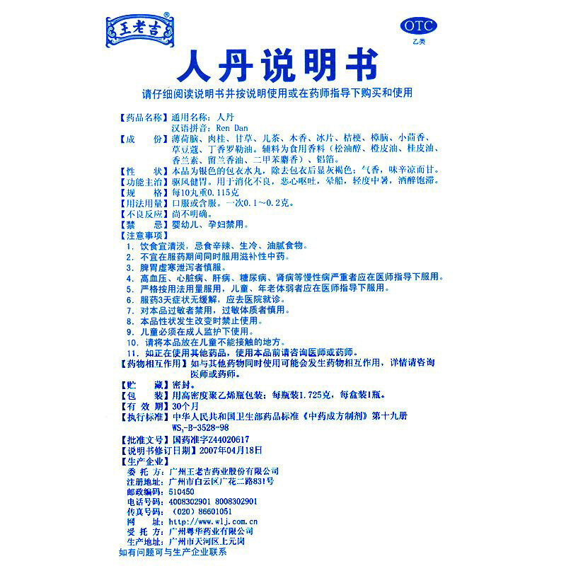 王老吉人丹1.725g驱风健胃用于消化不良恶心呕吐晕船轻度中暑