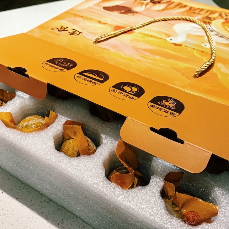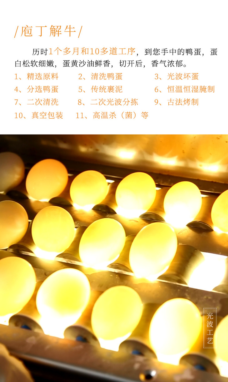 蟹皇蛋用的是来自八里河的麻鸭蛋。这里的麻鸭依地而食,滞留在浅滩上的鱼虾蟹是麻鸭天然的食材,所以产出的麻鸭蛋黄绵密橙黄、蛋清浓稠。再使用古法红泥腌制足足45天,最后由人工一枚一枚用专用光源检查,将不符合要求的鸭蛋全部㓭除,经过至少5次筛选后,符合要求的烤鸭蛋才被单独真空塑封,送到我们面前!看了一下配料表,也是很简单,只有鸭蛋+盐+水,安全程度通过了权威部门的各项检验,老人、孩子都可以食用。