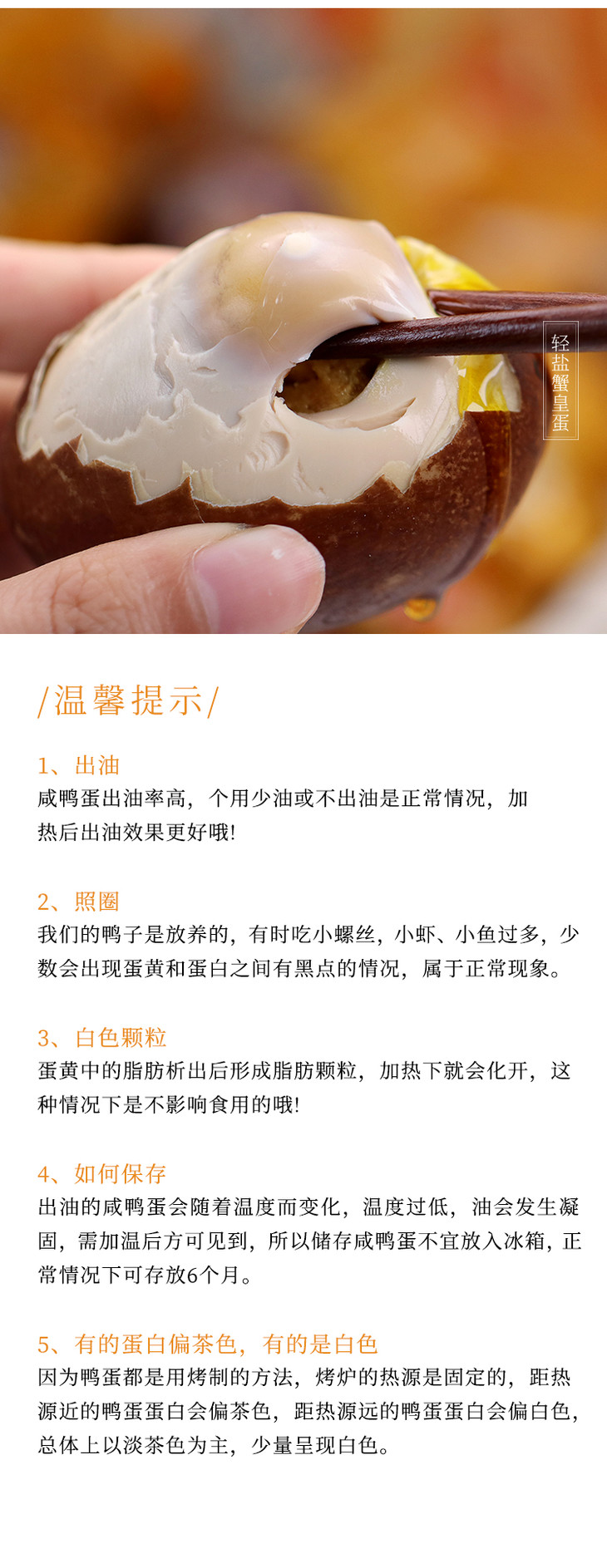 蟹皇蛋真的是超多油,我每次剥蛋都流到满手都是,各种乱滴,后来我都是直接连壳对切,小勺子一挖,非常完美!真的是极好吃,蟹黄口感的蛋黄、卤蛋味的蛋白,还有茶叶蛋的香气,配粥配饭配蔬菜,都可以,就算单独吃都不会很咸,包装也是不错,送人自己家吃都可!