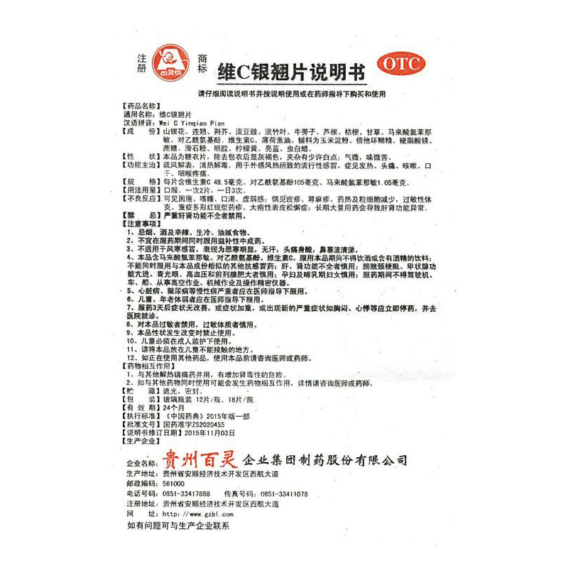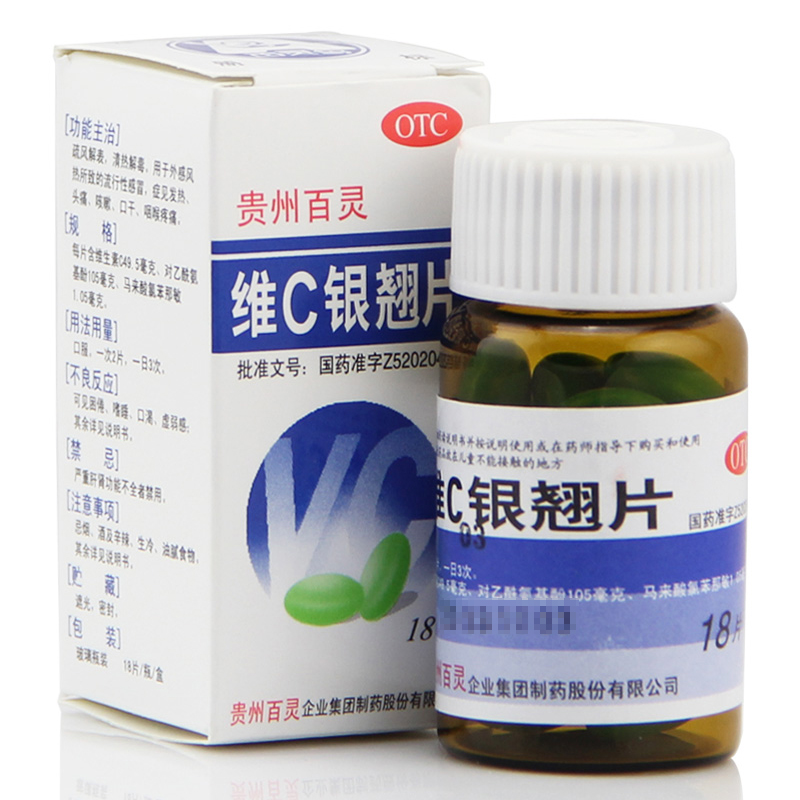 贵州百灵维C银翘片18片/盒清热解毒 感冒药 发热 咳嗽 头痛喉咙痛